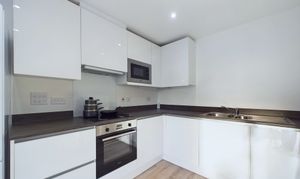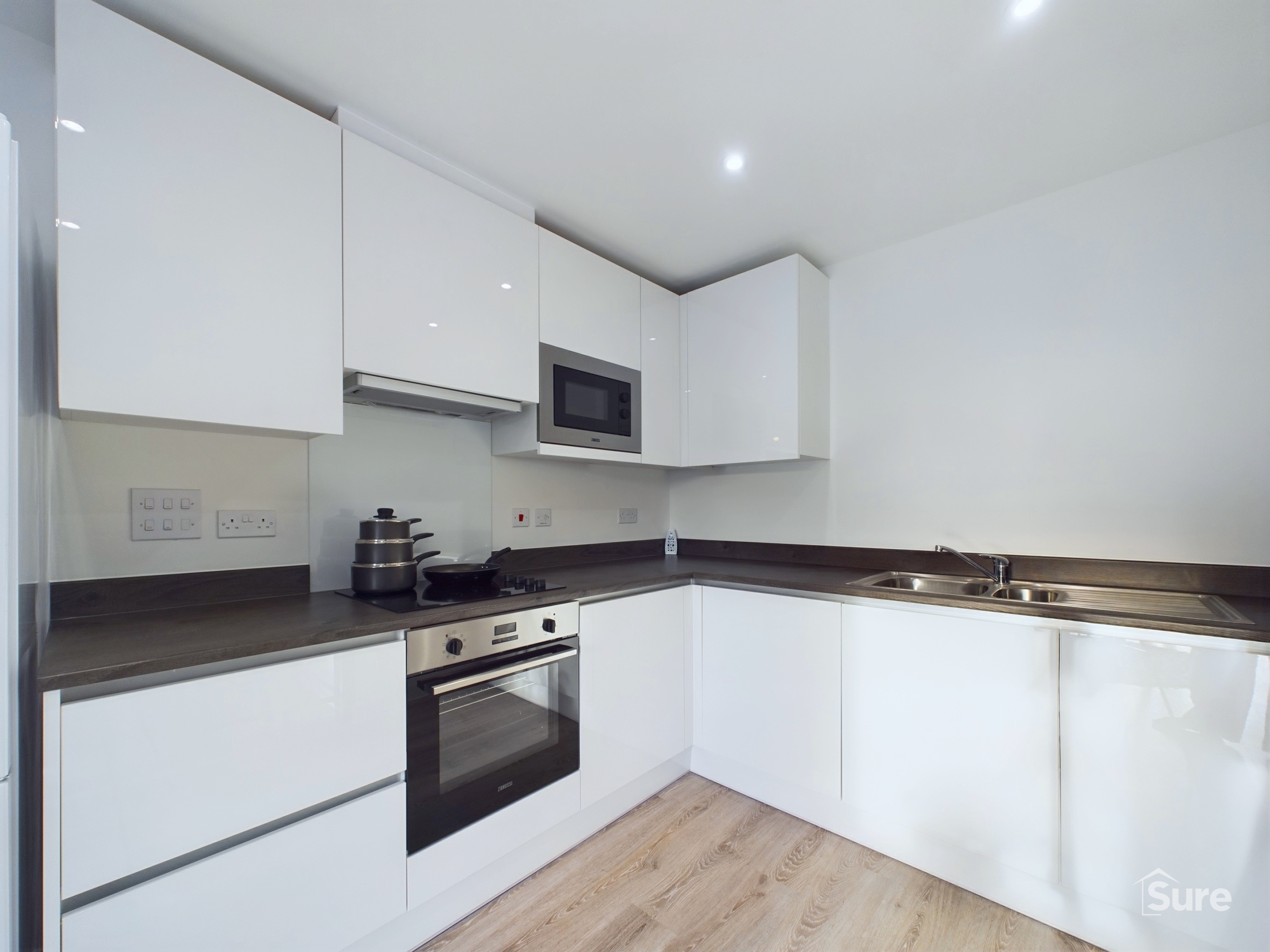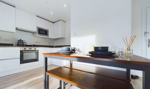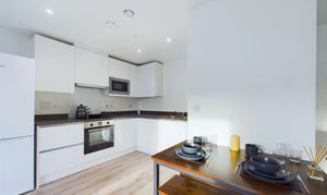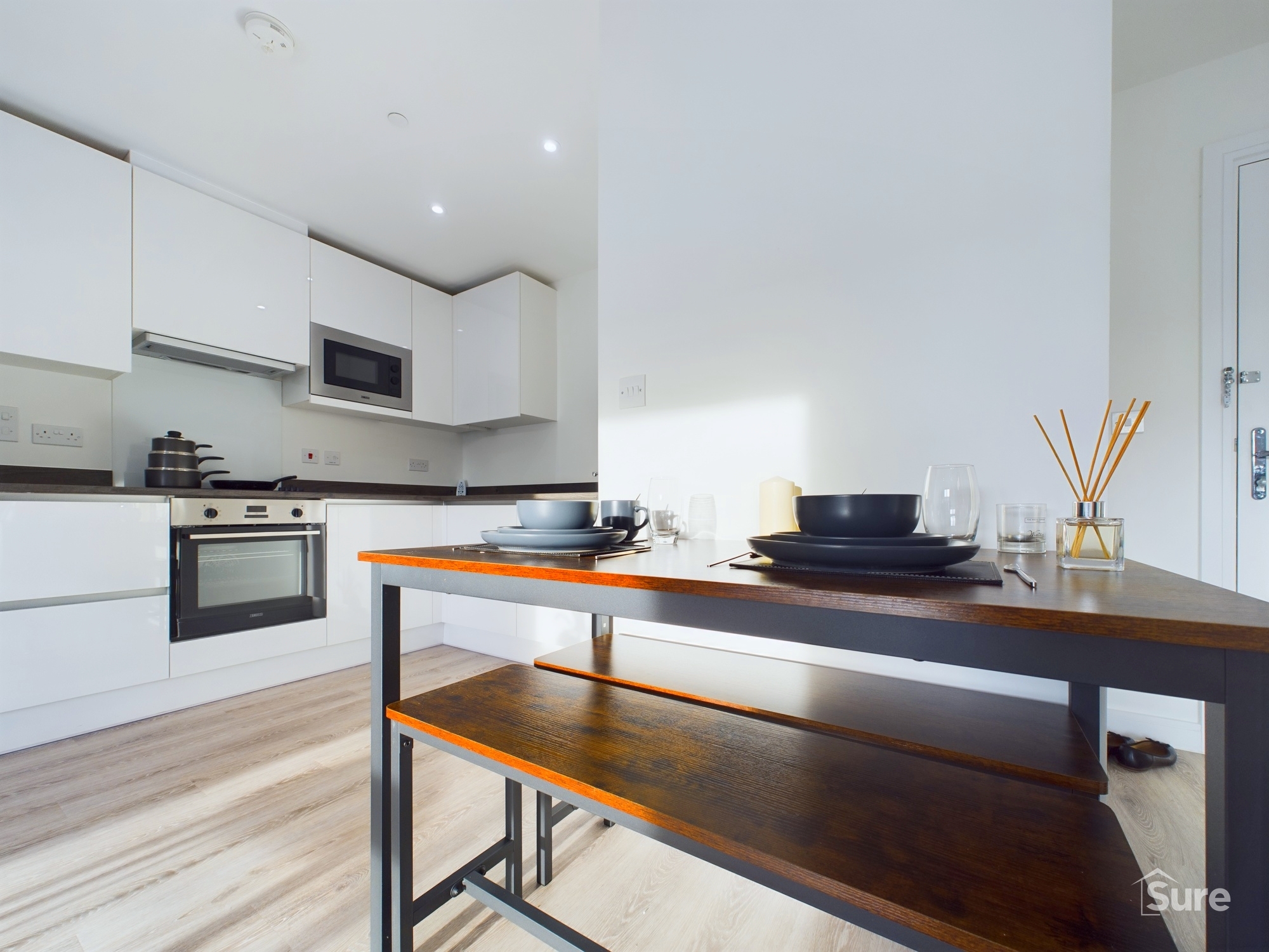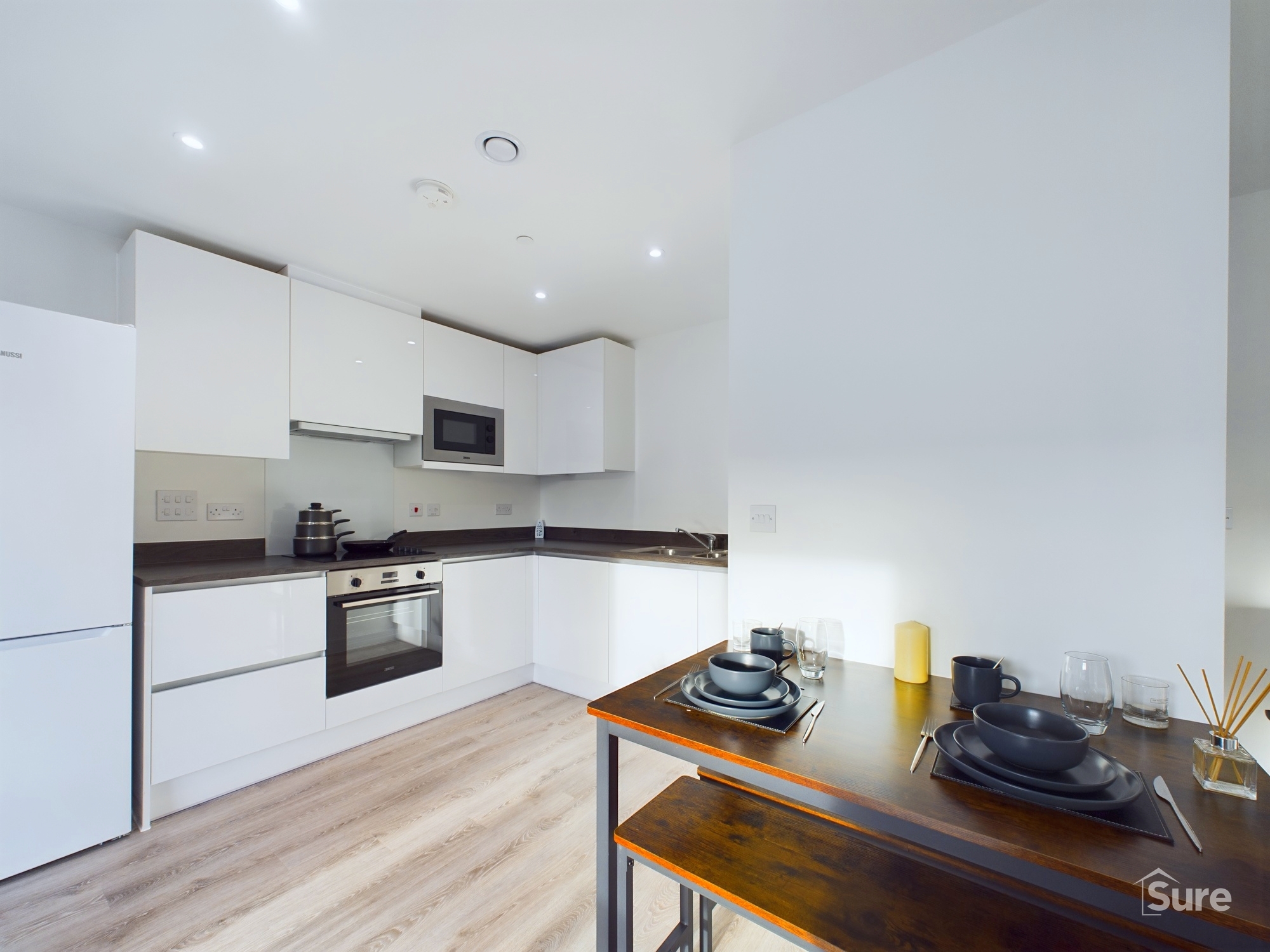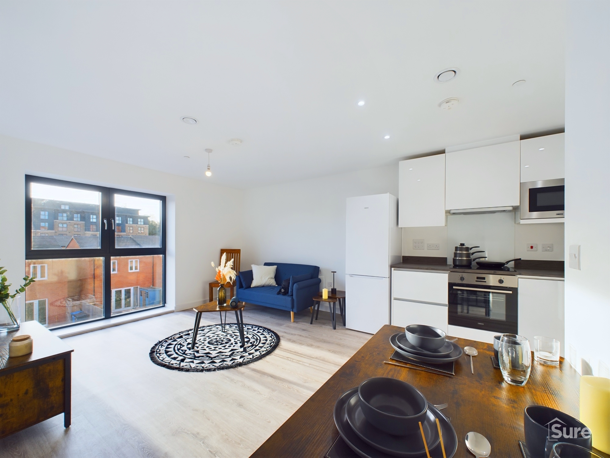 The apartment is accessed via a secure fob-entry system and briefly comprises a welcoming entrance hallway providing access to all rooms. The open-plan living and kitchen area is bright and well-proportioned, offering pleasant views over the communal gardens. This space comes furnished with a sofa, TV stand, and dining table with chairs, creating a comfortable and functional living area. The contemporary kitchen is finished to a high standard and benefits from integrated appliances and ample storage.