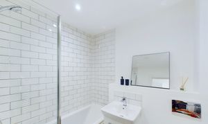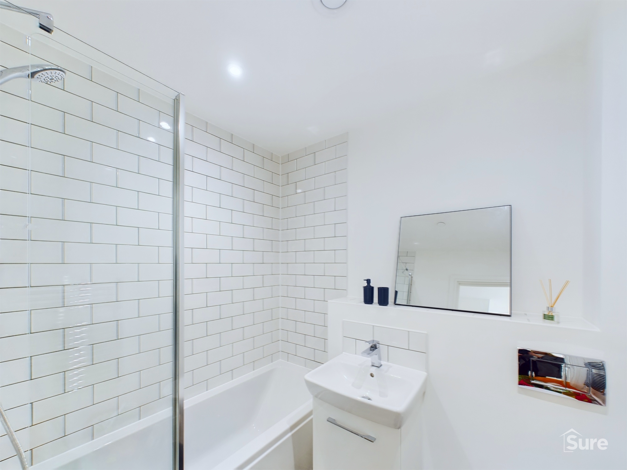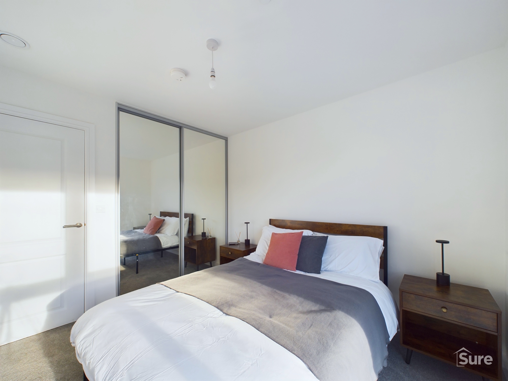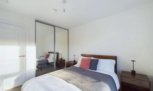 The bedroom is a generous double, complete with a double bed and fitted mirrored wardrobes, offering excellent storage space. The modern bathroom is fitted with a sleek three-piece suite and stylish chrome fittings.