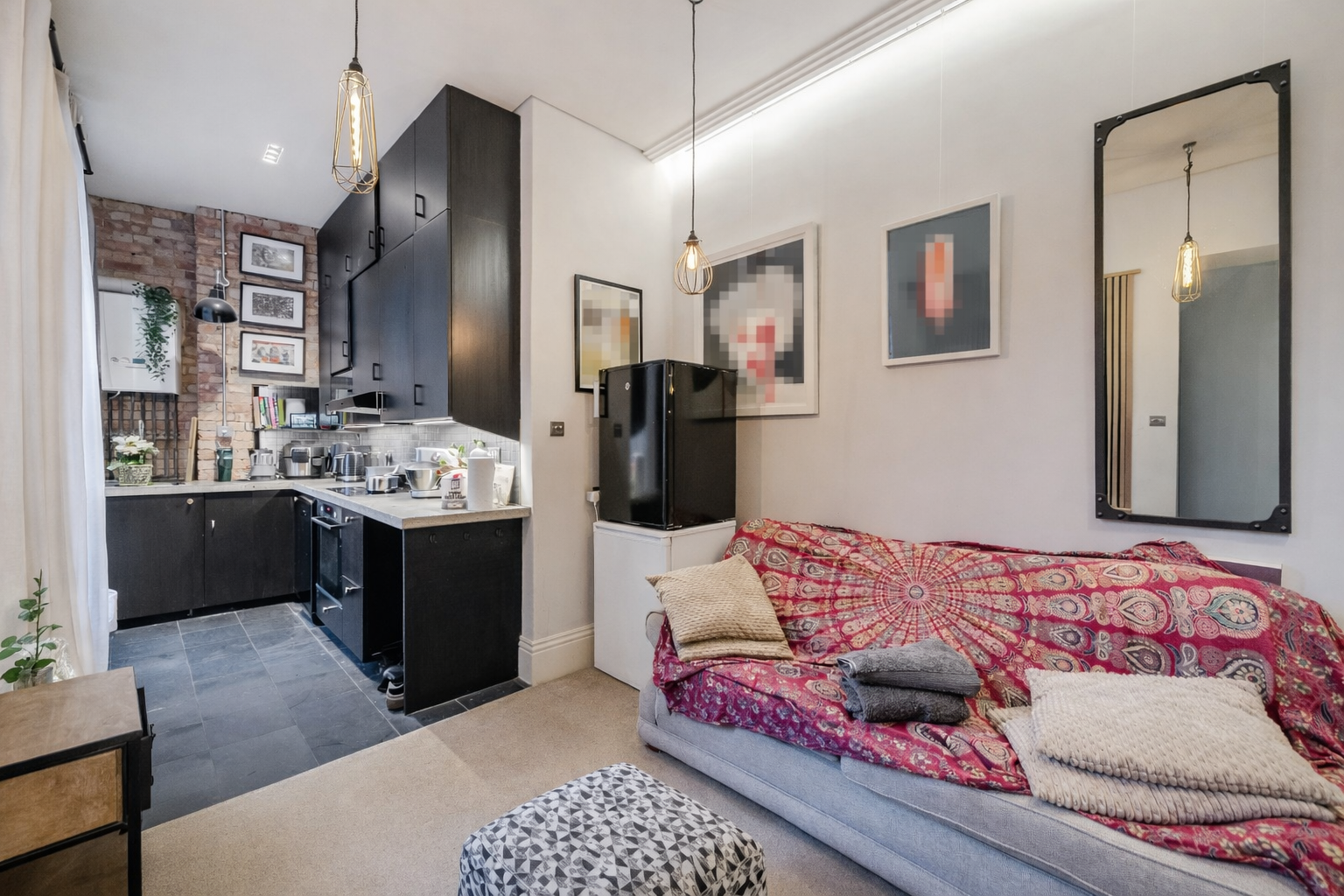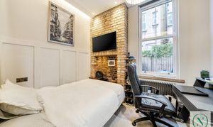Both bedrooms are well designed, with the main bedroom featuring an exposed-brick chimney breast and large sash window, while the second bedroom works perfectly as a guest room or home office. The contemporary bathroom includes classic subway tiling, a rainfall shower and a boutique-style gold-framed mirror.
