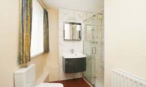Accommodation is split across four levels, including a lower ground-floor lounge and fitted kitchen. The bedrooms are all well-proportioned, with six featuring an en-suite shower room. Two shower rooms service the remaining two bedrooms, ensuring complete flexibility for residents. The property also provides two allocated parking spaces, which is a real bonus in this area.