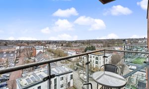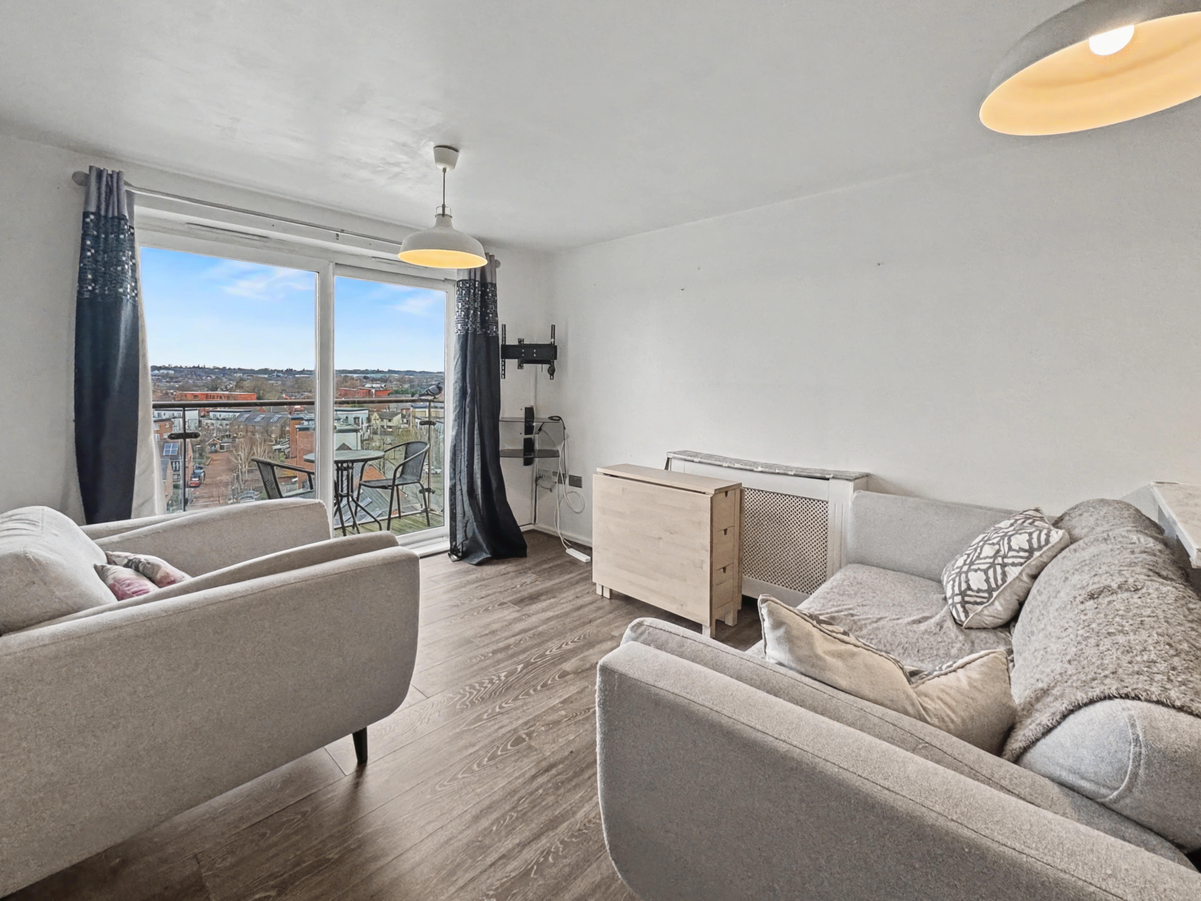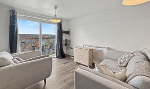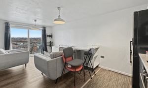 The apartment opens into a bright and generously proportioned open-plan living space, where large windows invite an abundance of natural light and create an immediate sense of space and warmth. A private balcony provides a delightful extension of the living area—ideal for morning coffee, evening relaxation, or entertaining guests while taking in views of the surrounding skyline. The contemporary kitchen is both sleek and practical, offering ample preparation and dining space within a sociable, light-filled layout perfectly suited to modern living.