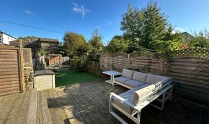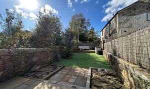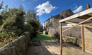 Large space to the rear of the property with decked area, Indian stone paved area, artificial grassed area, fenced boundaries and stone wall boundaries.