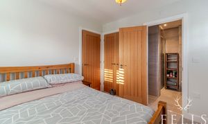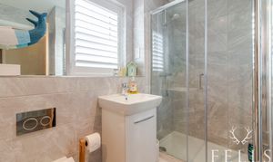 Large bright bedroom with double wardrobe, and ensuite comprising shower with rainfall shower head, WC and handbasin.