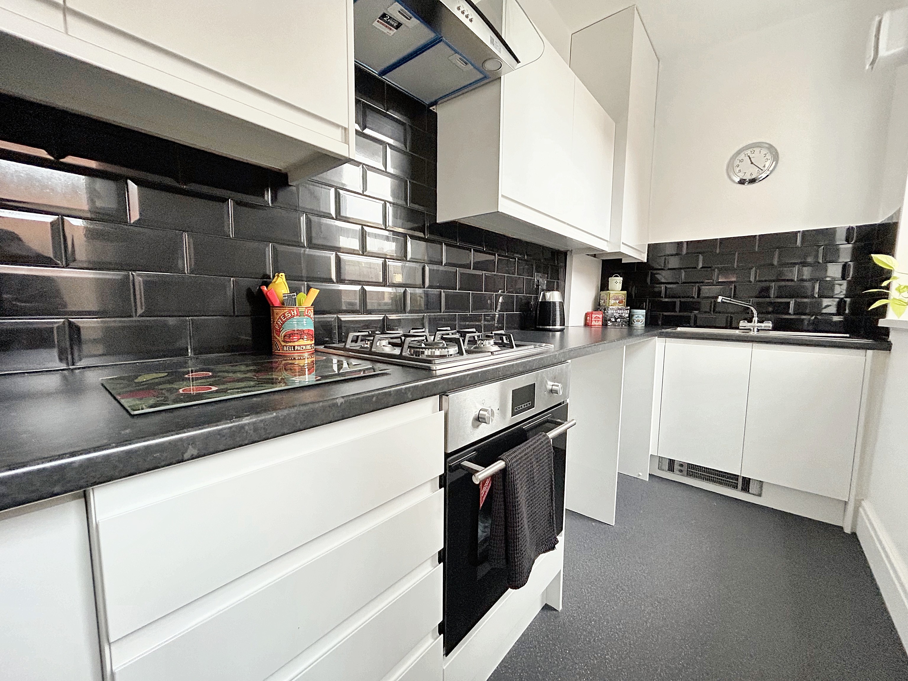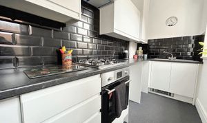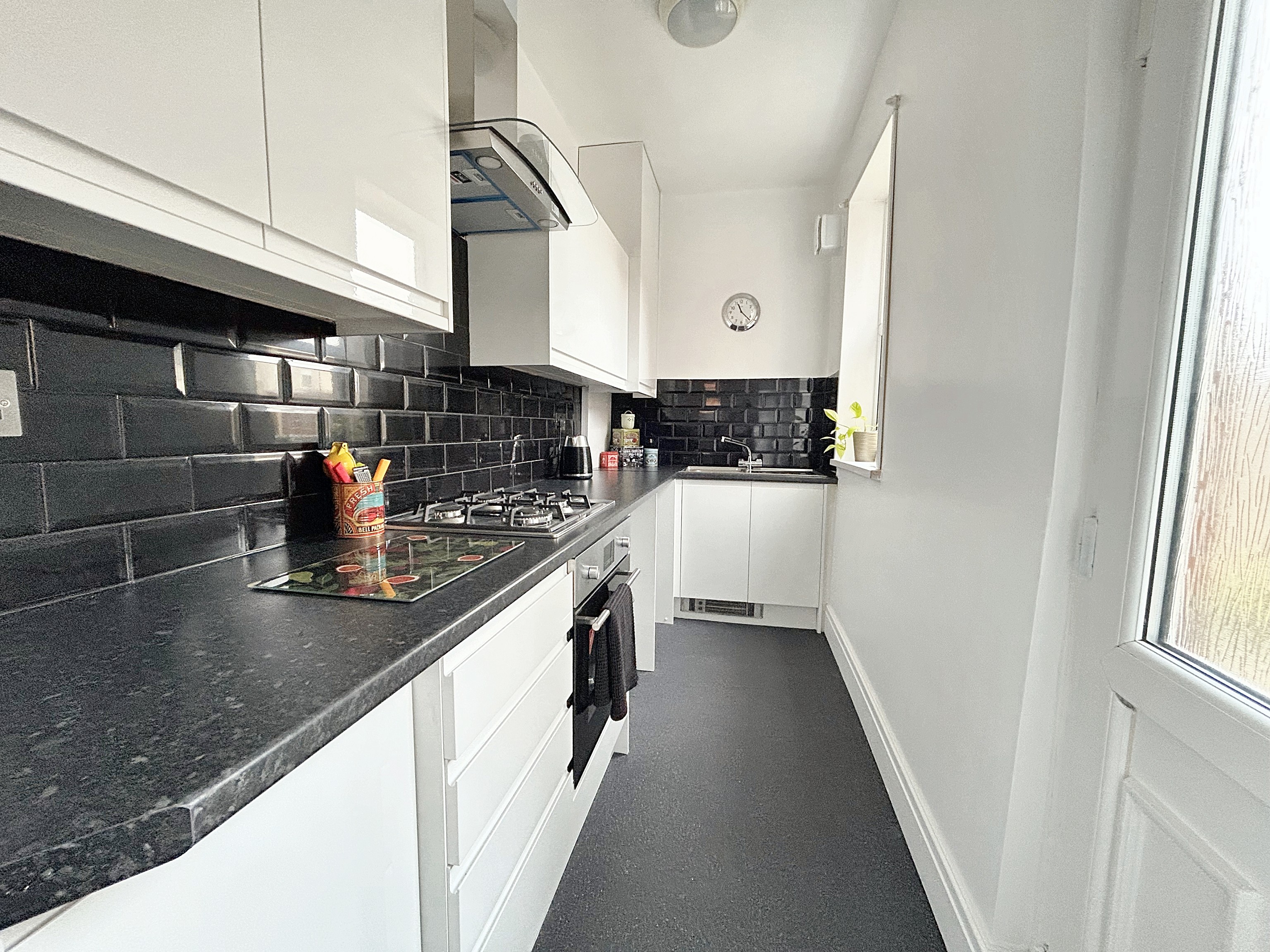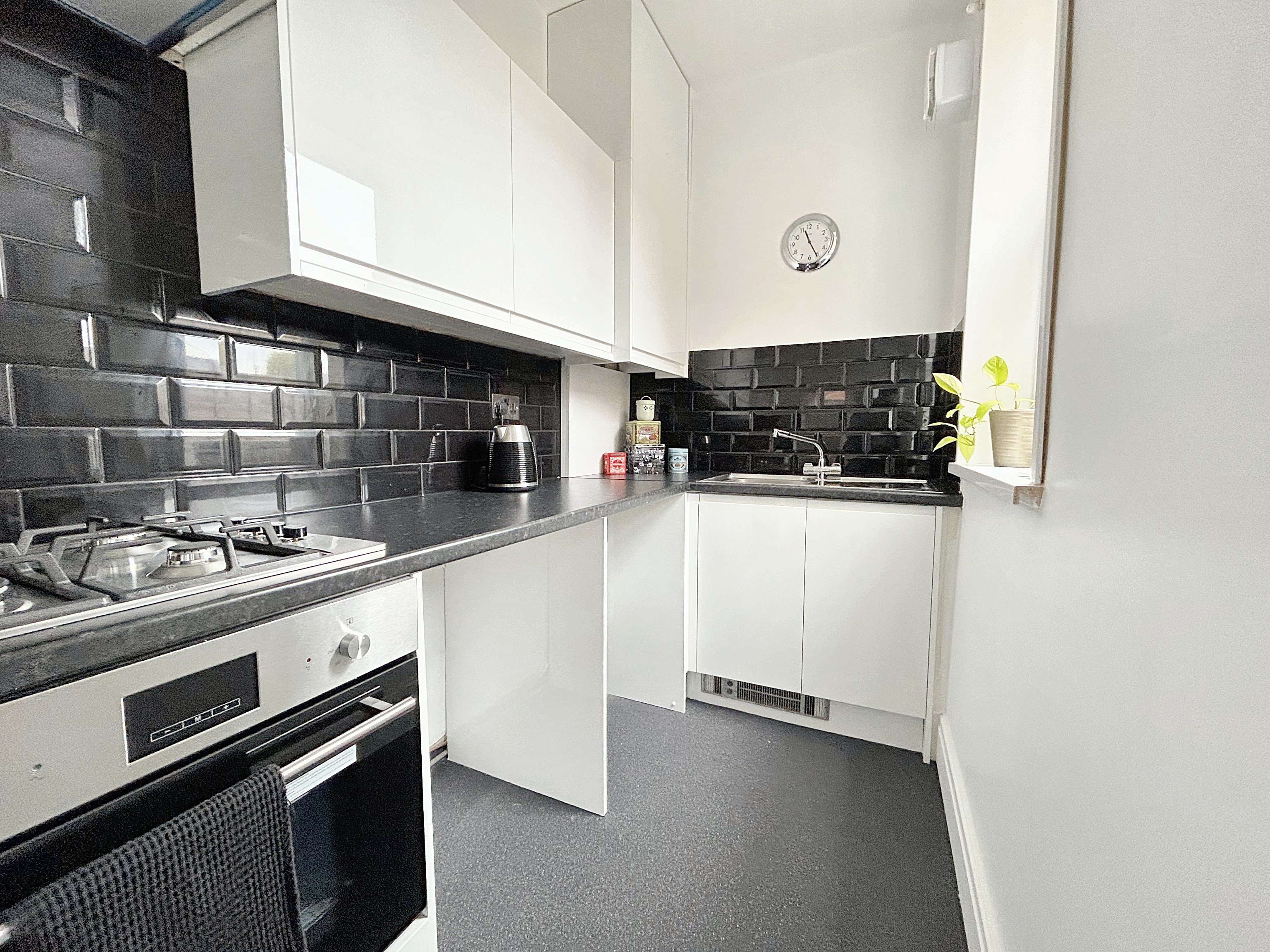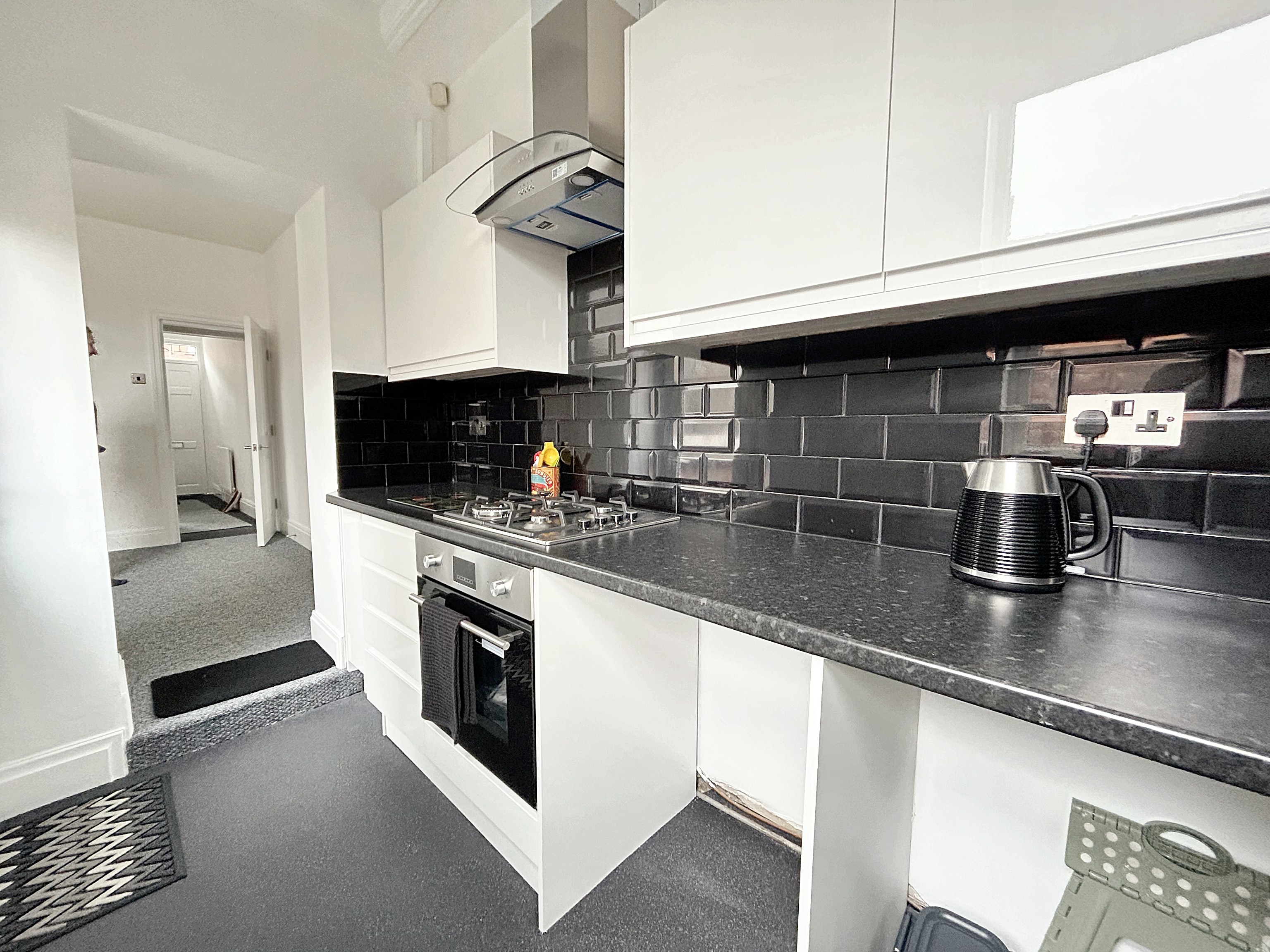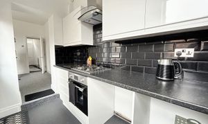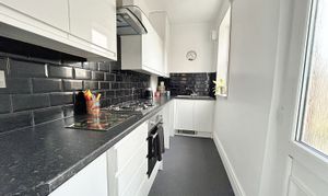 Modern kitchen with wall and base units and drawers, contrasting worktops. Fitted with integrated oven, hob, extractor and sink. There is plumbing for a washer machine and space for a free standing fridge/freezer. Window to the side elevation and an external door leads into the rear garden.