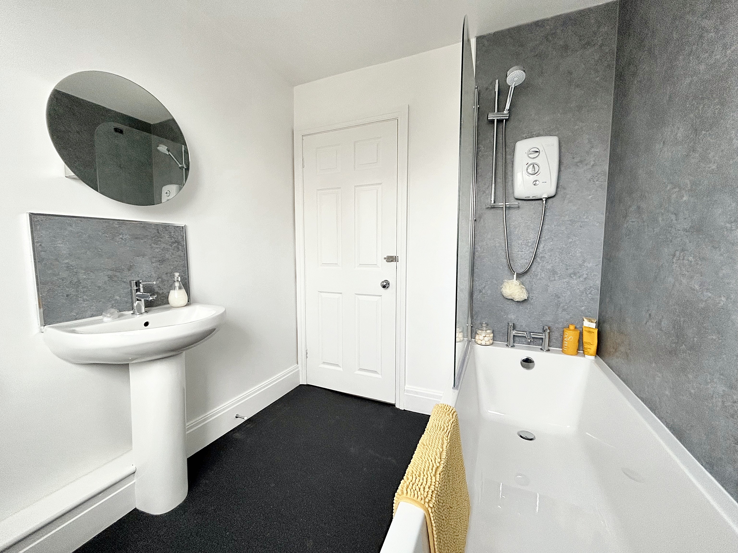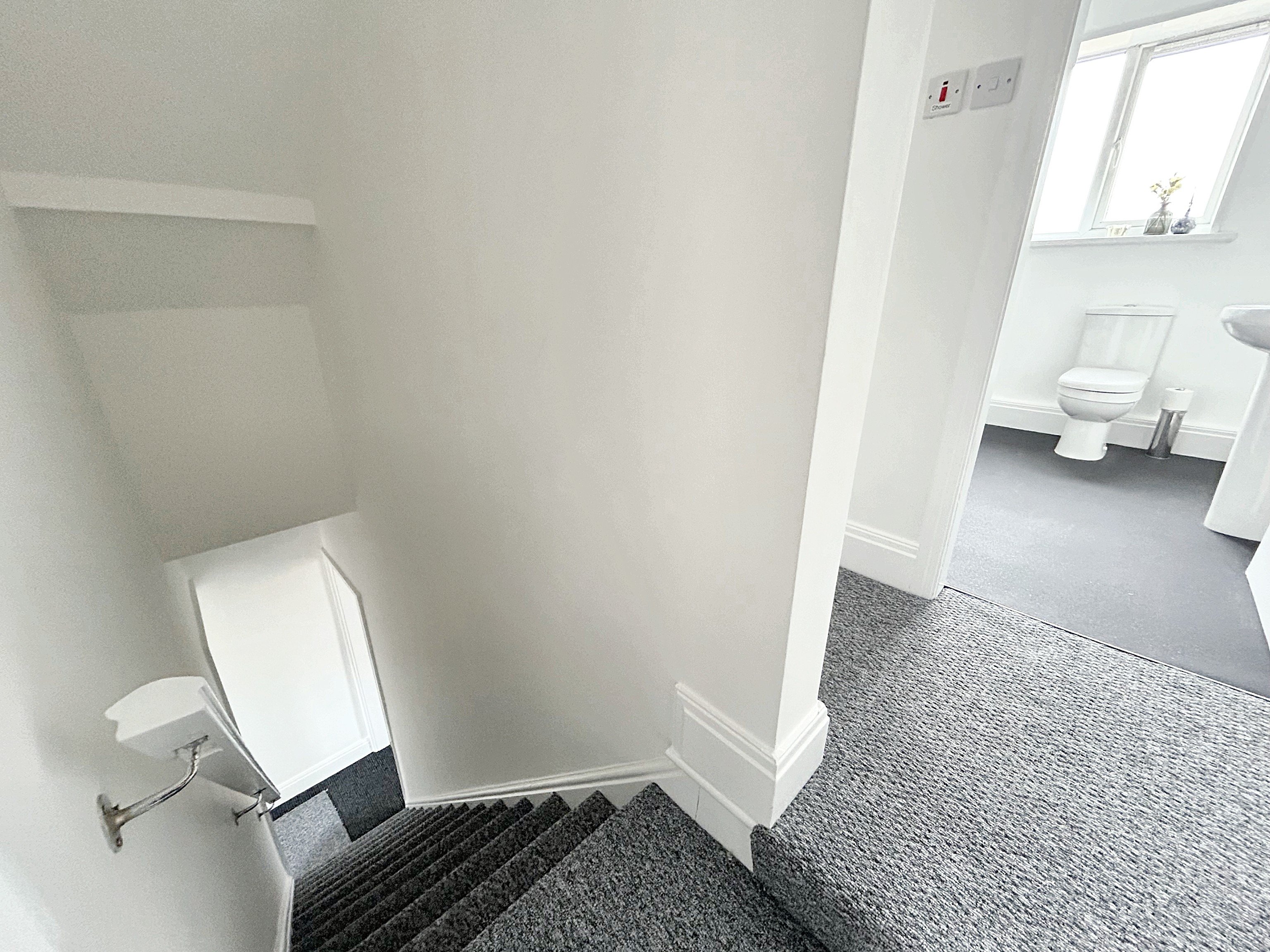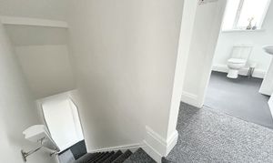 Fitted with a pedestal hand wash basin, low level WC and bath with over head shower. Frosted window to the rear elevation.