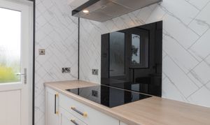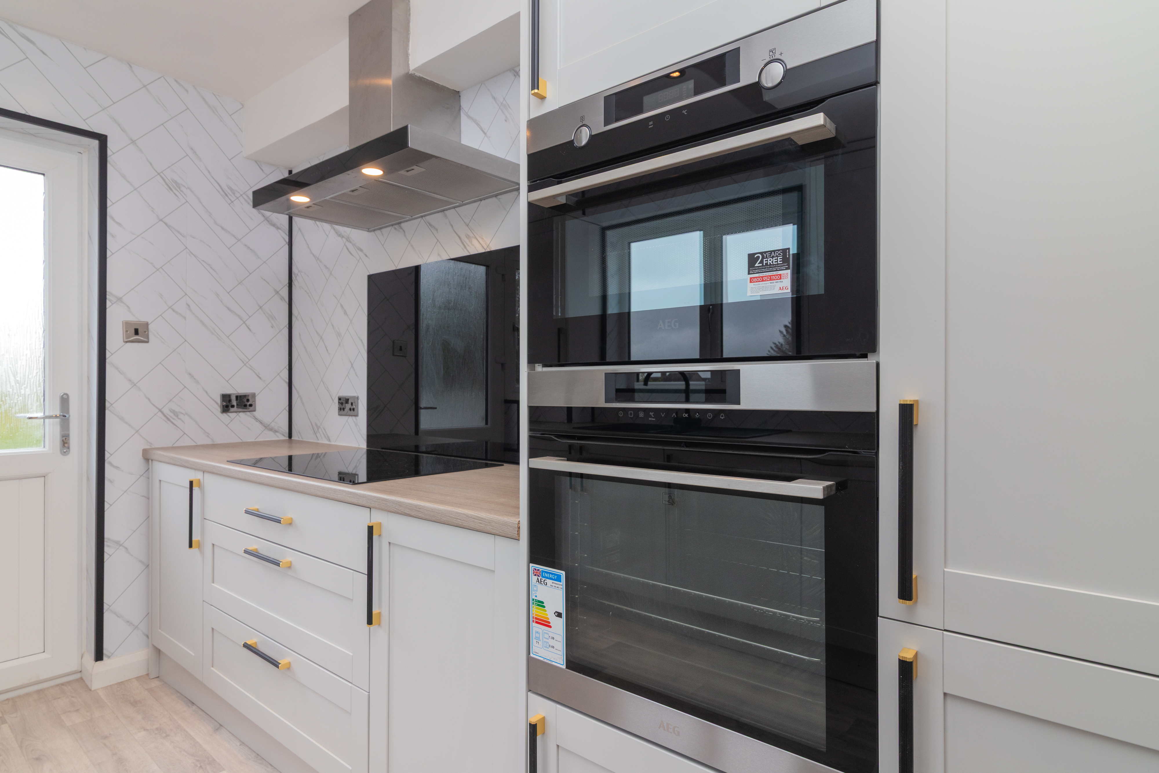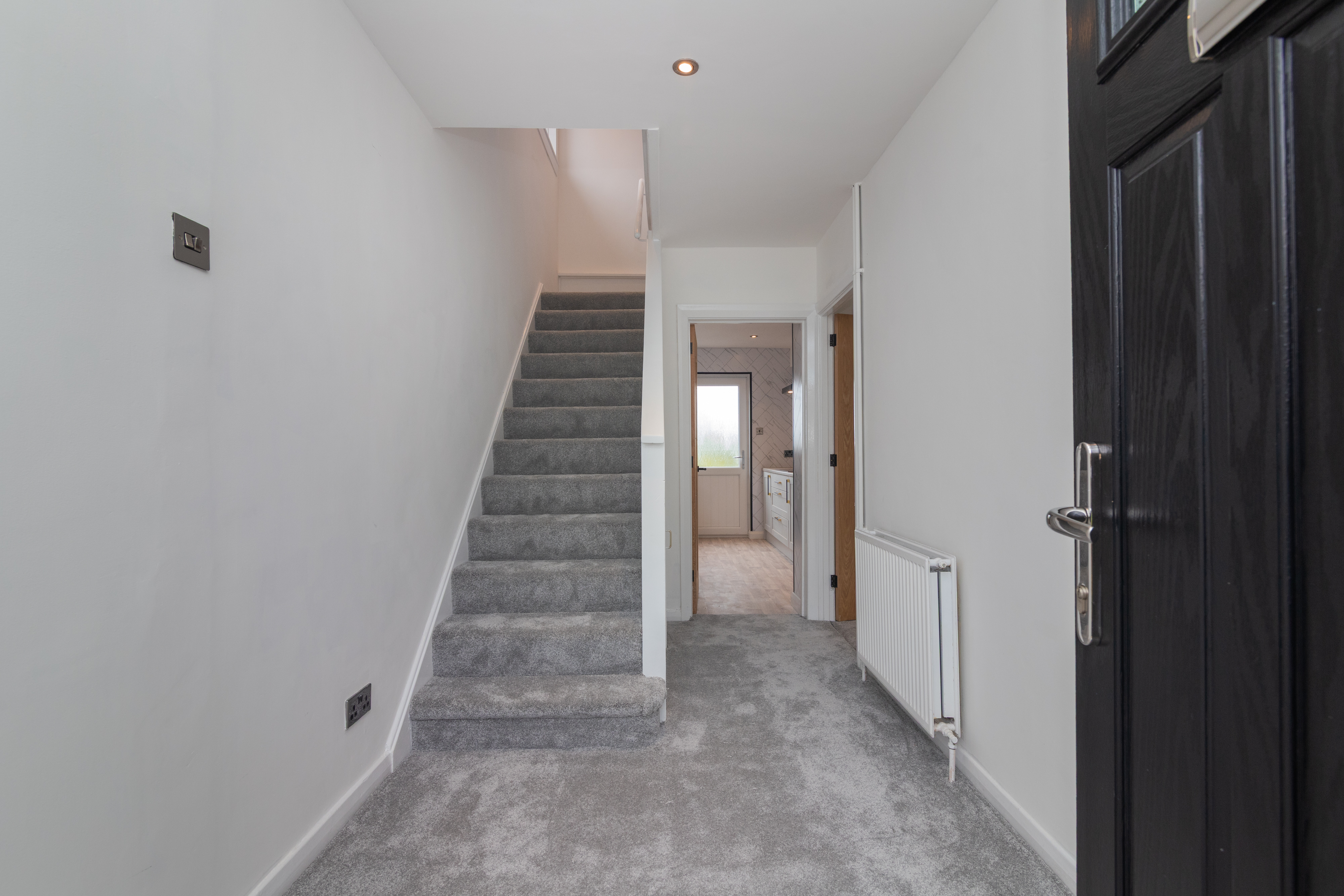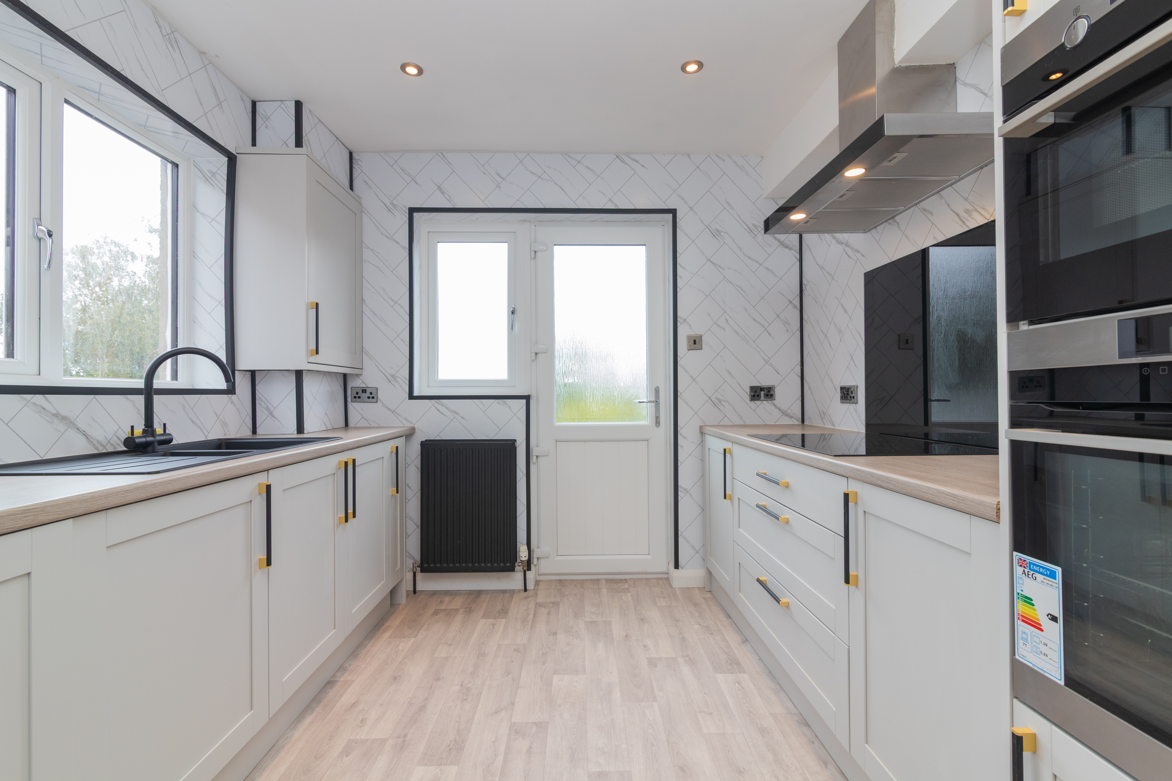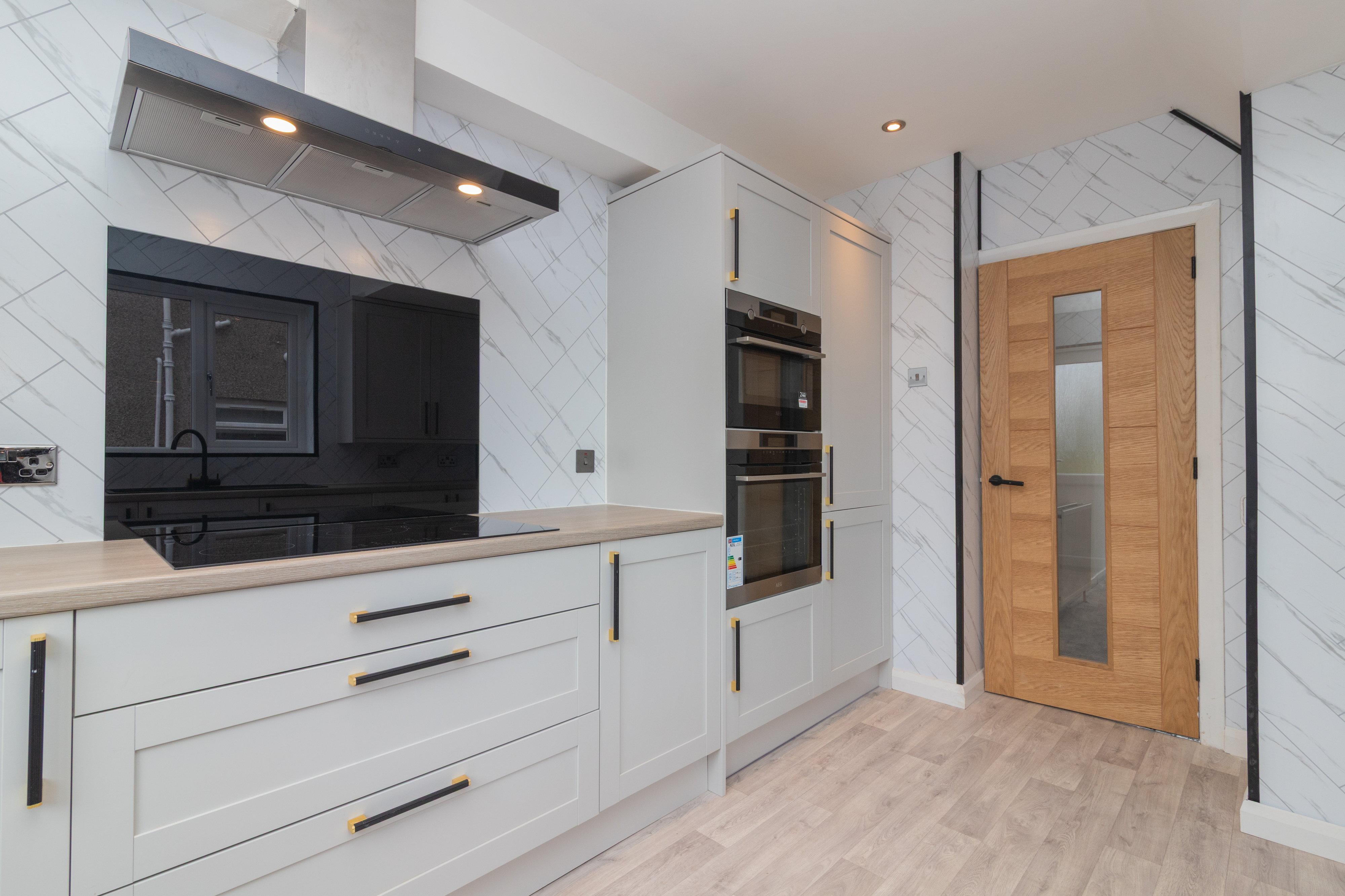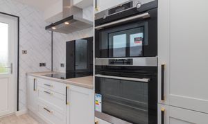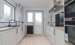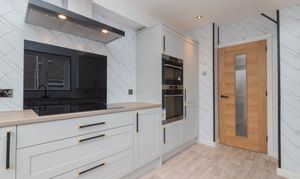 The accommodation is both stylish and versatile, featuring a spacious bay-window lounge which flows seamlessly into the formal dining area – perfect for family living or entertaining guests. The brand new contemporary kitchen is fitted with an induction hob, extractor hood, double oven, integrated fridge freezer, and washing machine. A range of wall and floor-mounted units are enhanced by complementary worktops and splashback, with direct access to the enclosed rear garden.