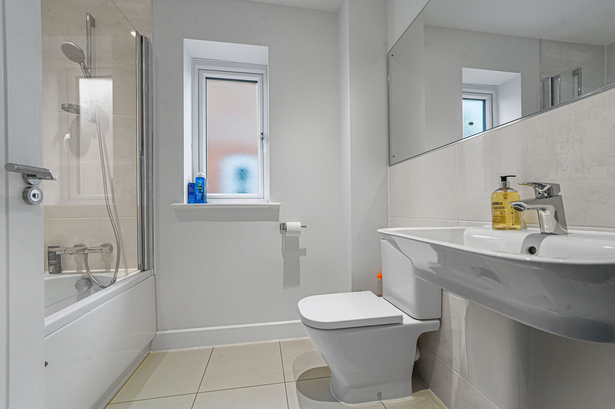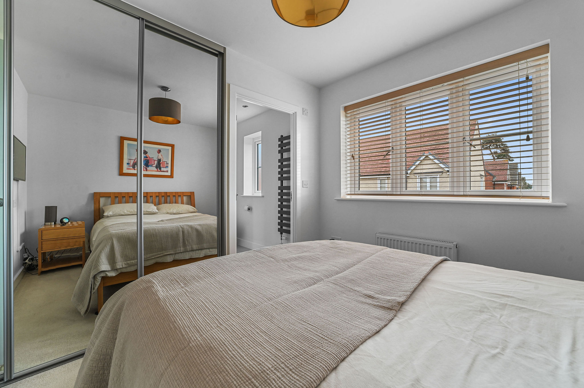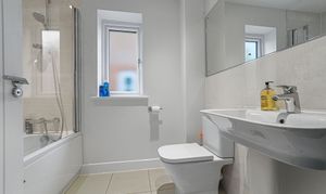 Upstairs, the home continues to impress with three well-proportioned bedrooms and two stylish bathrooms. The principal bedroom benefits from built-in wardrobes and a beautifully finished en-suite shower room, while the remaining bedrooms offer flexibility for guests, children, or a home office. The family bathroom is sleek and contemporary, featuring a modern three-piece suite with tiled surrounds and quality fixtures, providing a tranquil space to relax and unwind.
