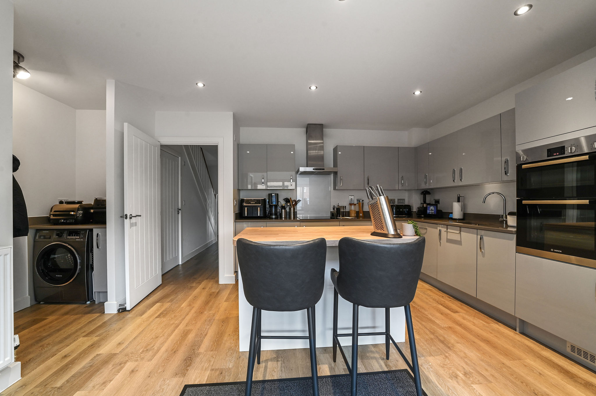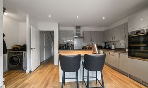 The heart of the home lies to the rear, where a stunning open-plan kitchen, dining, and family room has been designed with both everyday living and entertaining in mind. The contemporary kitchen features sleek high-gloss cabinetry, contrasting worktops, and a central island with breakfast seating, creating an ideal space for cooking and socialising. Integrated appliances and plentiful storage combine practicality with style, while warm wood-effect flooring flows effortlessly through to the impressive extension beyond.