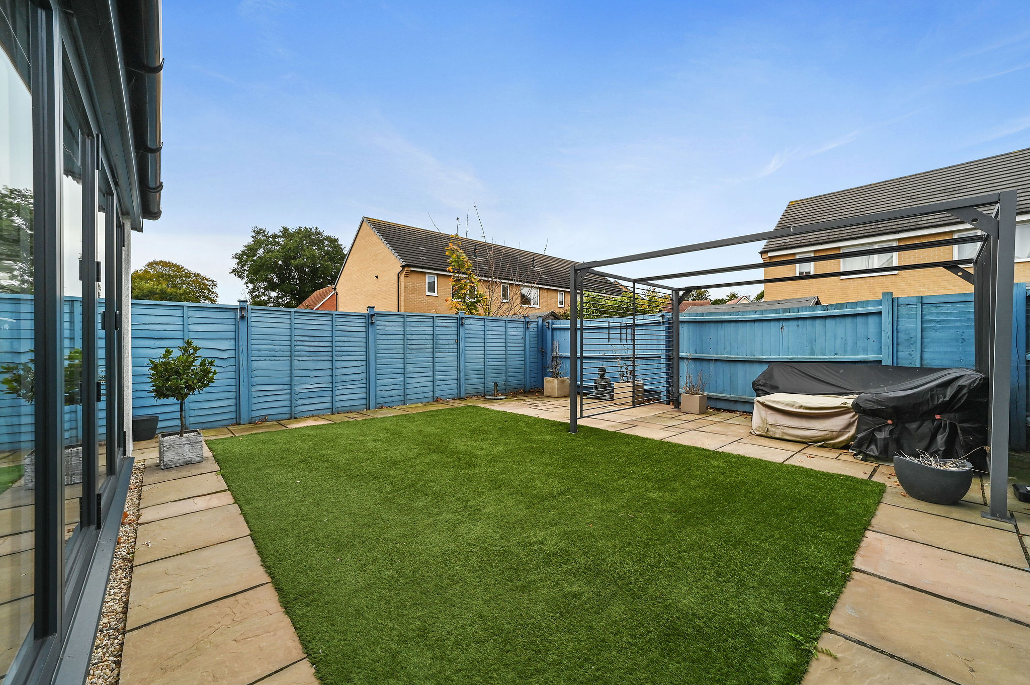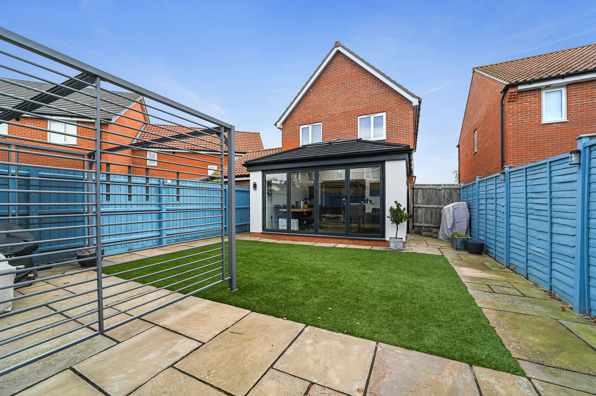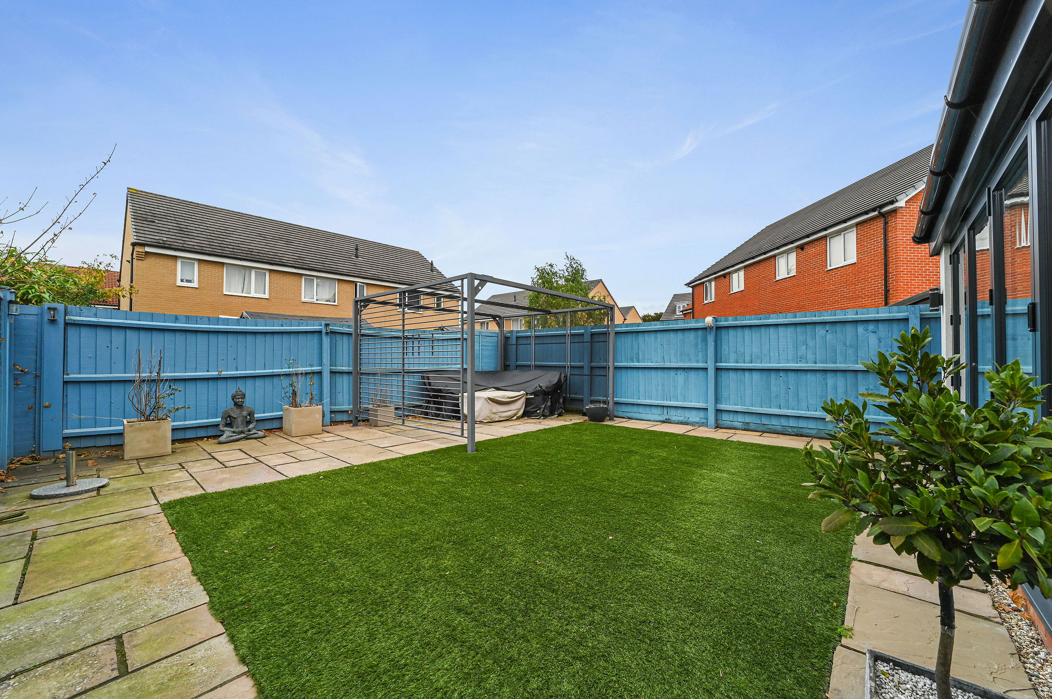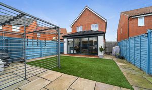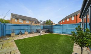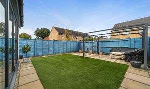 Externally, the rear garden offers a private and low-maintenance retreat, perfect for both entertaining and relaxation. A combination of patio, artificial lawn, and neat planting borders ensures year-round appeal, while the bright blue fencing adds a touch of character and privacy. There is ample space for outdoor dining, barbecues, or simply enjoying the sunshine. The property also benefits from a driveway providing off-road parking and access to the integral garage, ideal for storage or secure parking.