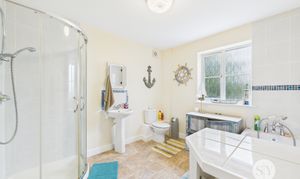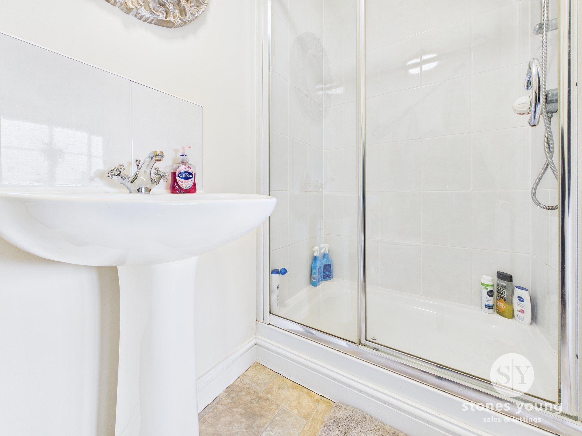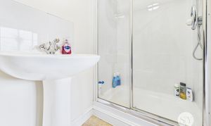 Vinyl flooring, tiled splashbacks, three piece in white comprising of basin, wc and shower enclosure with mains fed shower