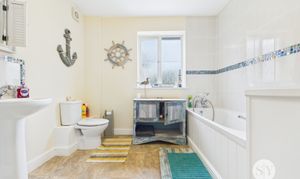 Vinyl flooring, panel radiator, upvc double glazed frosted window, tiled splashbacks, four piece in white composing of wc, basin, mains fed bathtub and mains fed shower enclosure