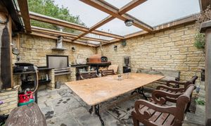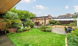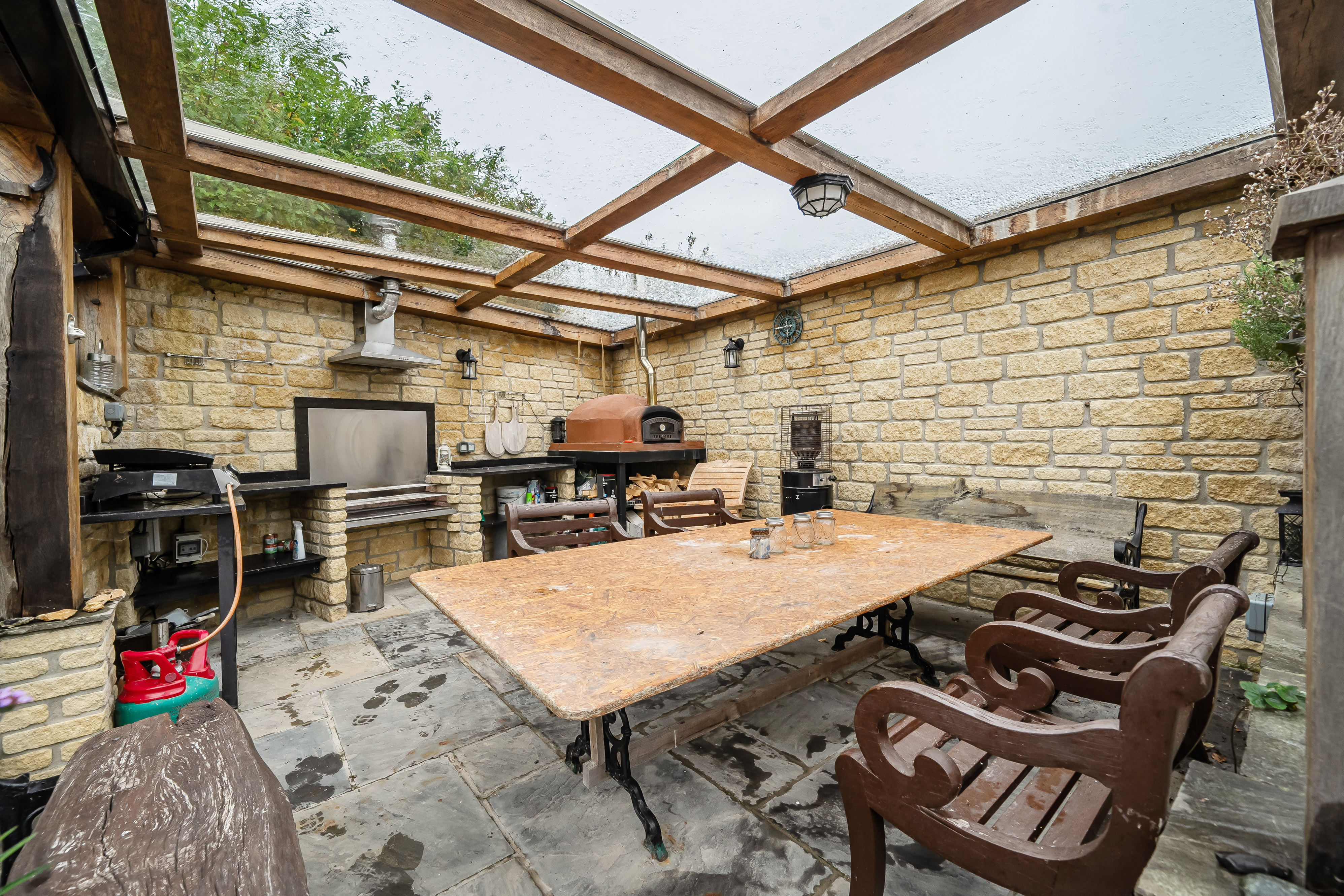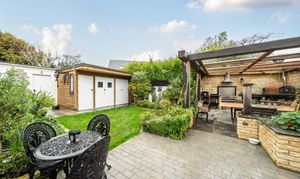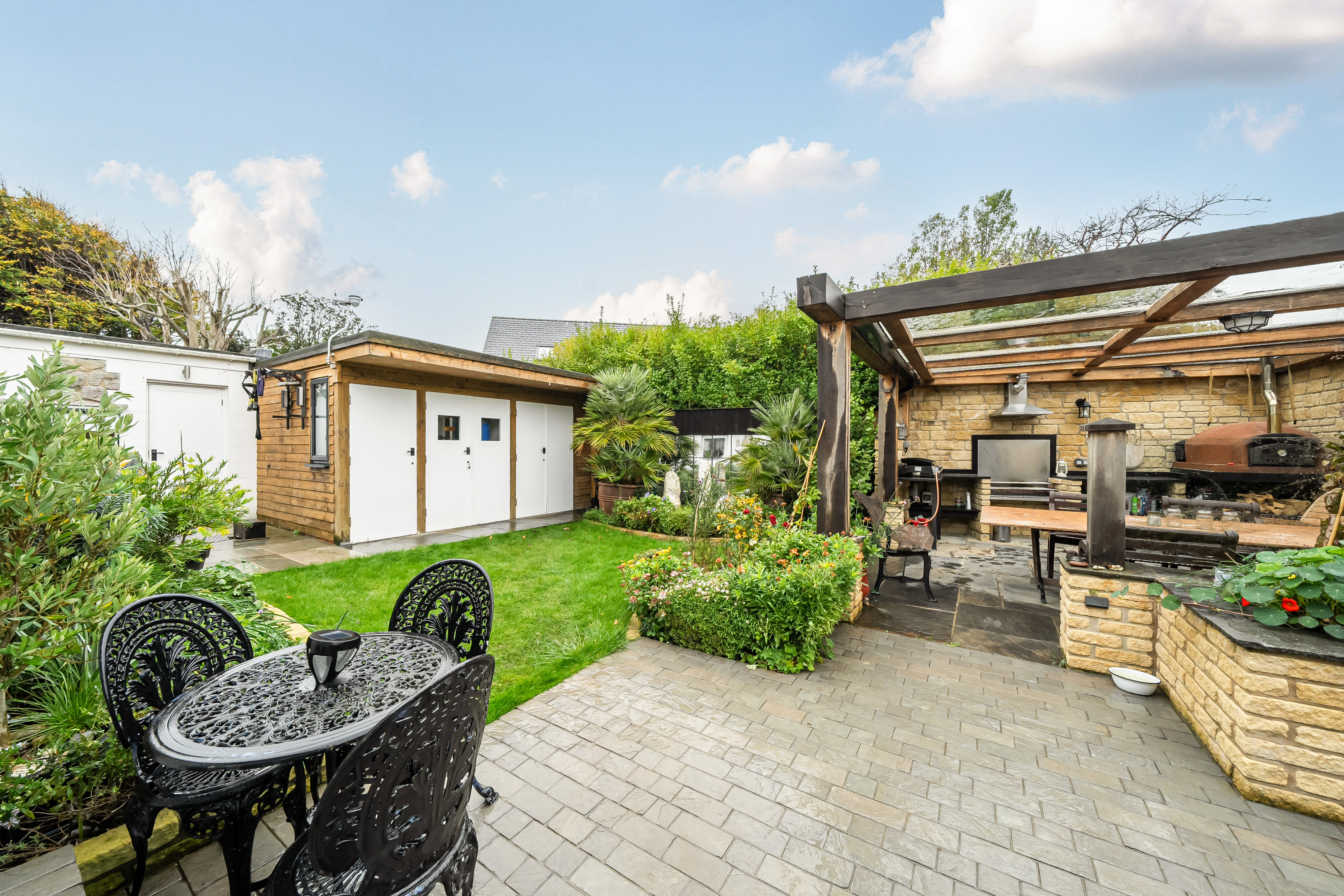 The beautifully landscaped gardens are a true highlight of this home, having been professionally designed to provide year-round colour and interest while remaining low maintenance. The gardens wrap around the property to create a series of peaceful seating areas and hidden corners. A standout feature is the outdoor kitchen, sheltered beneath a pergola and equipped with a full-sized pizza oven, BBQ grill, and power connections — perfect for summer entertaining.