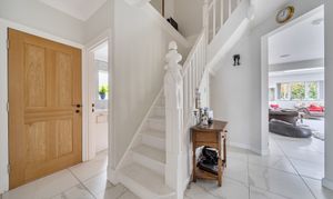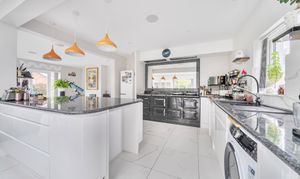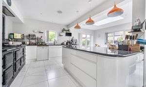 You approach the property via private gates that open onto a generous driveway leading to the front door. Upon entering, you are greeted by a welcoming and spacious entrance hall that flows through to the heart of the home — a stunning open-plan kitchen, dining and family area. This impressive space features a large central island, a dual-fuel AGA, and ample storage, making it ideal for both everyday living and entertaining. The room enjoys panoramic views across the wrap-around garden with doors providing direct access outside.