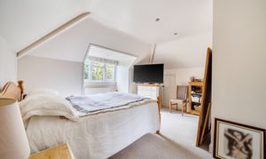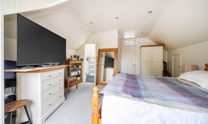To the first floor, you’ll find the master bedroom suite, complete with eaves storage and an en-suite shower room. A fourth bedroom is also located on this level — currently used as a dressing room but equally suited as a study or nursery.