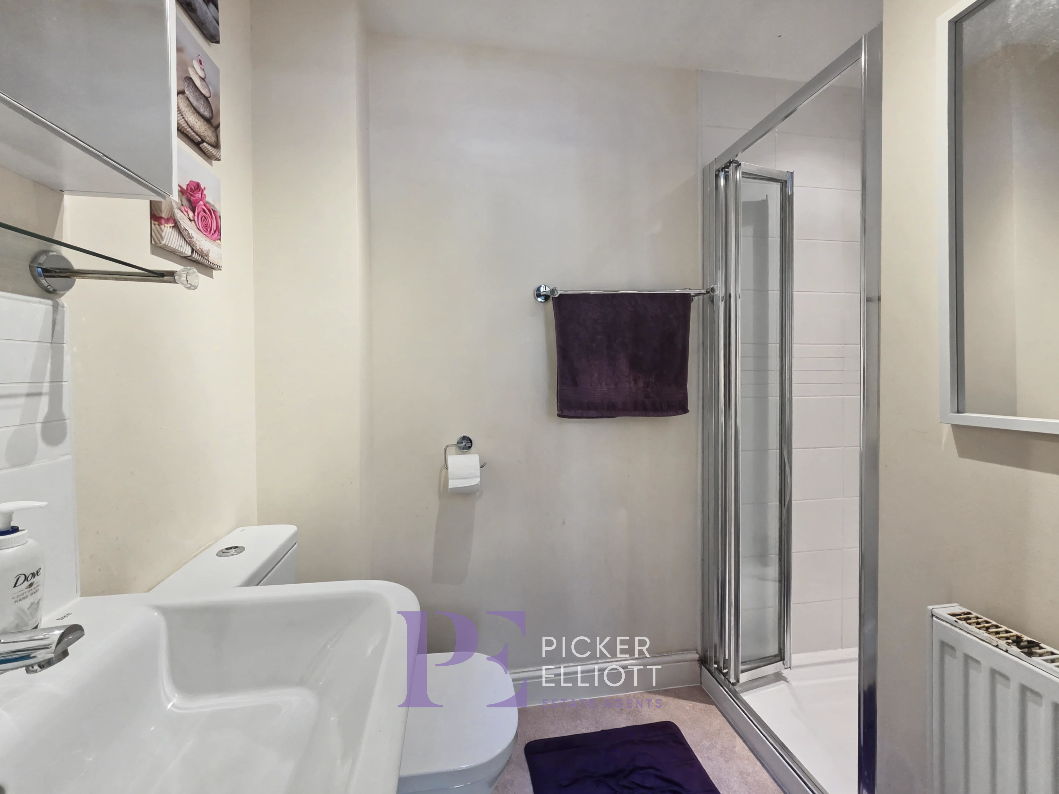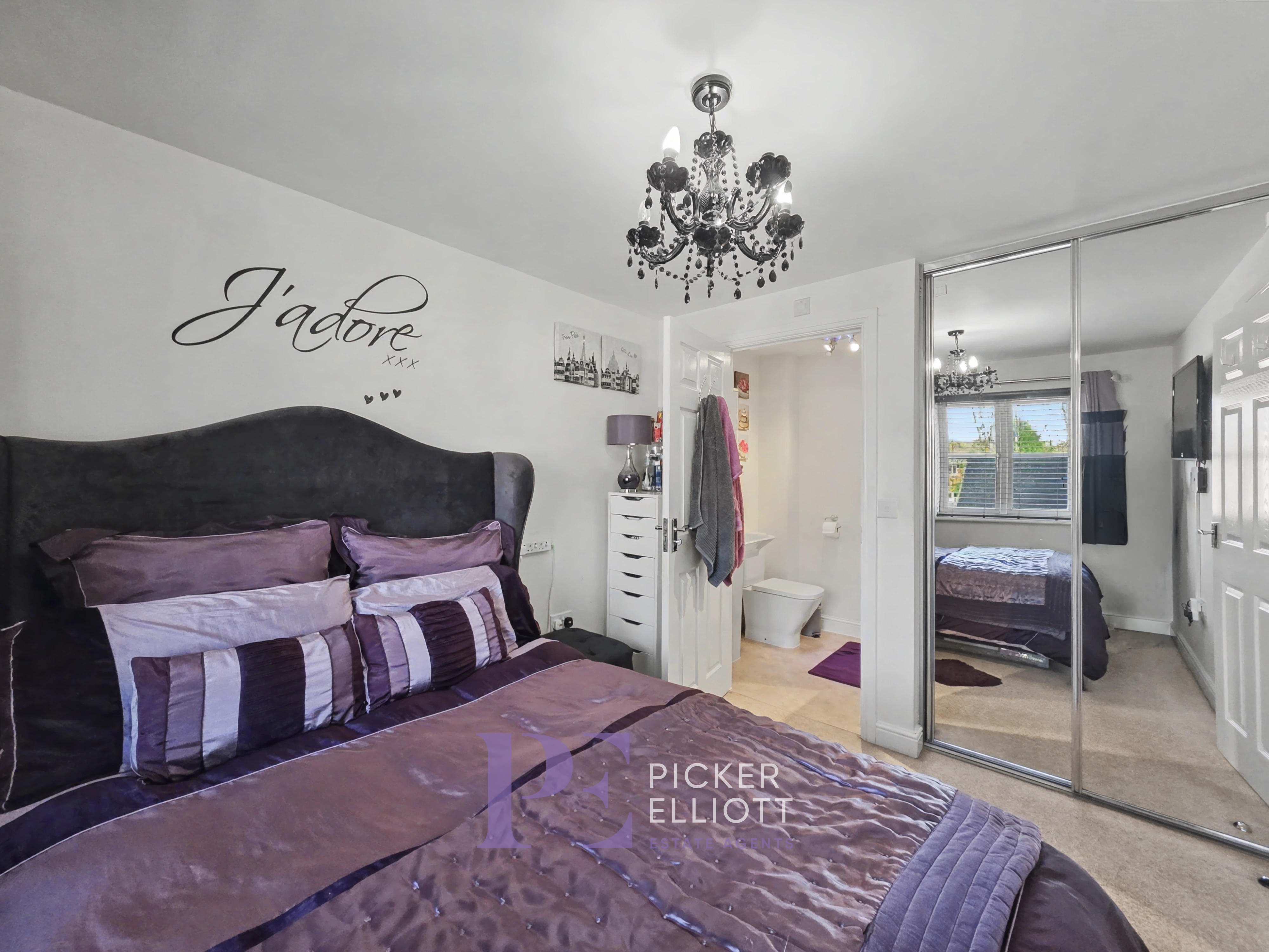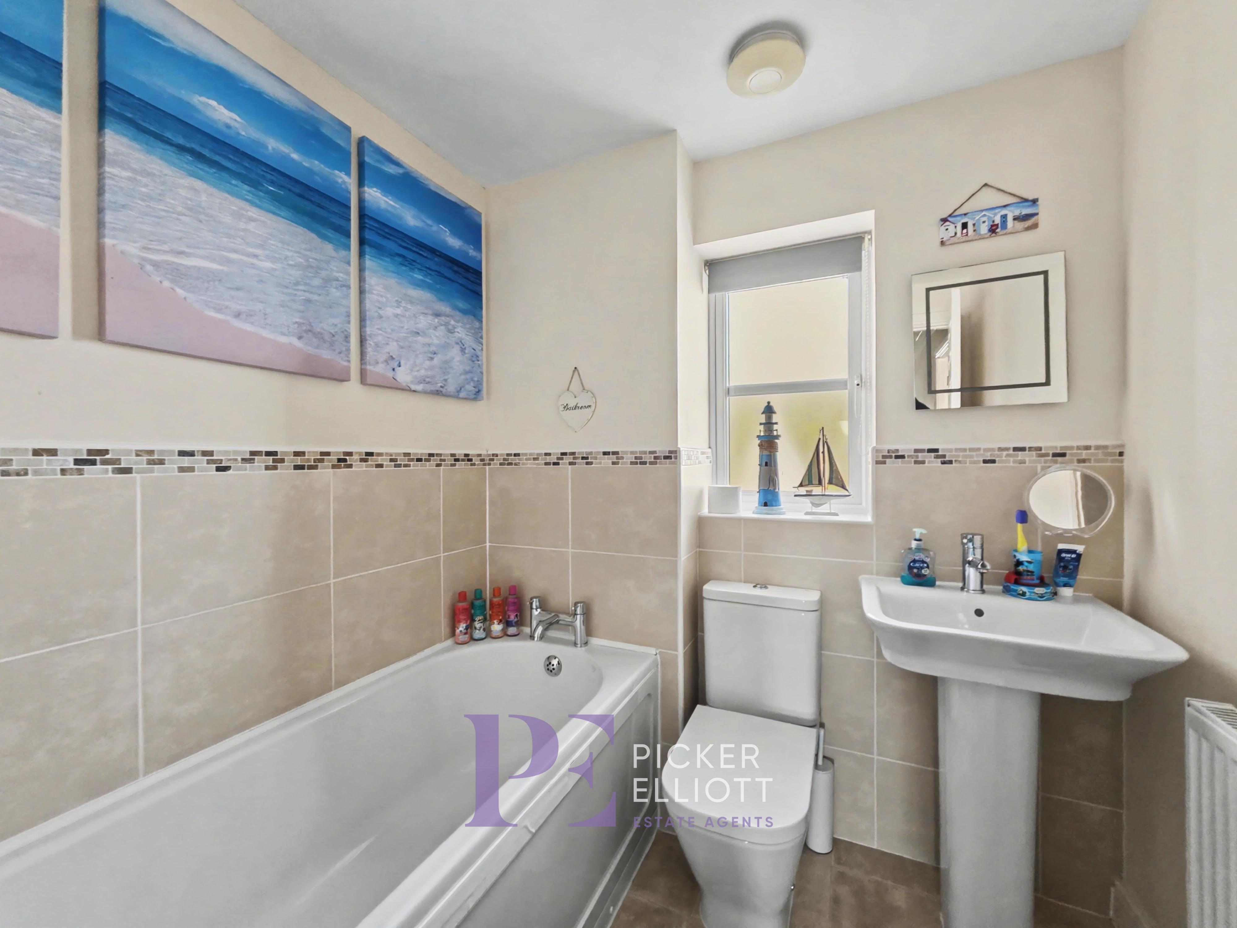 Upstairs, the home boasts three well-proportioned bedrooms. The main bedroom has an en-suite bathroom, which offers modern fixtures and a sleek shower, providing privacy and comfort. The main bathroom is finished to a high standard with elegant tiling, a large bath-tub, and a bright, airy feel thanks to ample natural light.
