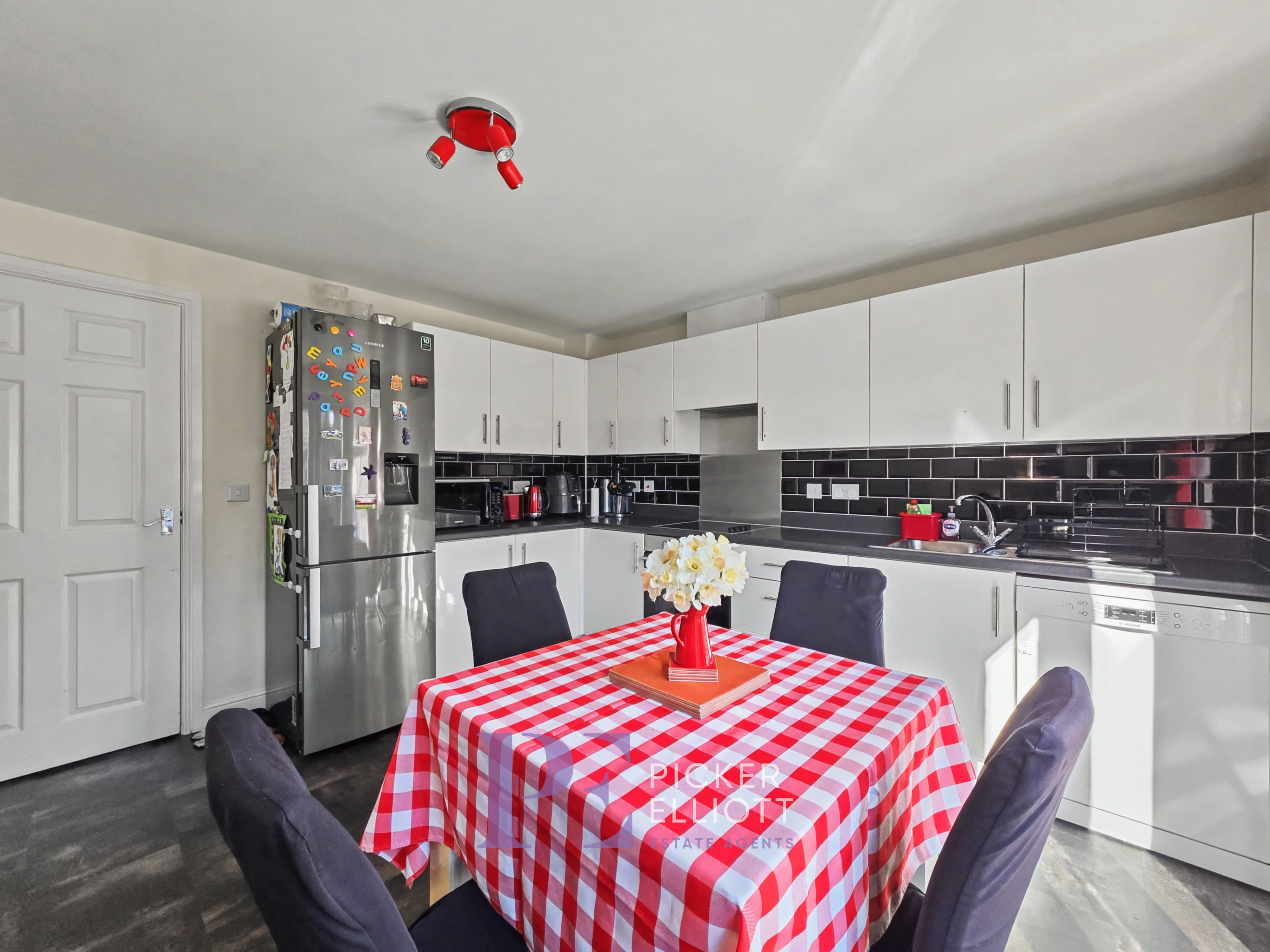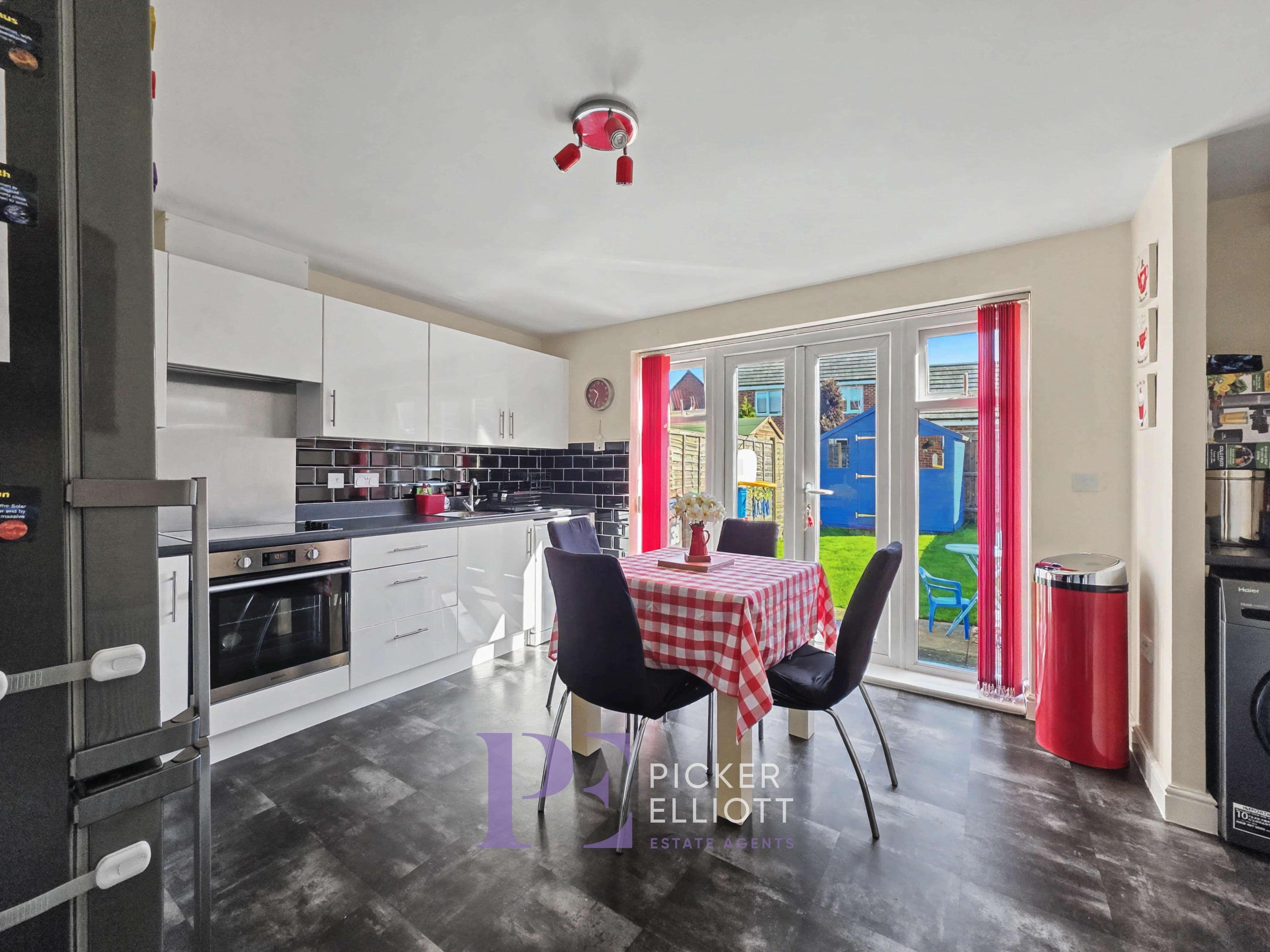 This beautifully presented three-bedroom, two-bathroom end-of-terrace house offers contemporary living across a thoughtfully designed layout that caters to modern family needs. The property welcomes you with a striking modern brick exterior and well-maintained landscaping, complemented by convenient off-road parking. The spacious reception room is filled with natural light from a large window, featuring a chic modern lighting fixture, plush carpeting, and neutral decor that creates a warm and inviting atmosphere for relaxation or entertaining guests. The stylish kitchen is equipped with sleek modern units, integrated appliances including an oven, and is accentuated by a sophisticated black subway tile backsplash. Large French doors lead directly from the kitchen to the private garden, seamlessly connecting indoor and outdoor living spaces.