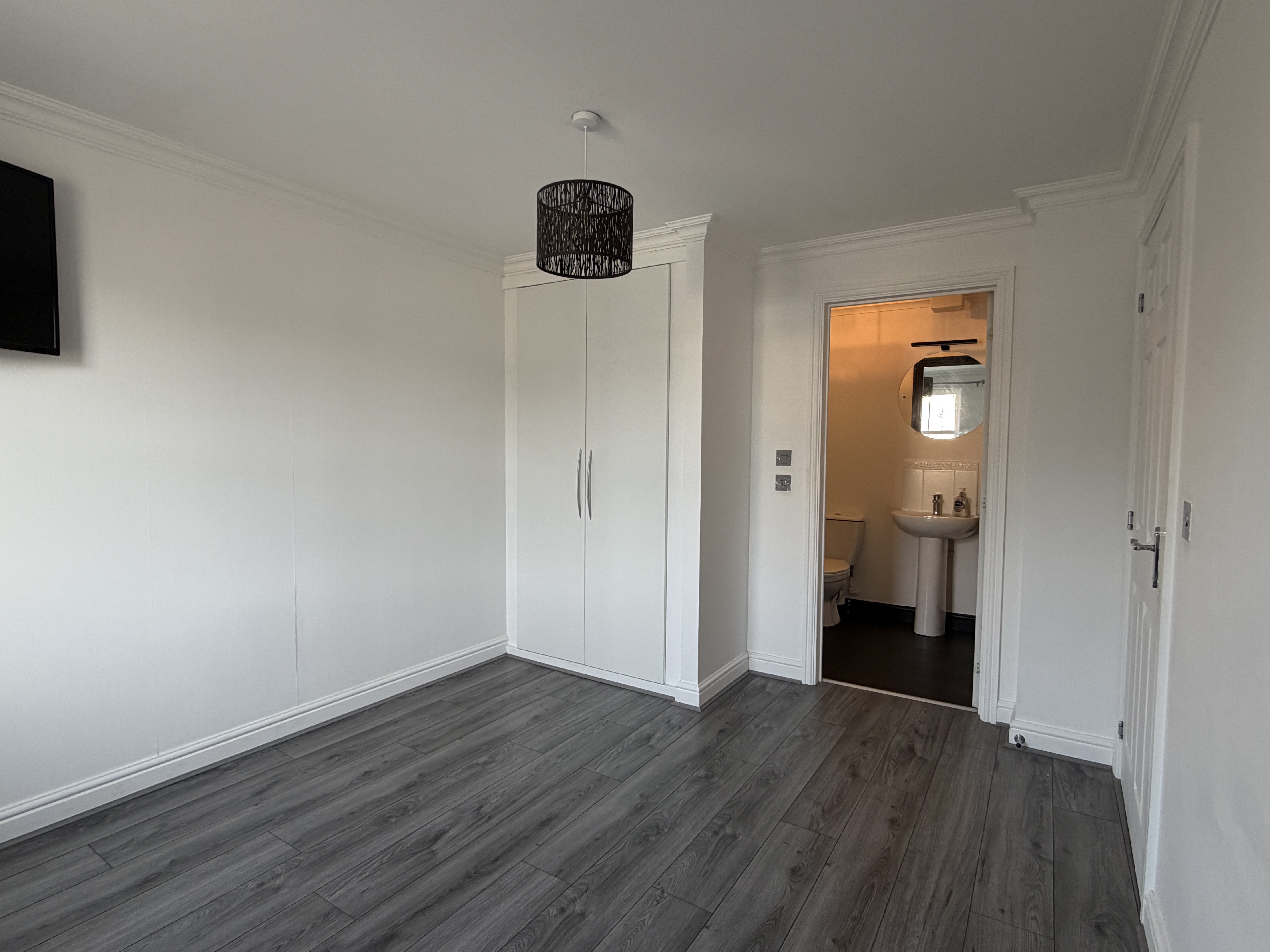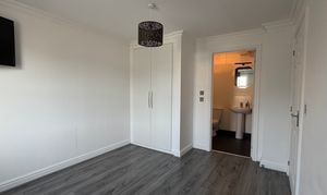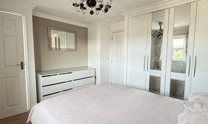 The upper floor hosts the master bedroom, positioned to the front of the property, which offers neutral décor, fitted wardrobes with ample hanging and shelving space, soft carpeting, and en suite facilities for added privacy and comfort.