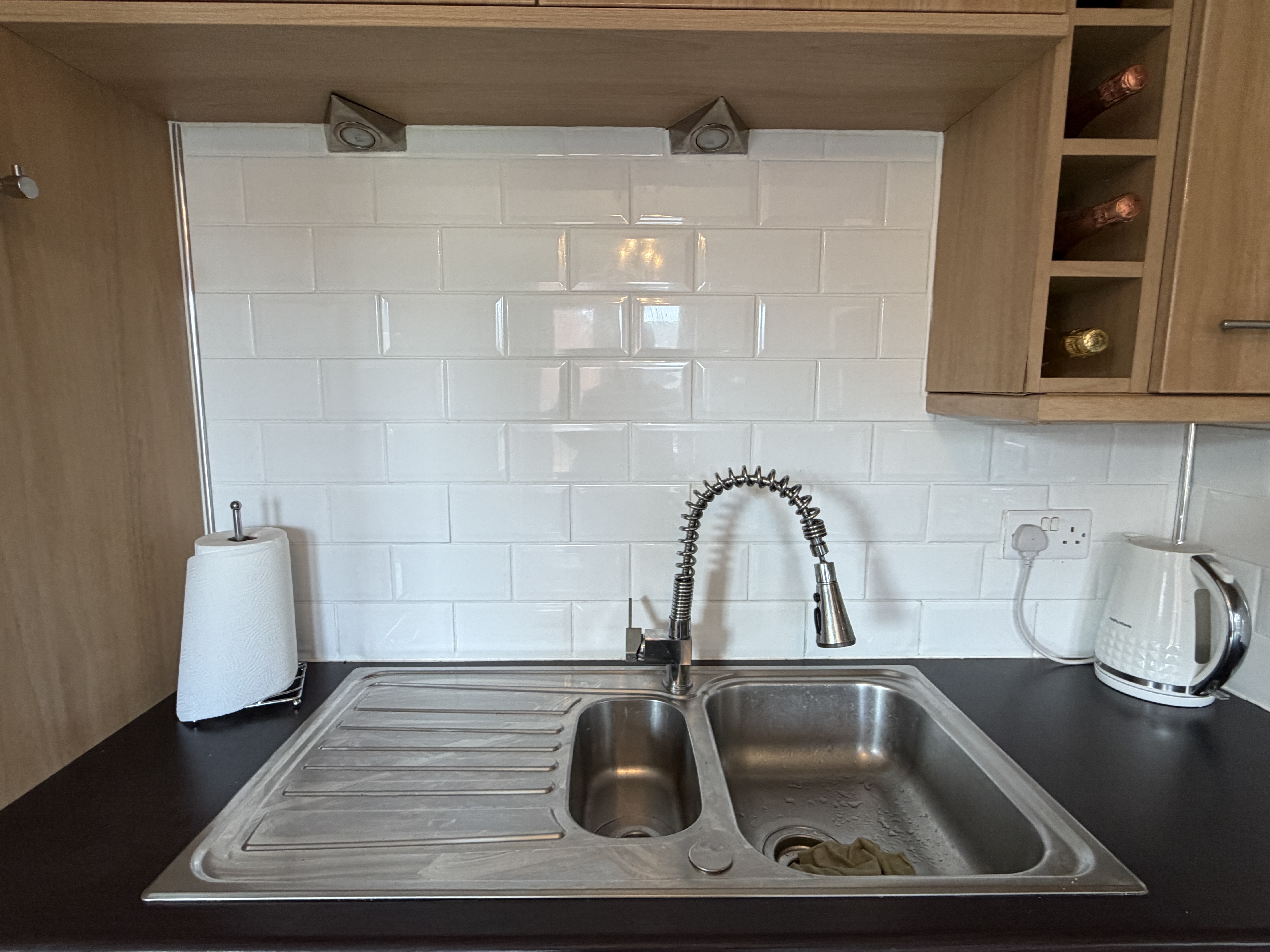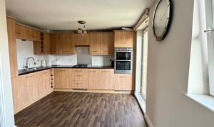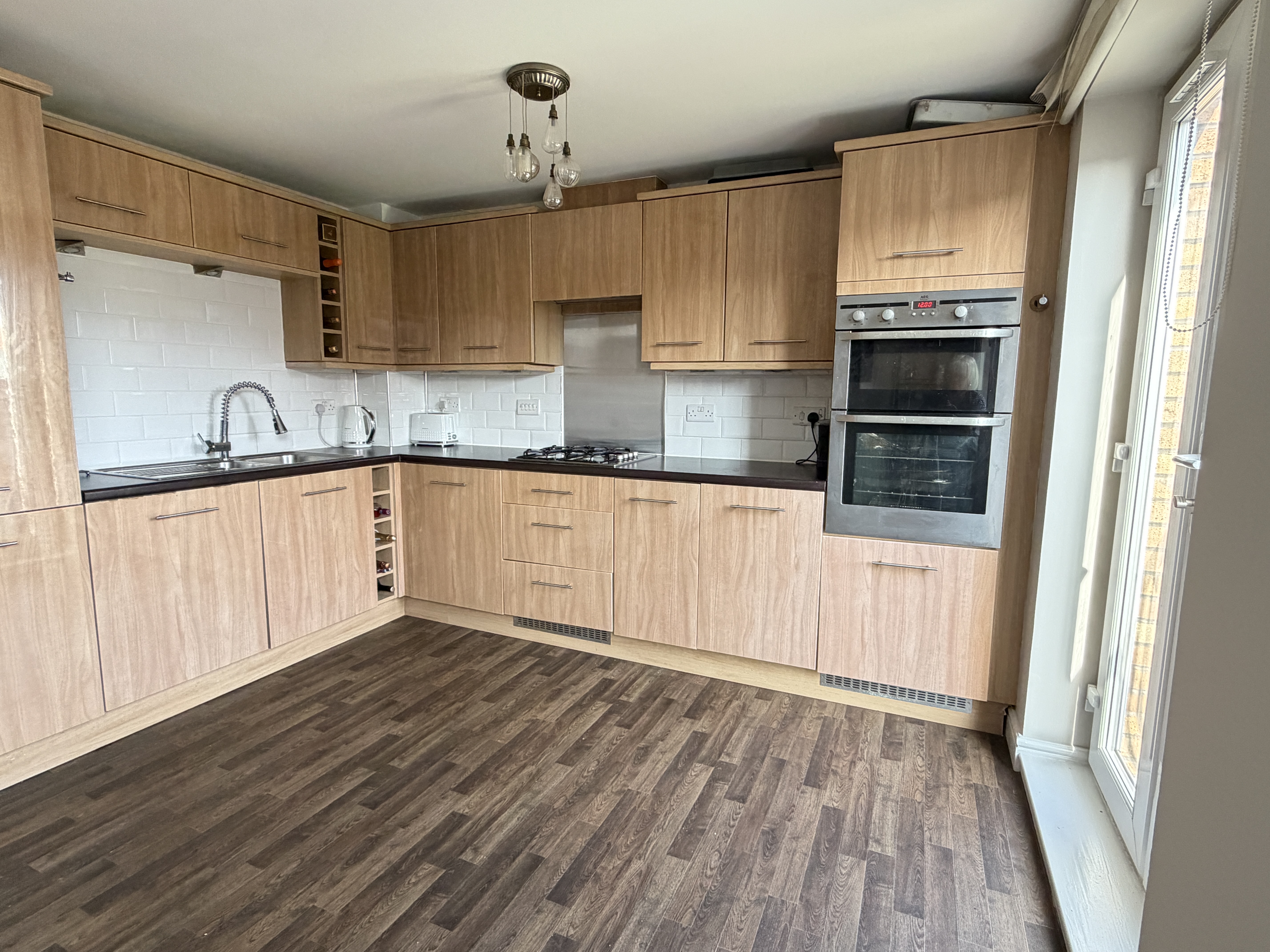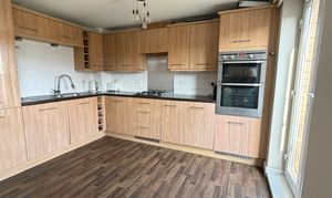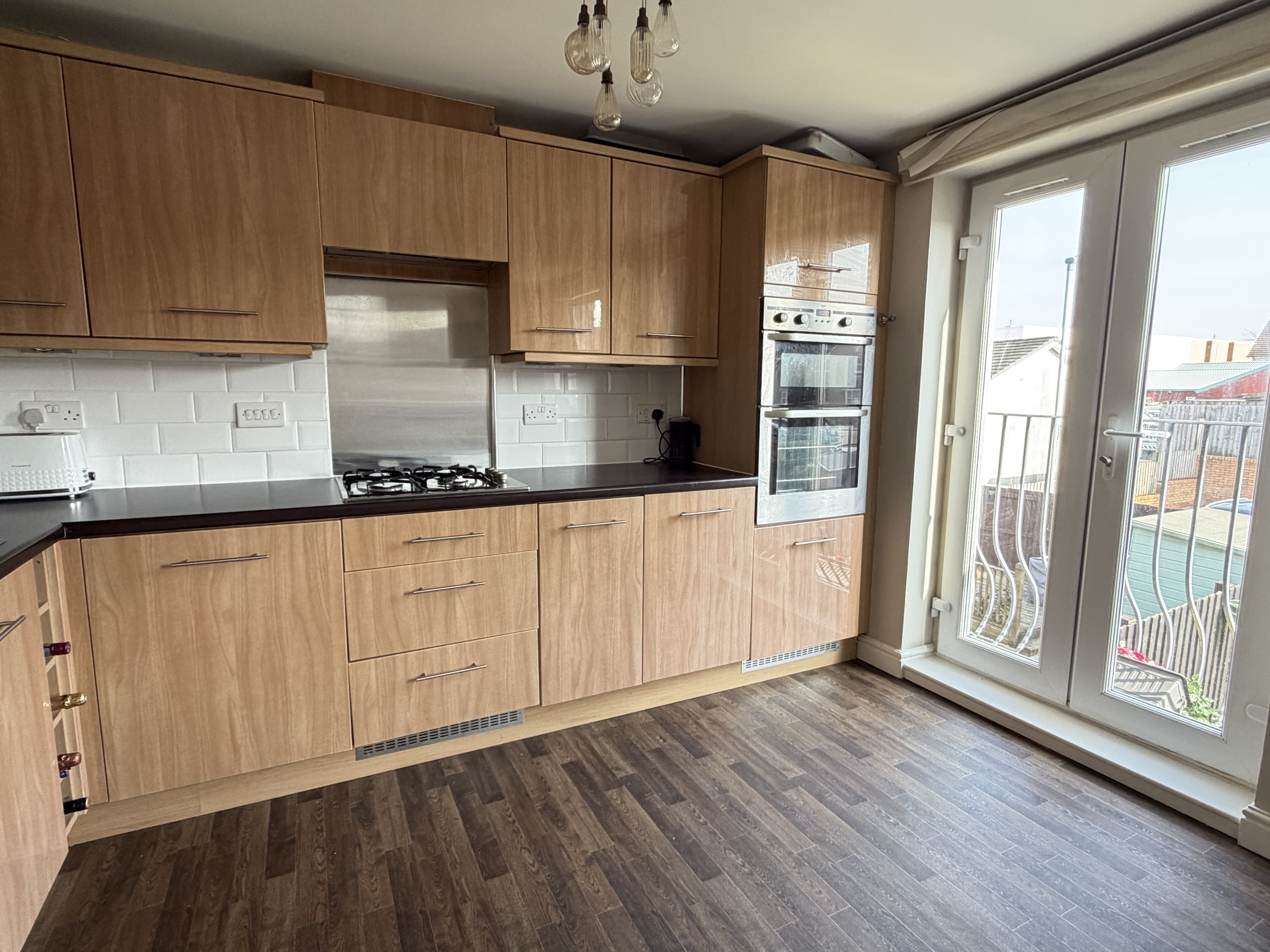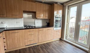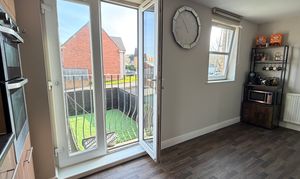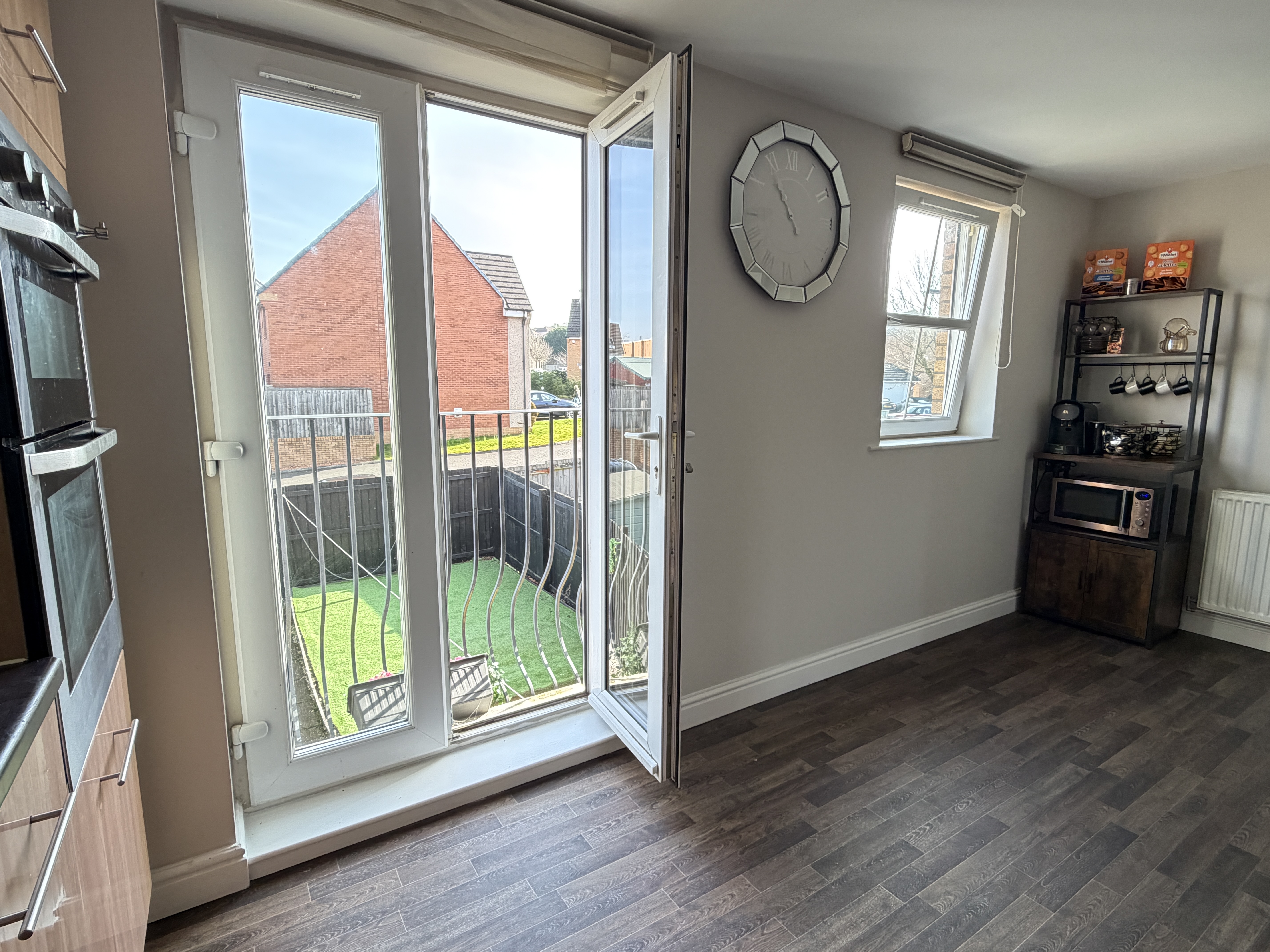 - Modern fitted dining kitchen offers an array of wall and floor mounted units with matching wipe clean surface, integrated appliances, vynil flooring, feature Julliette balcony