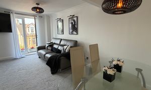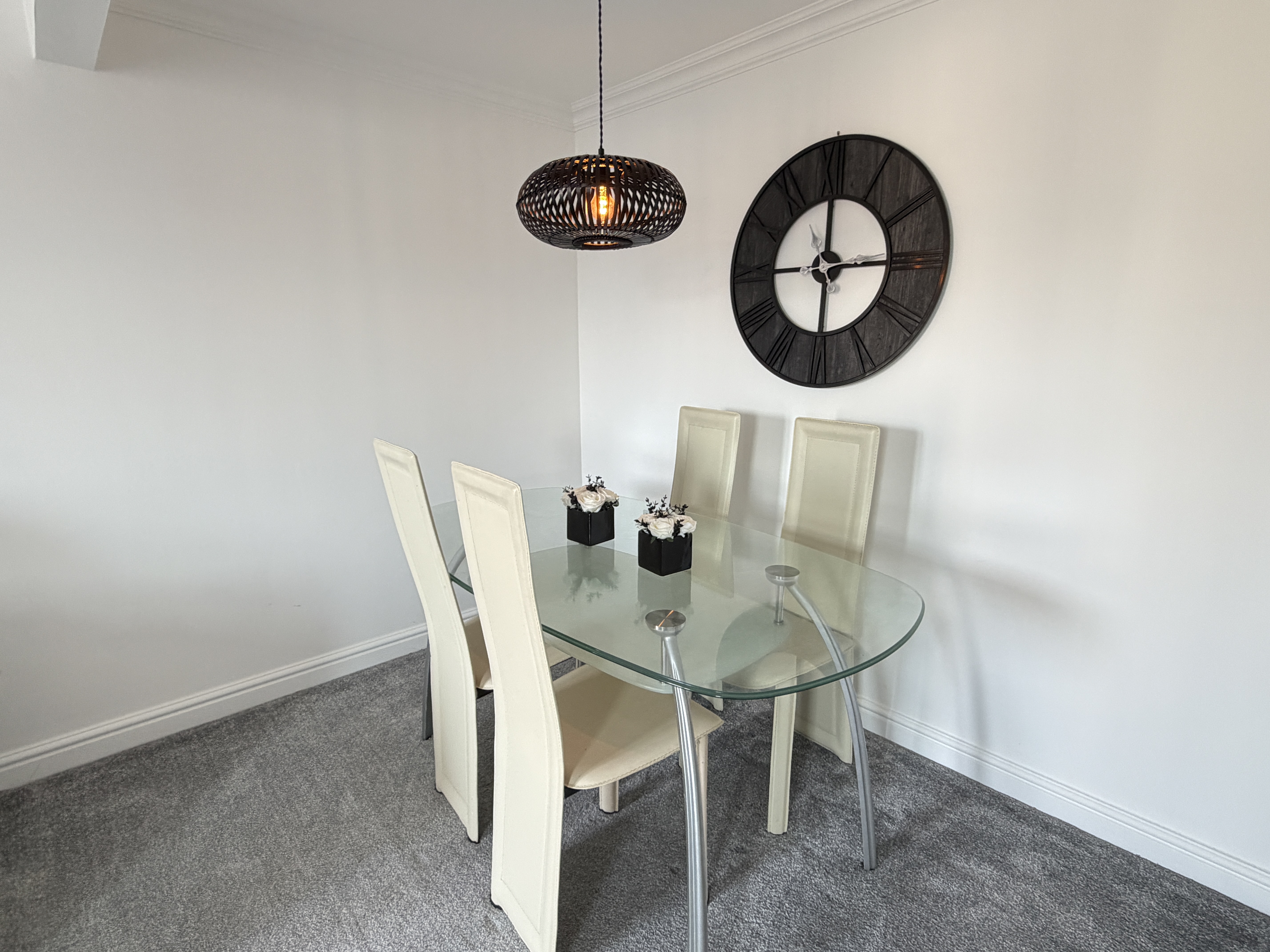 The fourth bedroom, also located on this level, features neutral décor, laminated flooring, and direct access to a contemporary downstairs shower room. Ascending to the first floor, the generous lounge is presented in a neutral palette and is enhanced by a feature Juliette balcony (creating an inviting atmosphere for relaxation), a designated dining area, and plush carpeting throughout. Adjacent to the lounge, the modern fitted dining kitchen boasts an impressive selection of wall and floor-mounted units, matching wipe-clean surfaces, integrated appliances, vinyl flooring, and a second feature Juliette balcony.