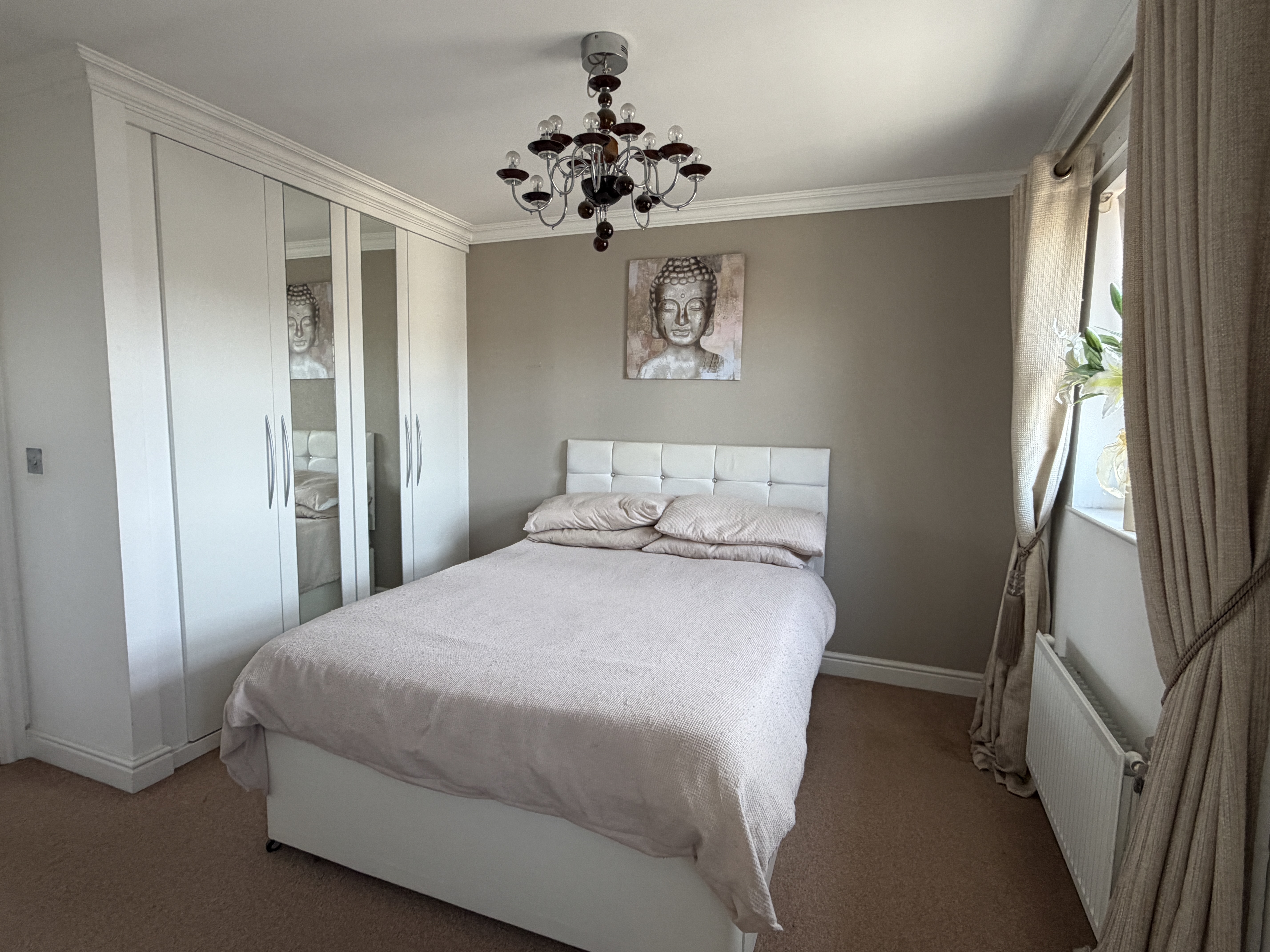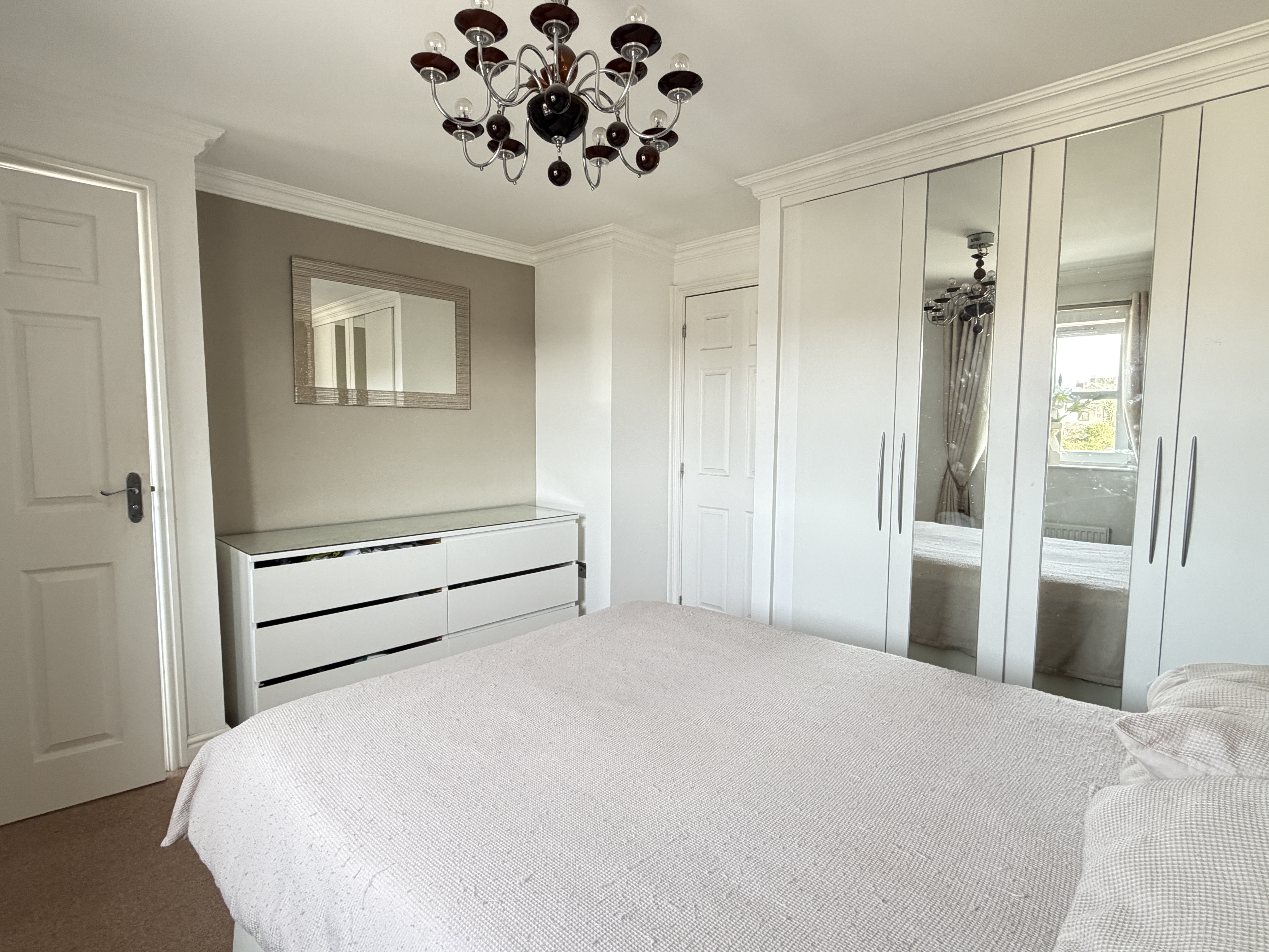 - Master bedroom is located to the front of the property, neutral decor, carpeted, fitted wardrobes offering a range hanging and shelving space, en suite facilities
