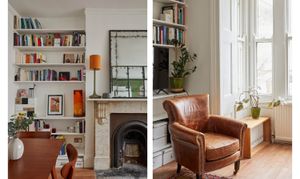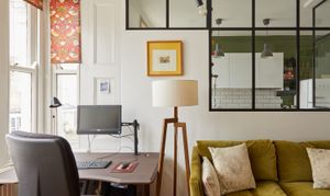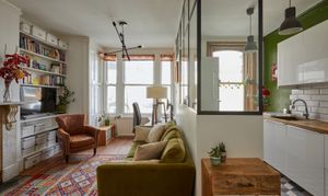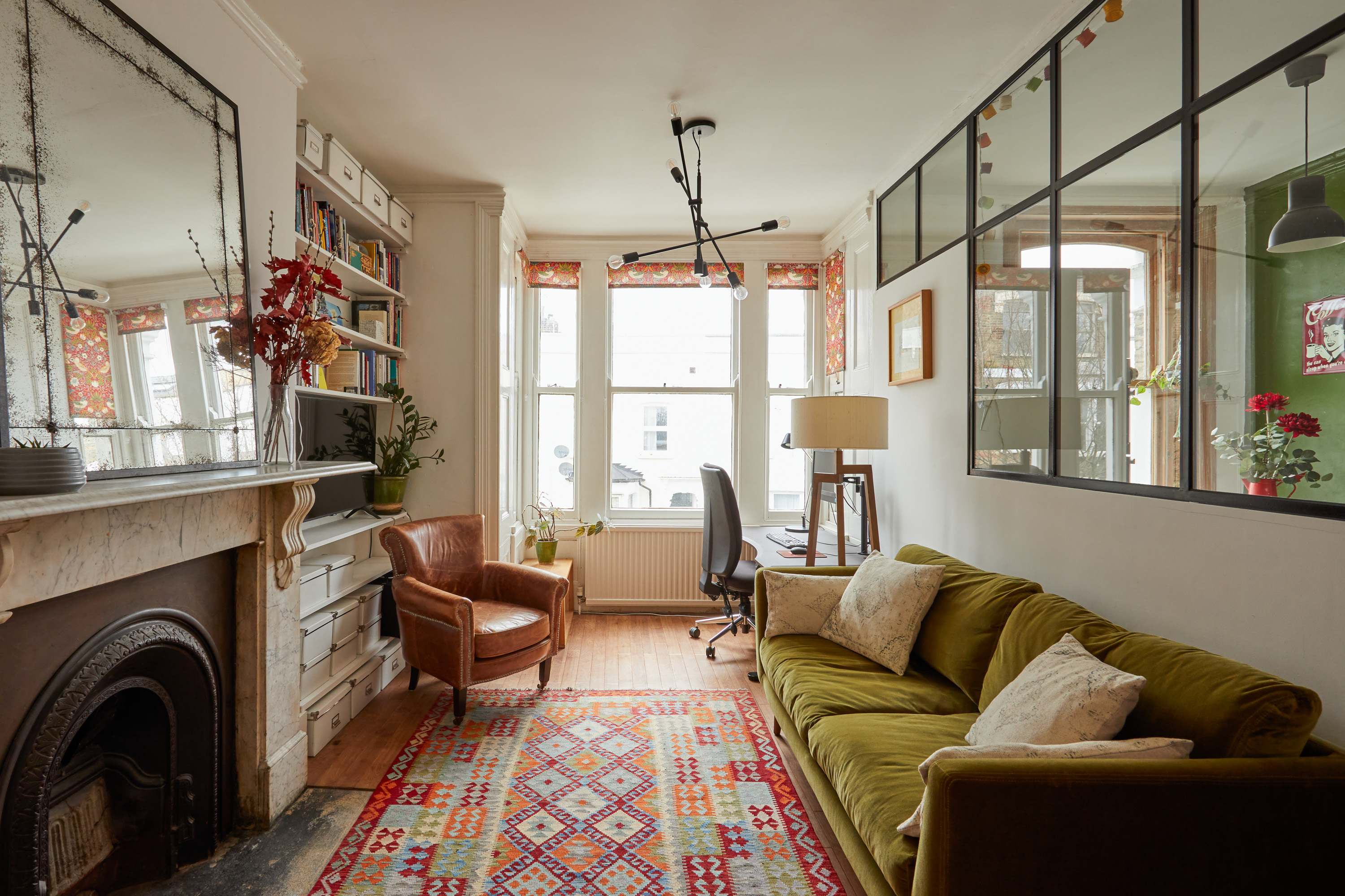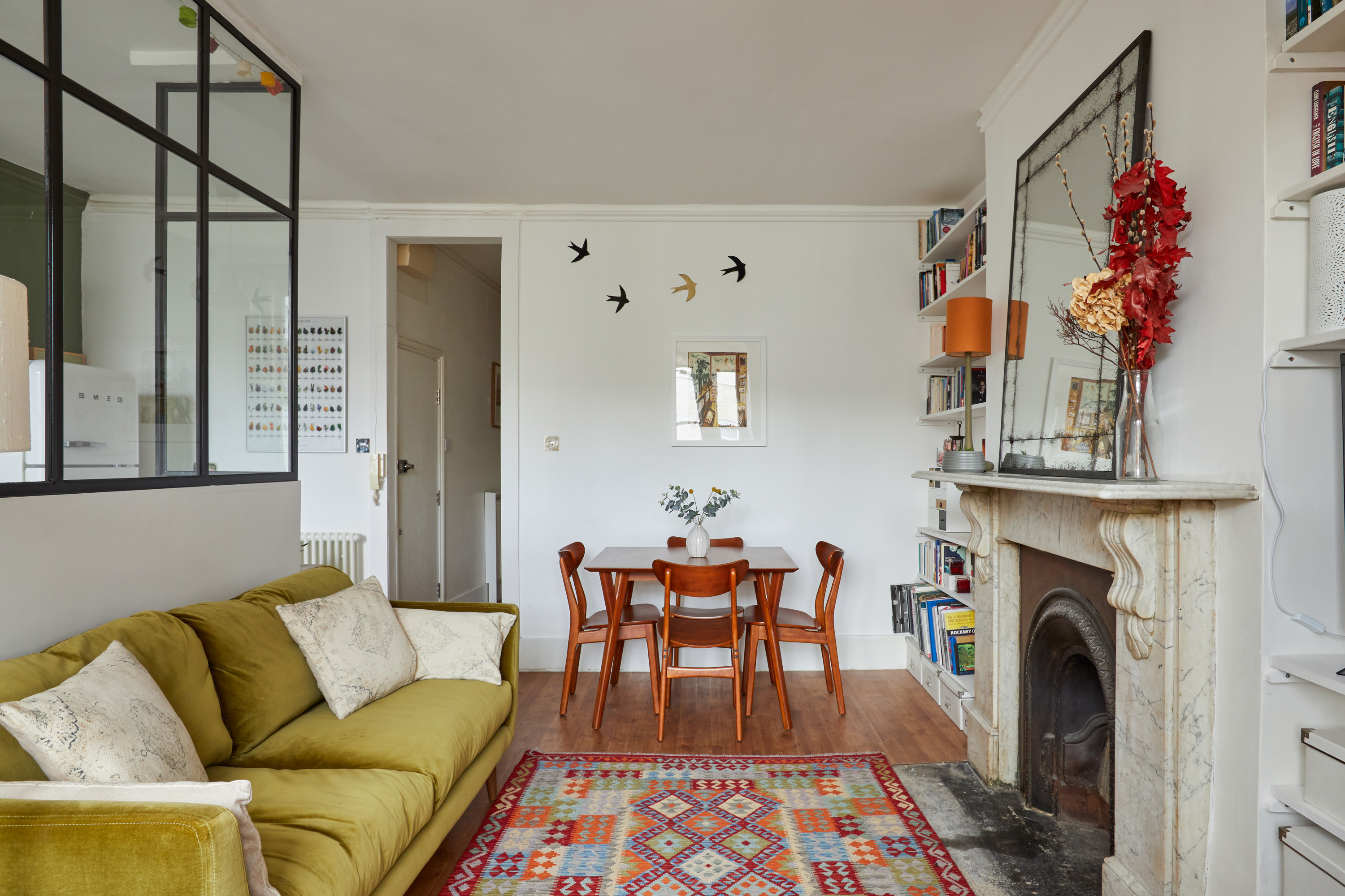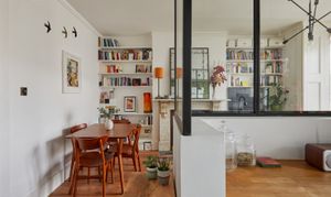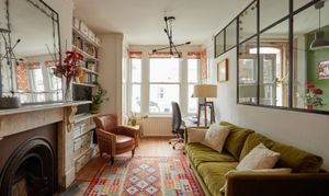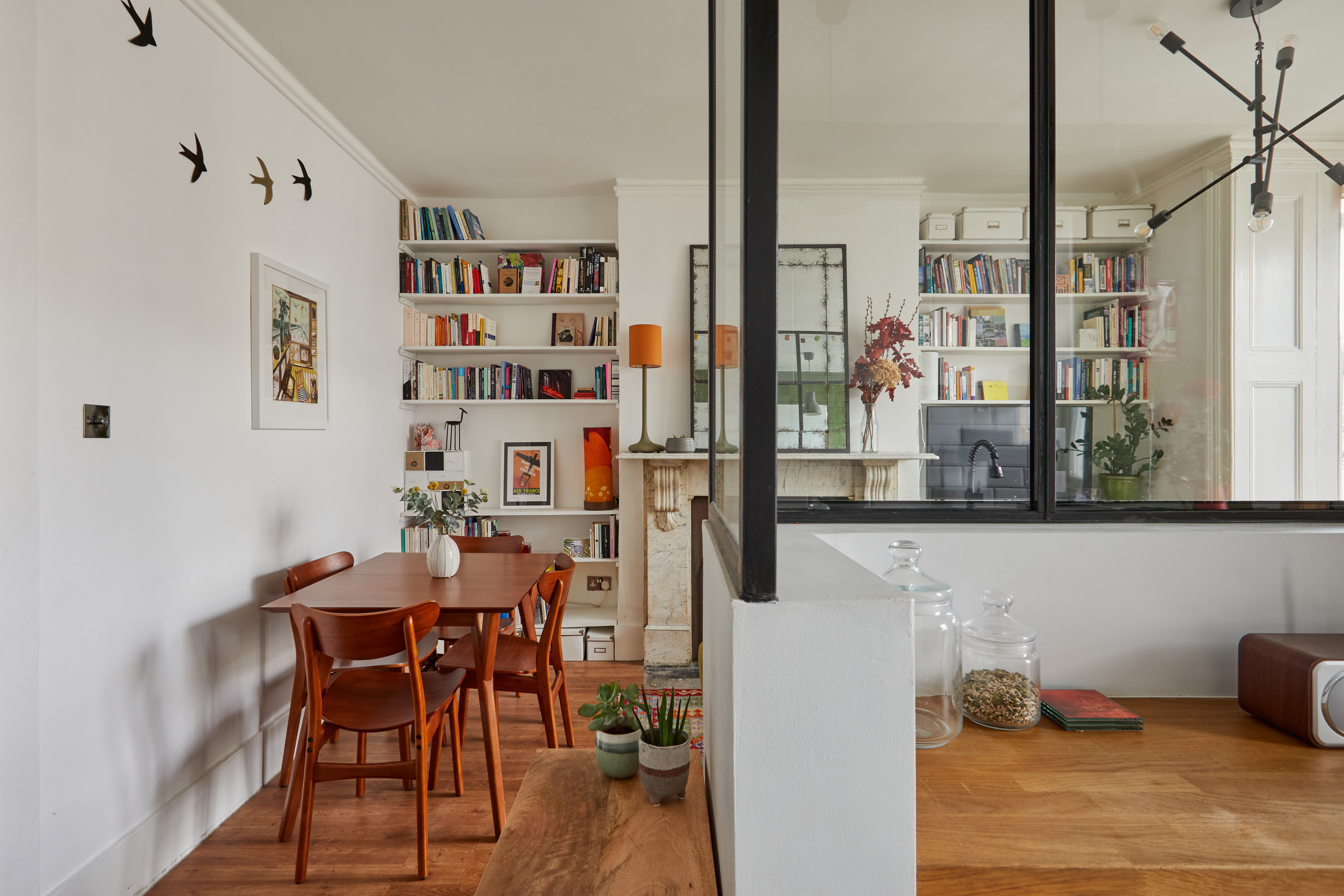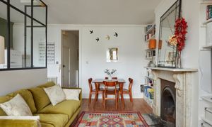 Spanning the first floor of a Victorian house, the gorgeous interiors are filled with period details and thoughtful design touches. The standout element is the Crittal-style glass wall in the living and dining room, which cleverly delineates the two areas, but look closely, and there are many more: the overlap of tile and wood flooring in the kitchen, the various storage solutions, and the marble fireplace surround. It's a home that is rich in character and atmosphere.