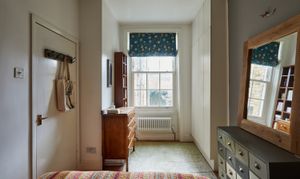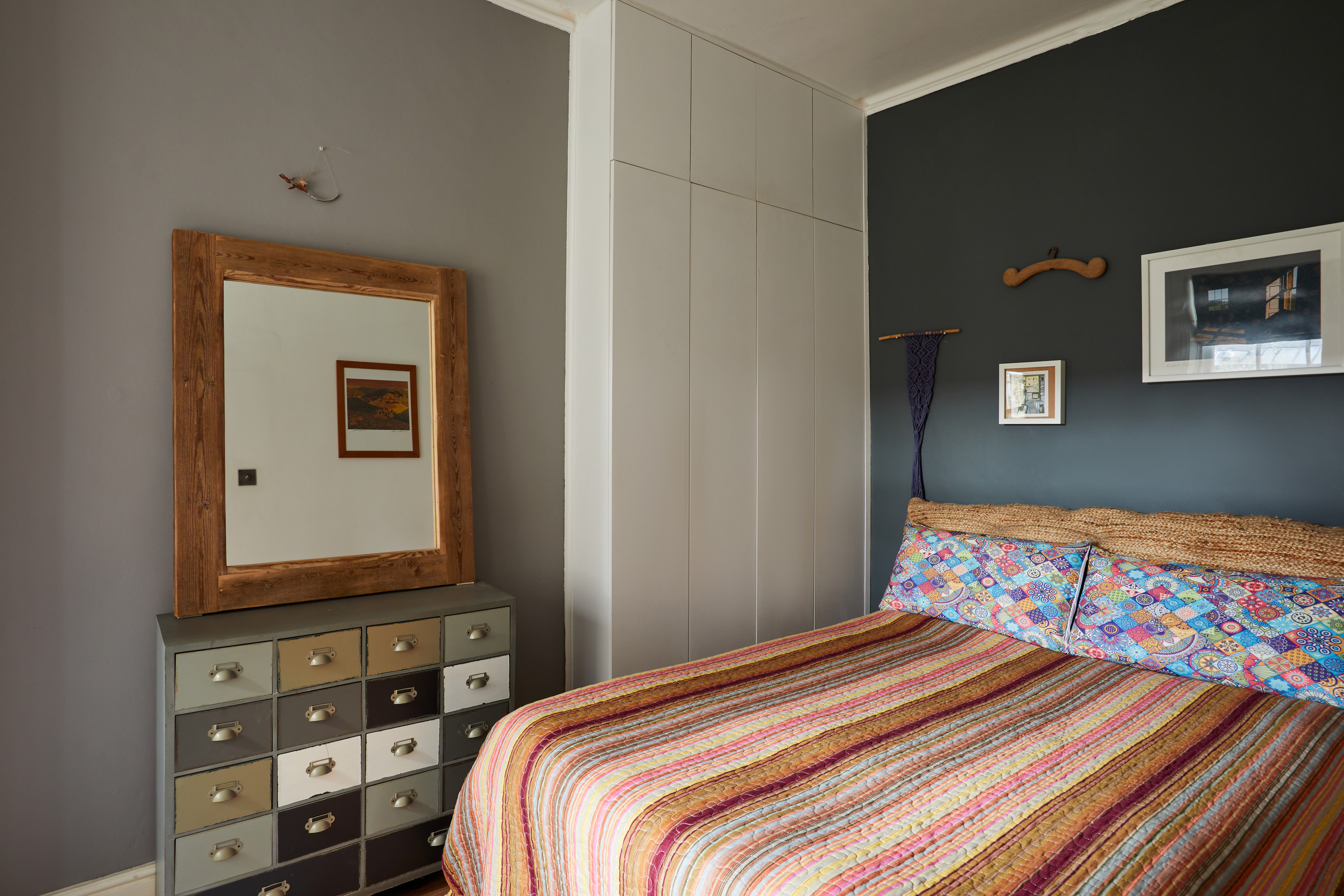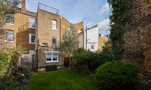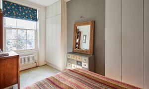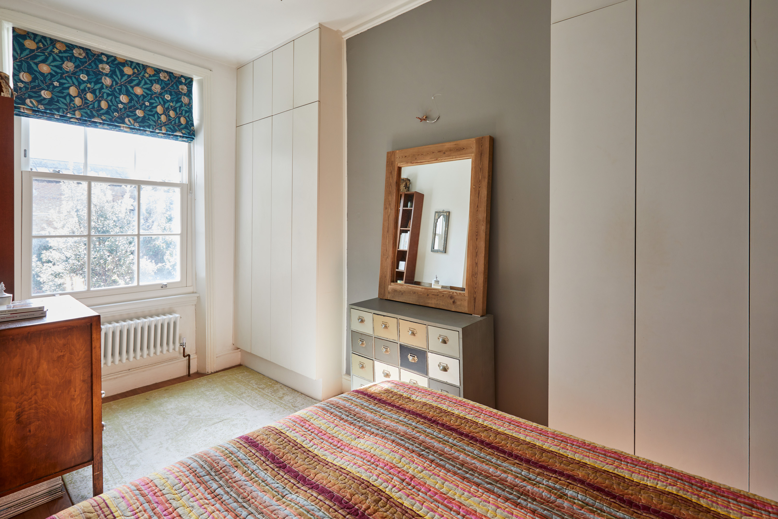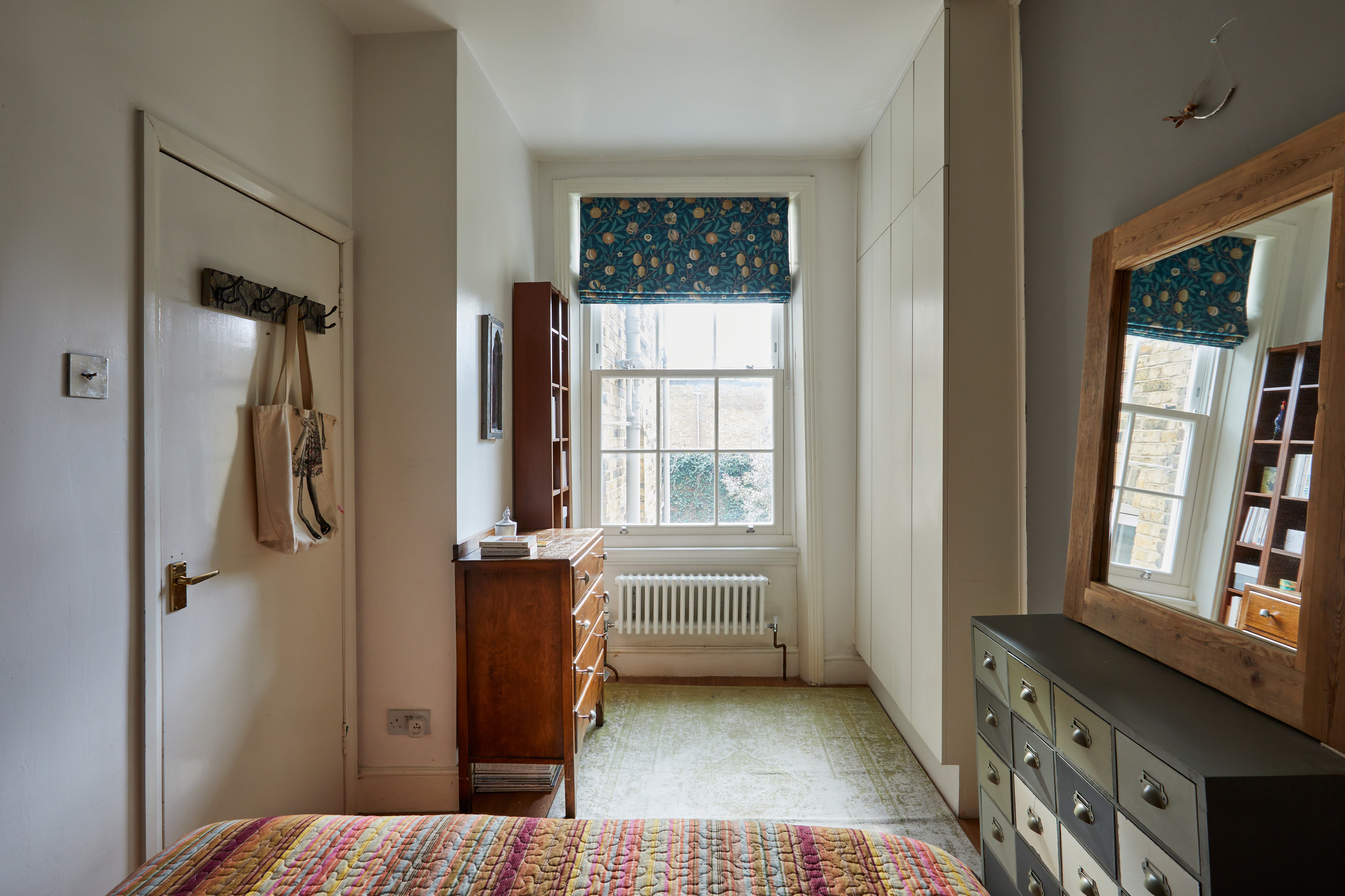 The layout is simple and functional, as you would hope with a classic two-bedroom conversion. The open-plan living space is at the front, where a square bay window overlooks the street below. Down the corridor, the first bedroom has built-in storage on either side of the chimney breast and views of the garden. Down a short flight of steps, the bathroom fits the brief, with the second bedroom at the back of the house. Here, you discover the added perk of a sun-trap private terrace, which the owner has completely refurbished, with south-facing views of the communal garden below.