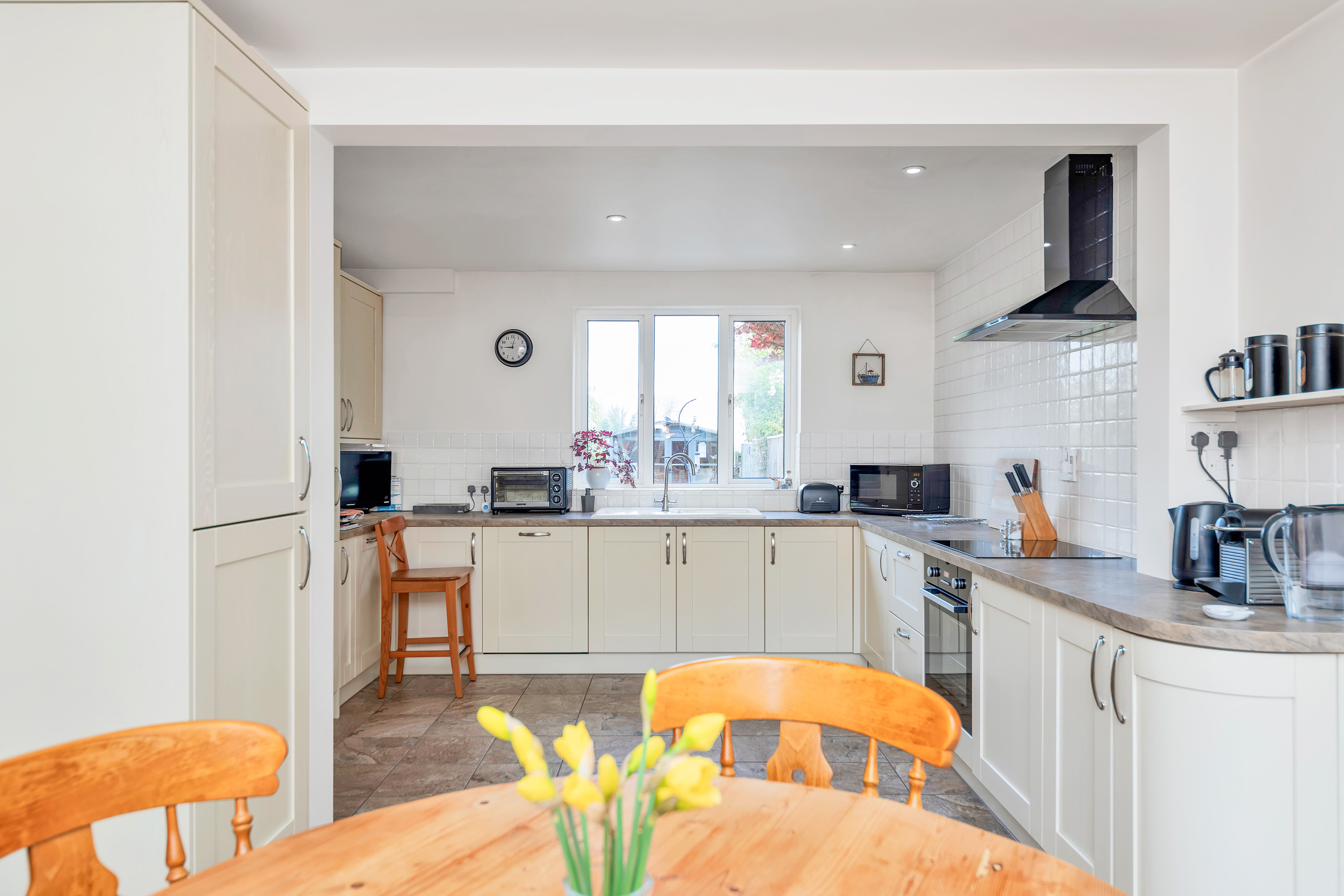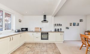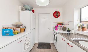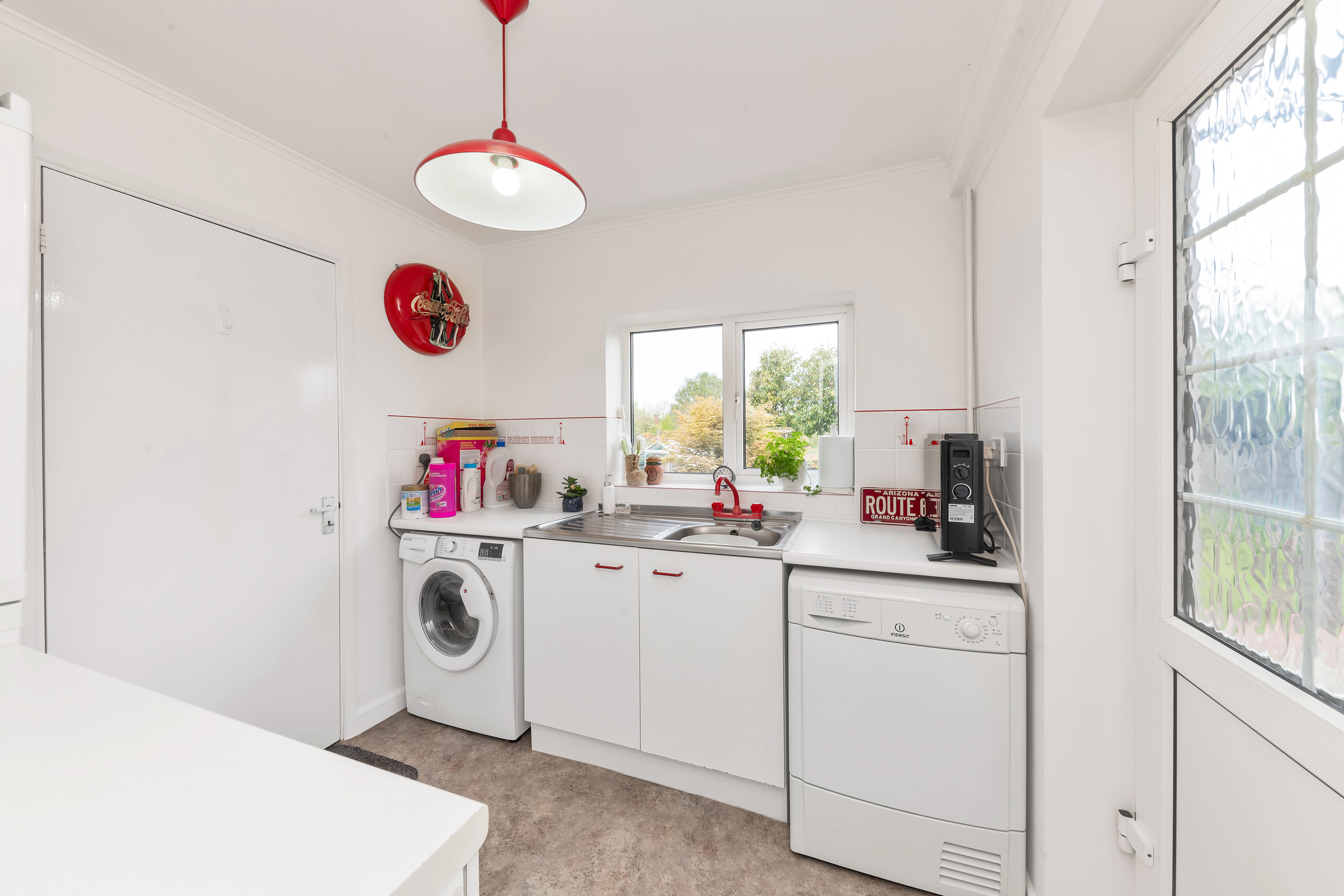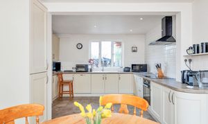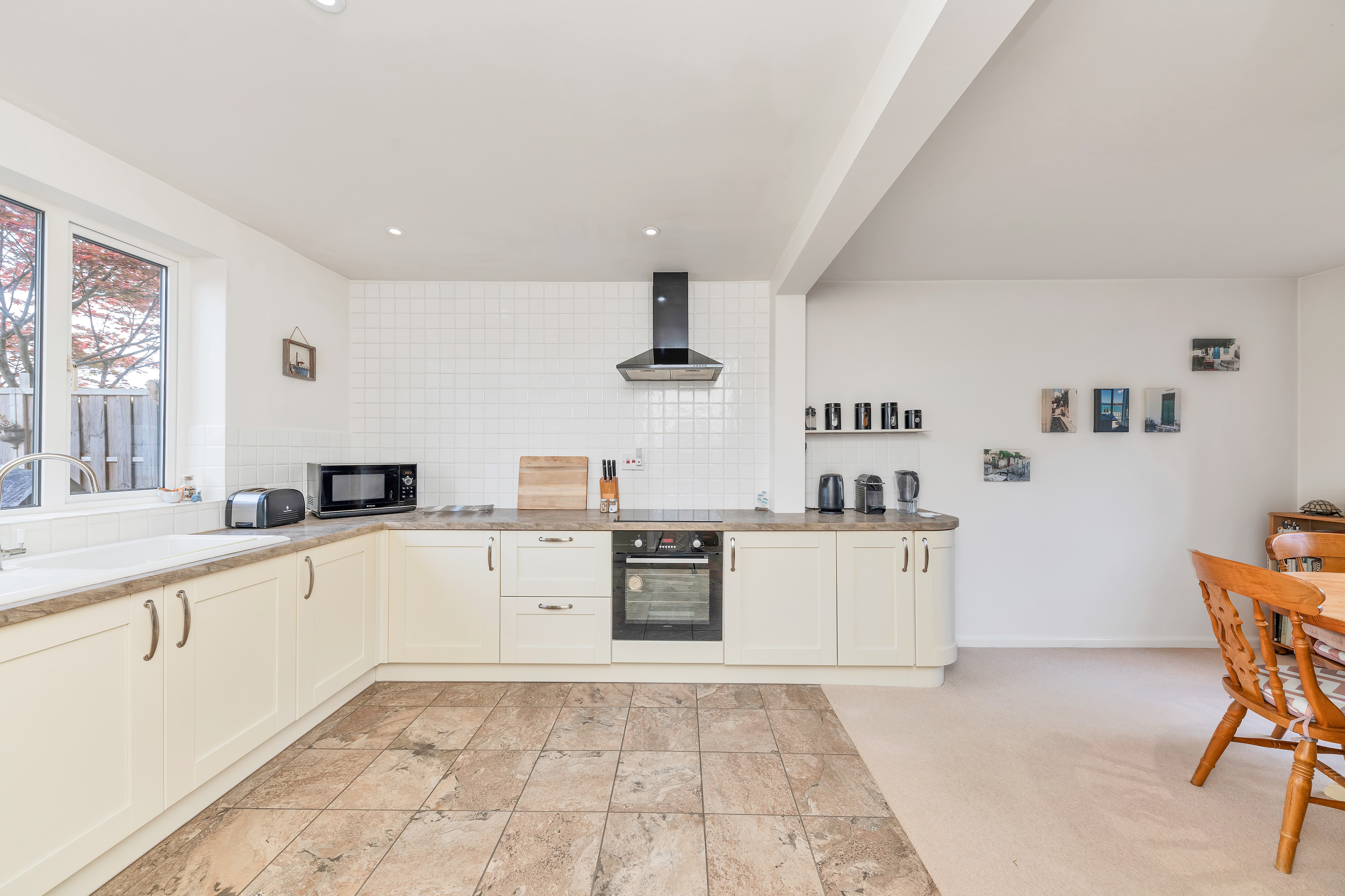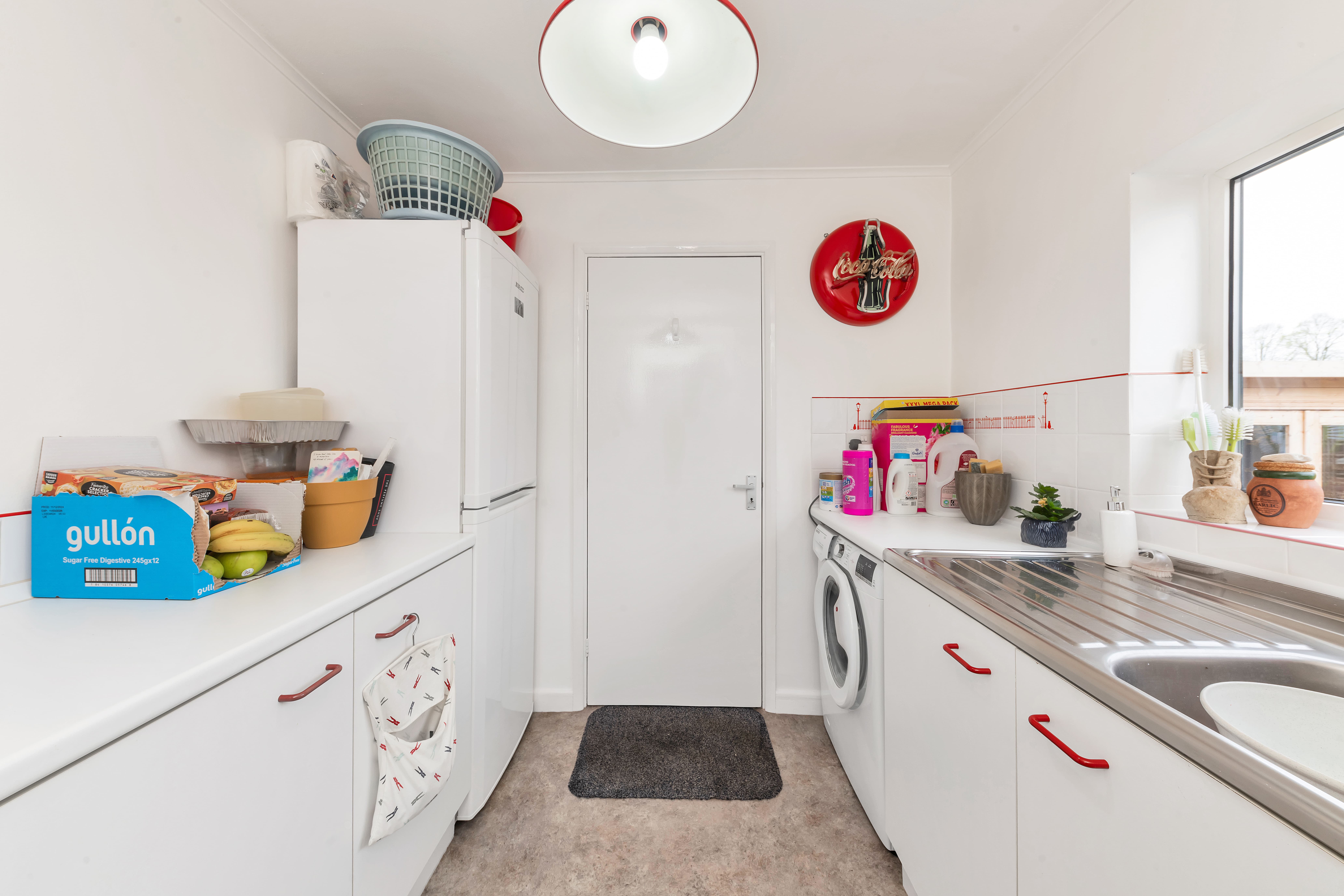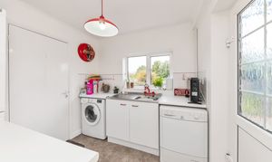 The modern fitted kitchen/dining room is wonderfully open-plan and bright, benefiting from a window to a front aspect, an extensive range of cream base and wall units, laminate worktops, tiled flooring and splashbacks, an extractor hood, an integrated oven, hob, dishwasher and fridge/freezer, and space for a large dining setting and other small kitchen appliances. The utility room provides further storage, access to the rear of the property and to the garage, and space for large laundry appliances.