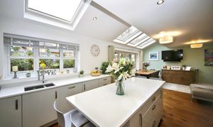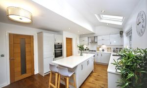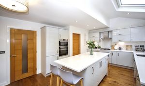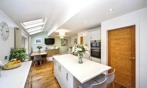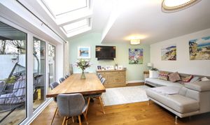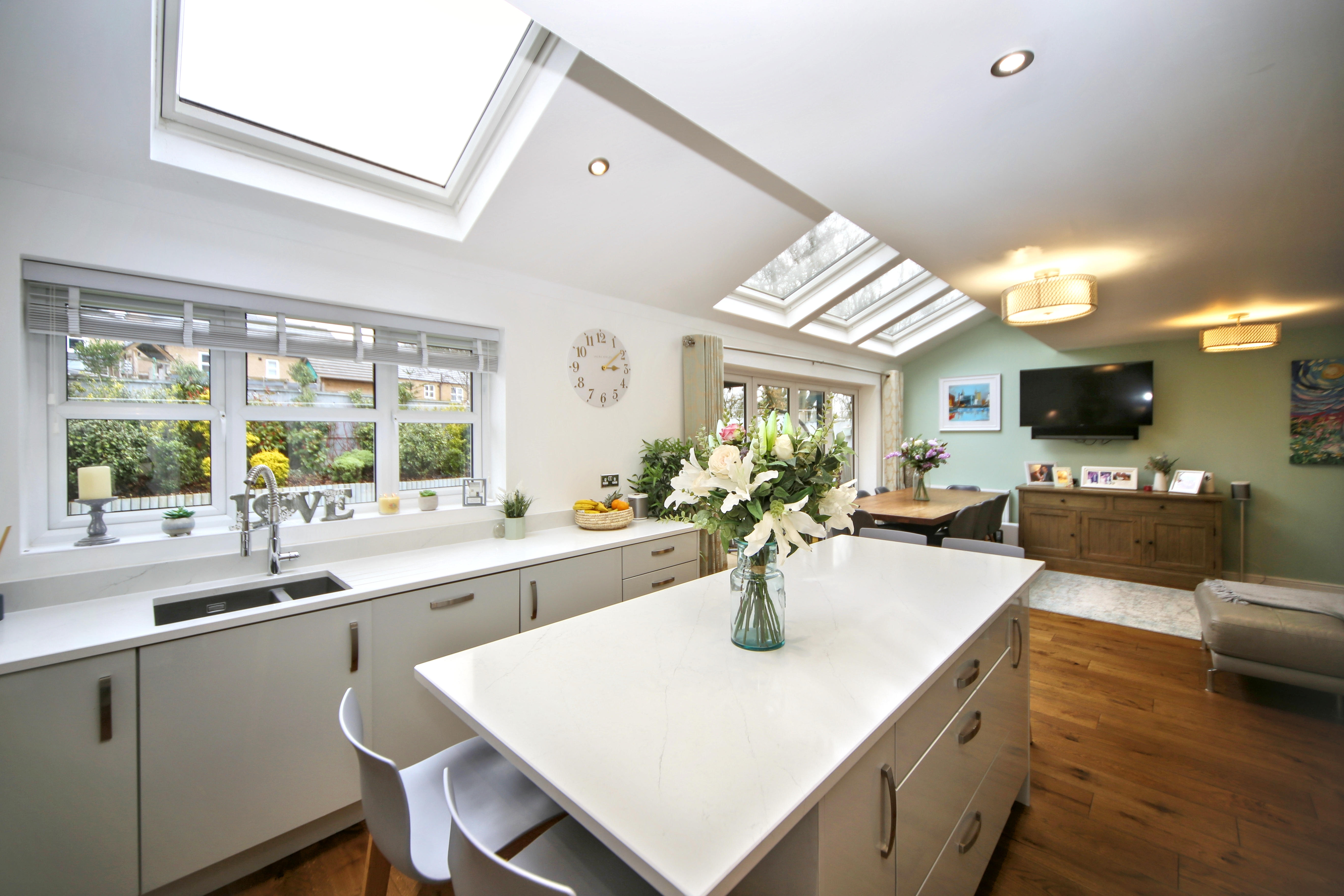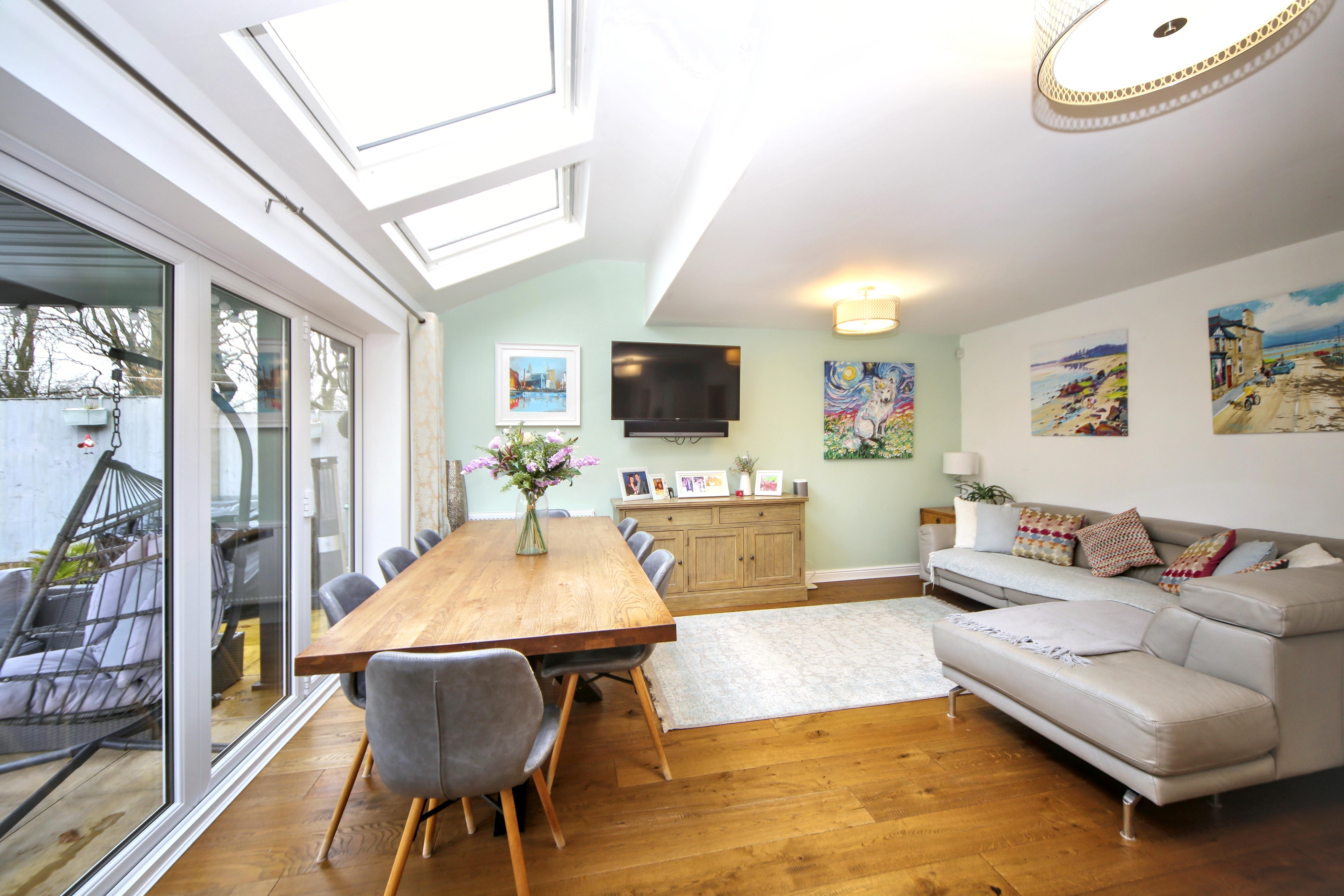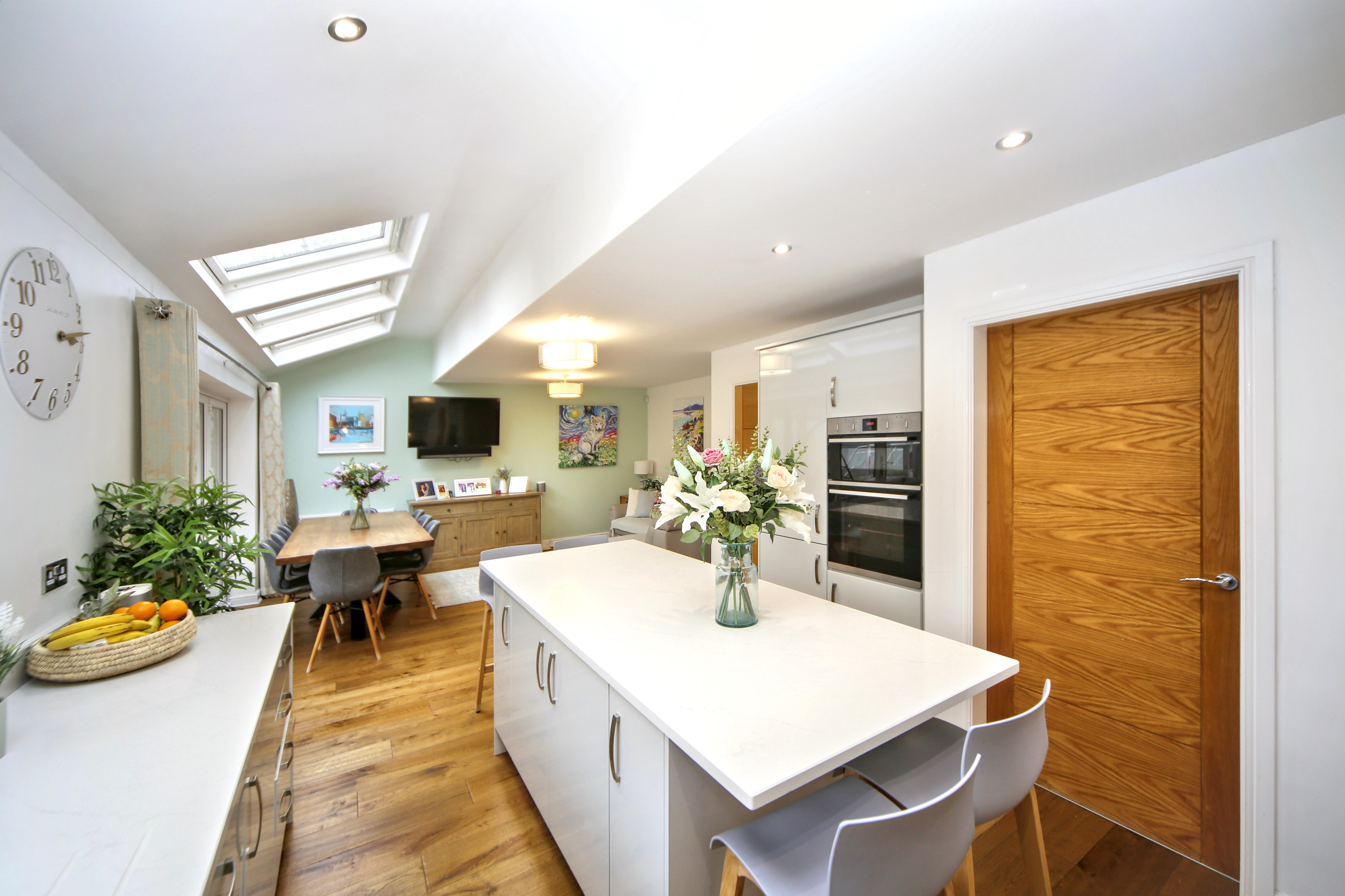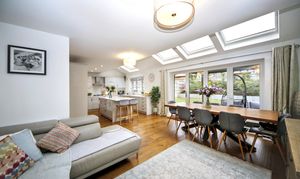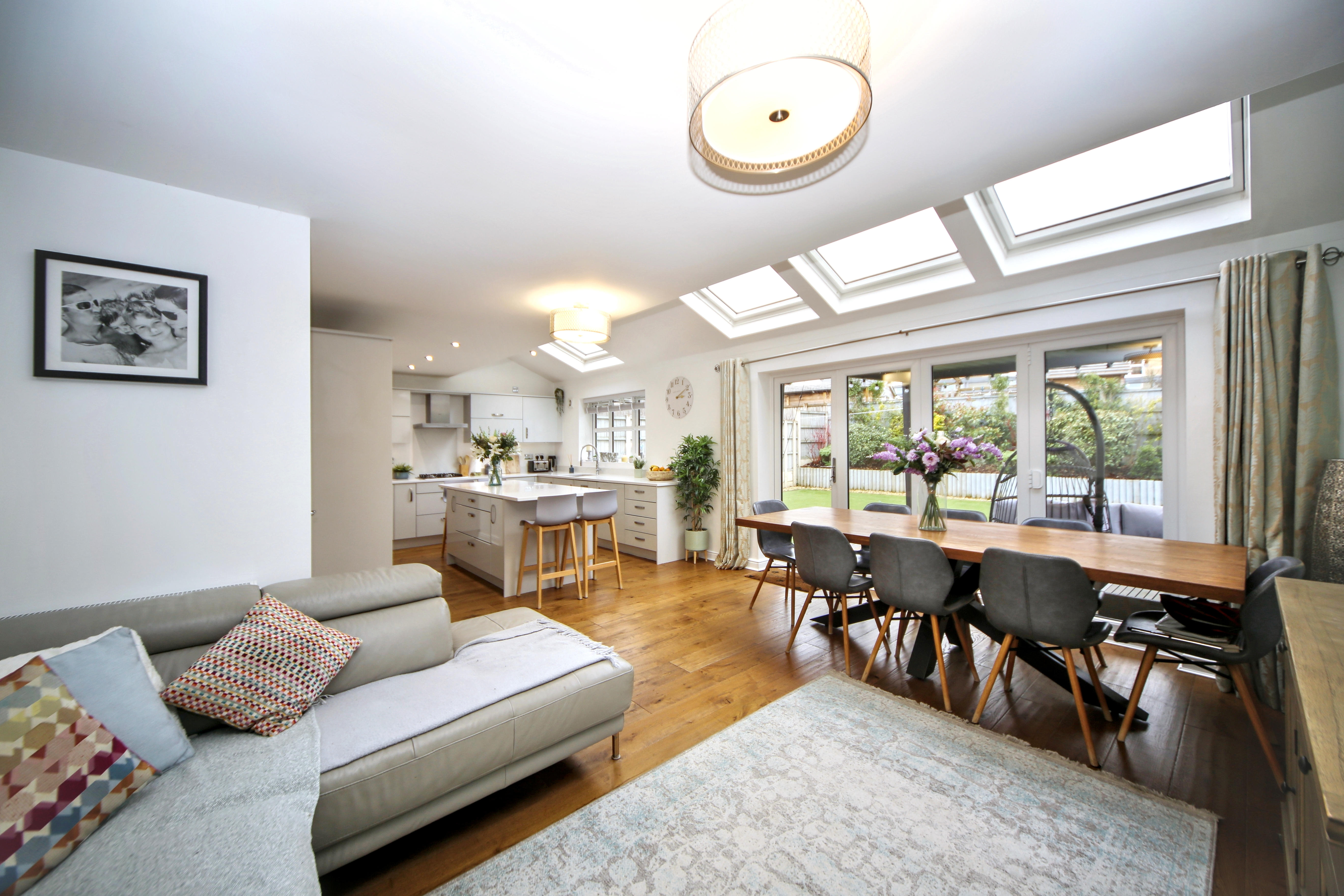The heart of the home is the stunning open-plan kitchen and dining area, beautifully designed with Velux windows that flood the space with natural light. Boasting solid wood flooring, a breakfast area, and impressive bi-folding doors opening onto the rear garden, this space is perfect for both everyday living and hosting guests. A separate utility room adds further practicality.