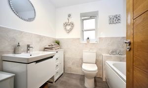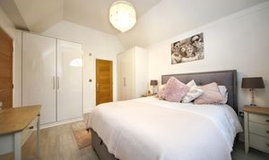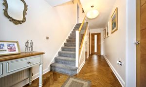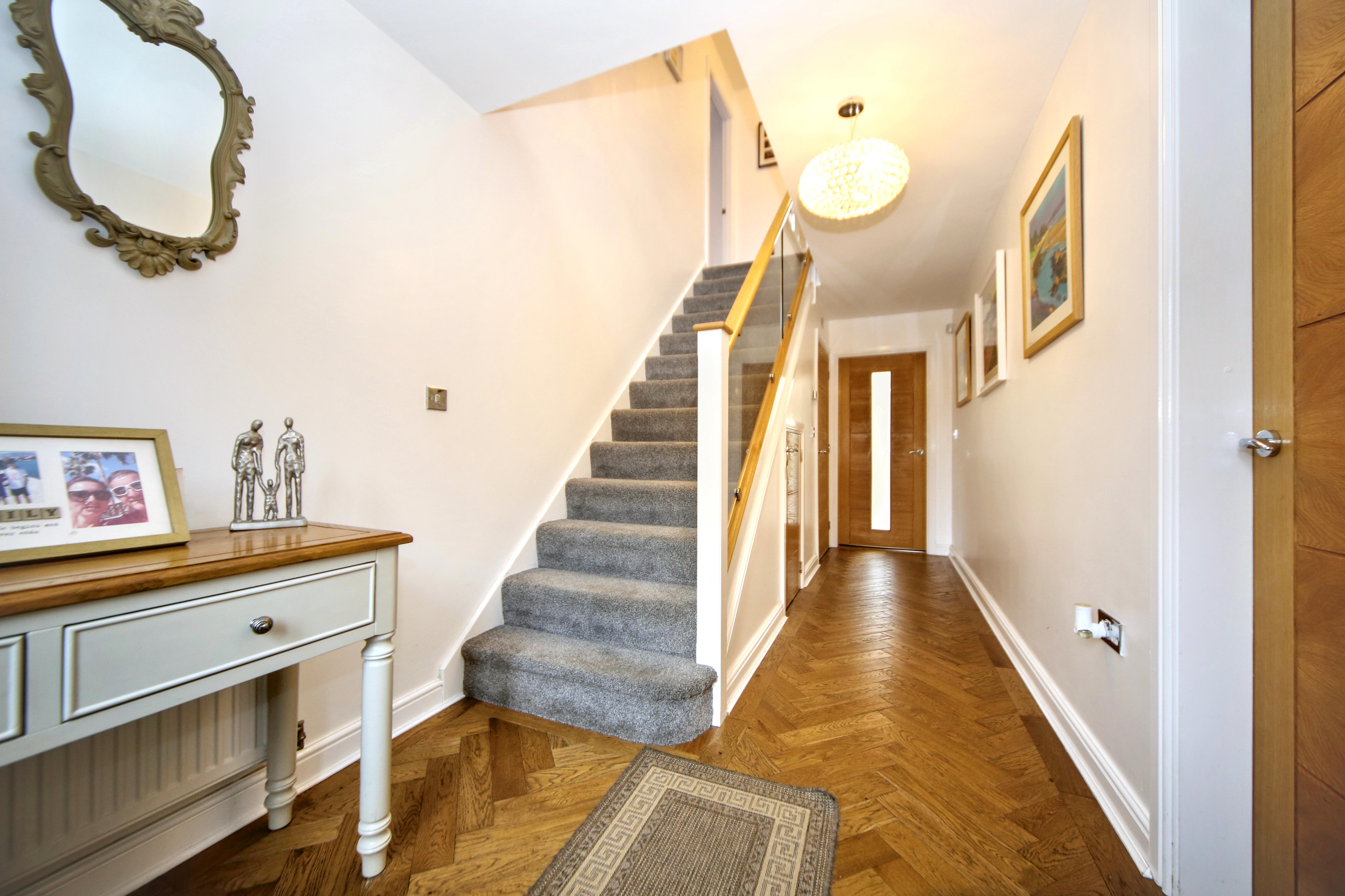 A striking glass and oak staircase leads to the first floor, where you will find four well-proportioned bedrooms. The master bedroom benefits from a stylish en-suite, while a modern family bathroom serves the remaining rooms.