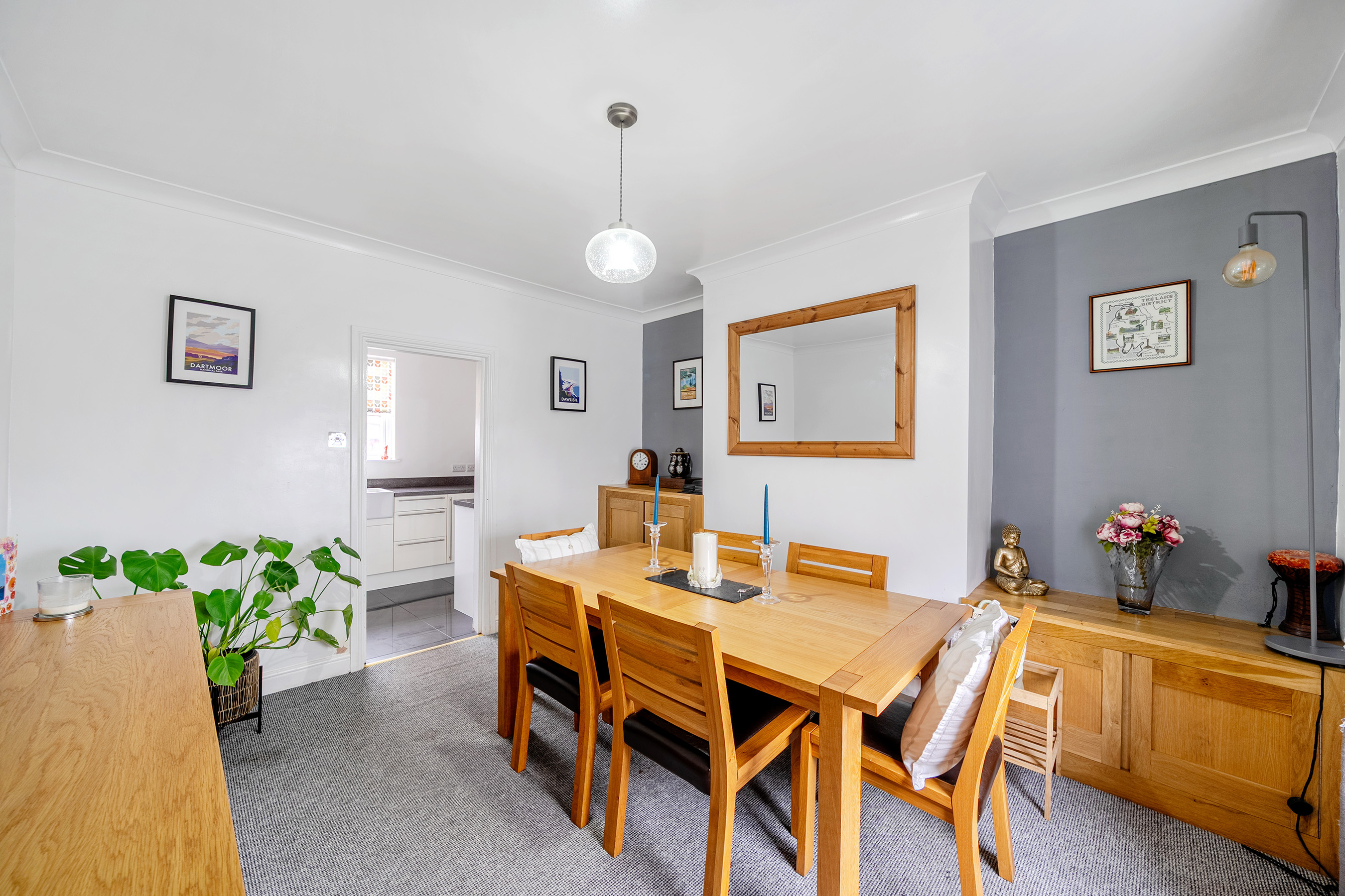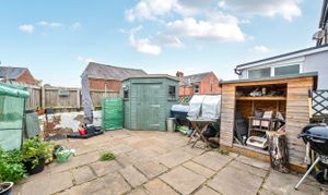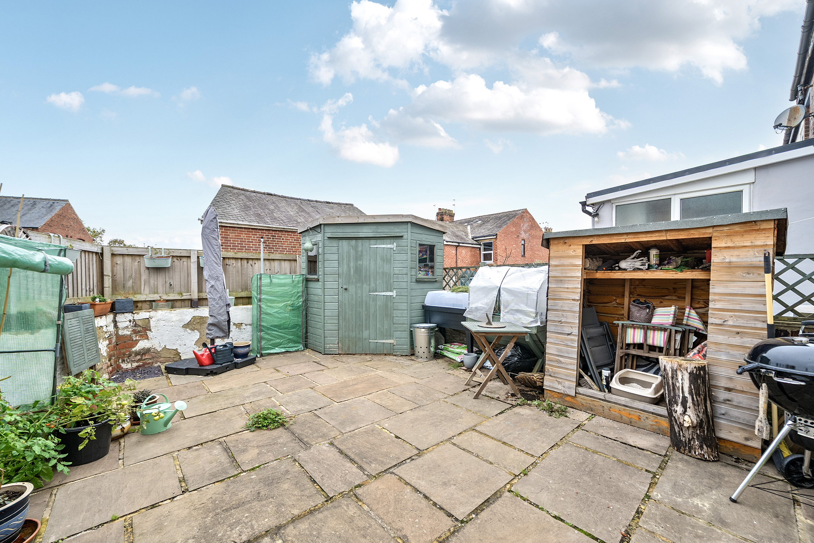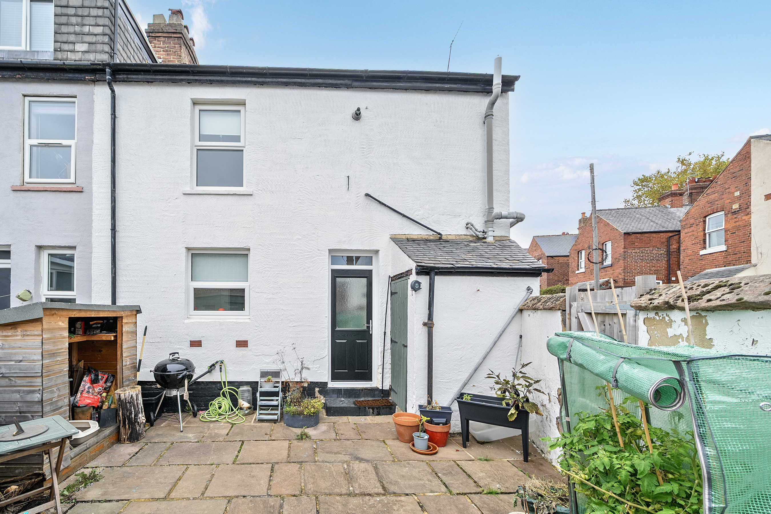 The front door opens to the bright entrance hallway, which branches off to the reception room with charming feature fireplace, and the dining room with ample fitted storage and space for dining or entertaining. The dining room also provides access to the kitchen, which has extensive counter space and was recently renovated. From here, there is access to the spacious rear garden, laid to slabs, and featuring a storage outbuilding and a wooden shed.