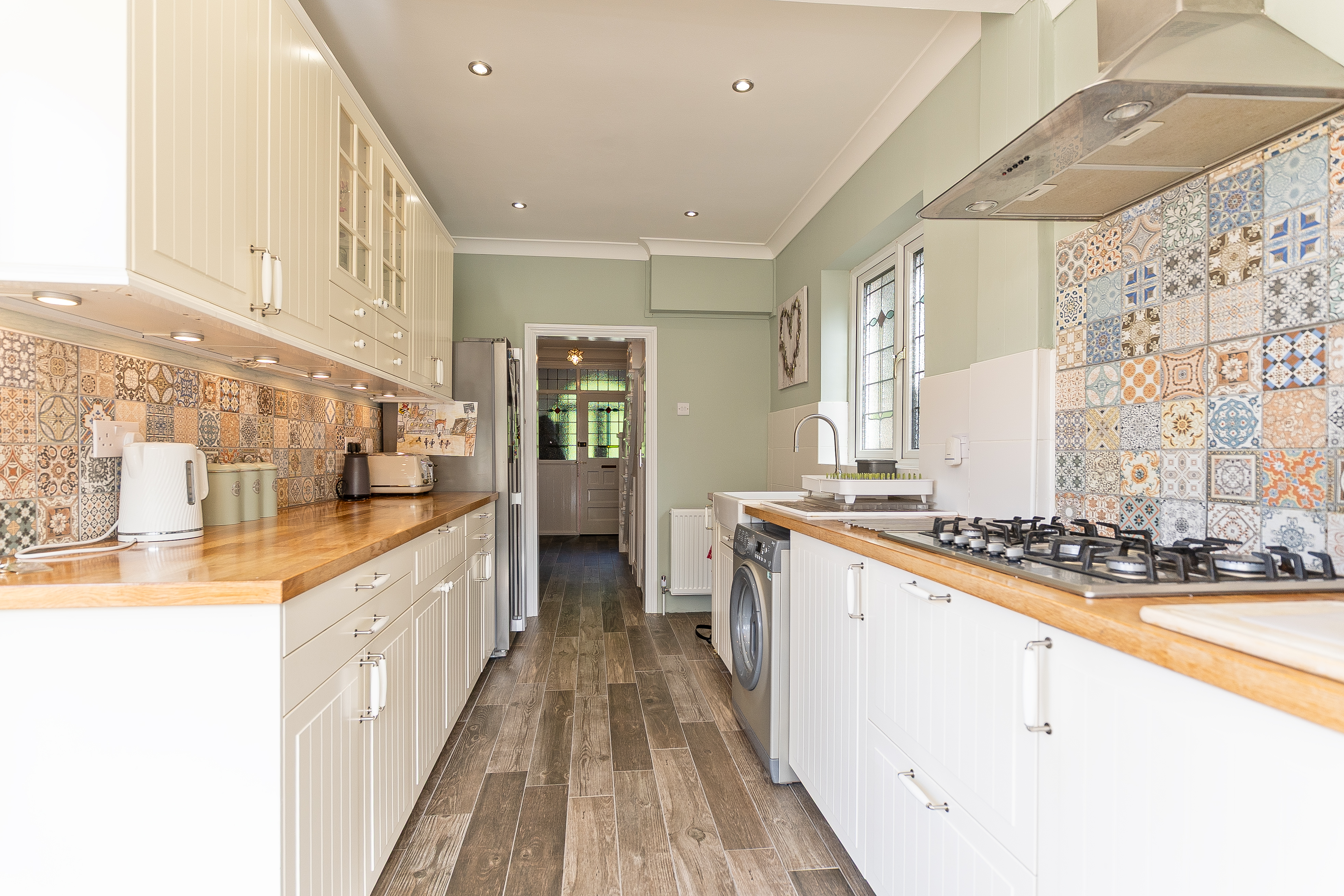 To the rear of the home is a kitchen that is both stylish and functional, featuring a range of fitted units, generous worktop space, and a breakfast bar area that overlooks the garden – ideal for casual dining or morning coffee.