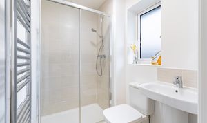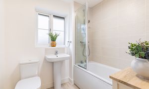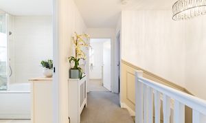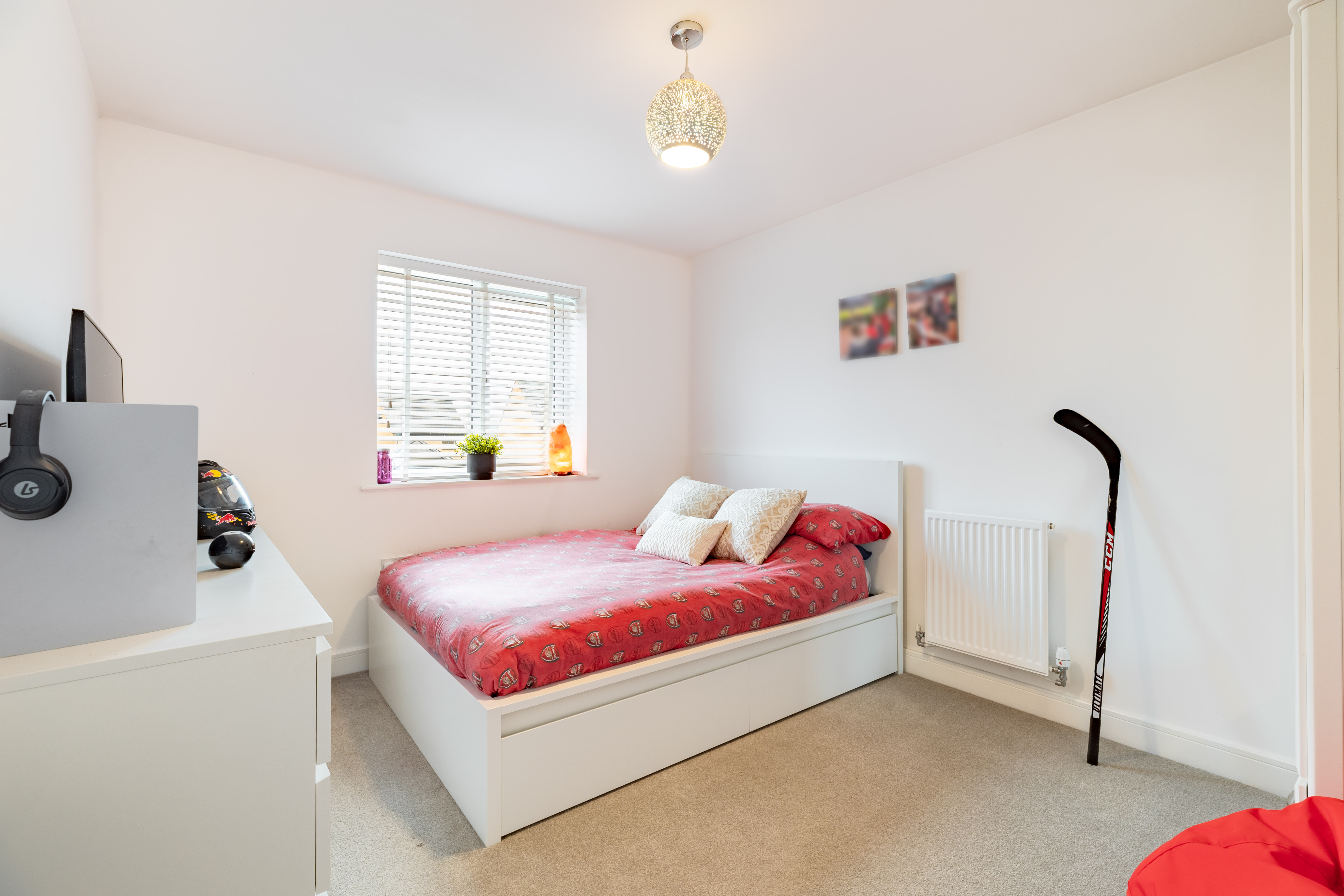 Upstairs, the first floor offers four well-balanced bedrooms arranged around the central landing. The principal bedroom enjoys generous proportions, while the remaining bedrooms provide flexibility for family living, guests or homeworking. A modern family bathroom serves the floor, finished in a clean, contemporary style. The detached garage sits alongside the property, ideal for storage, hobbies or secure parking.