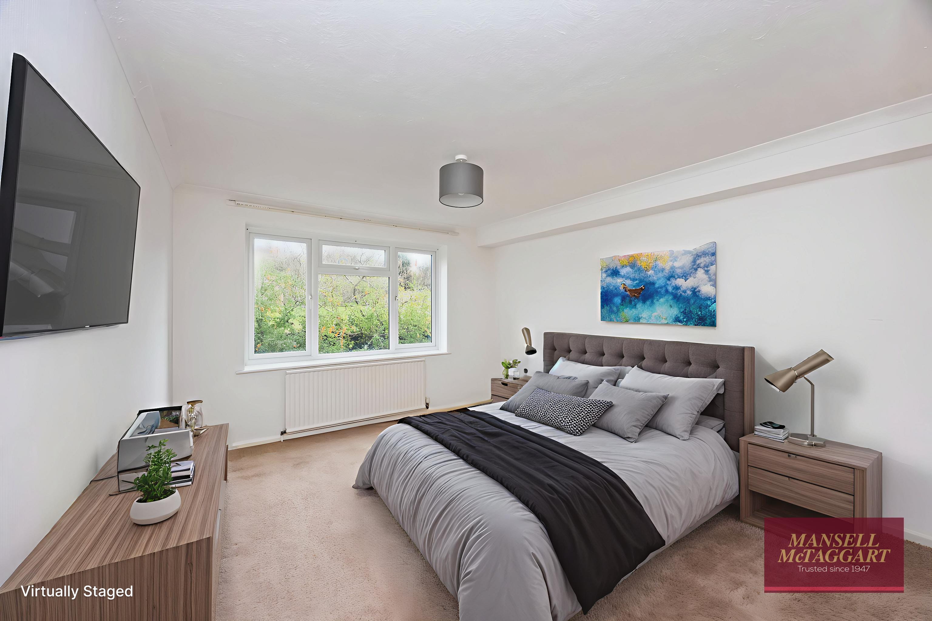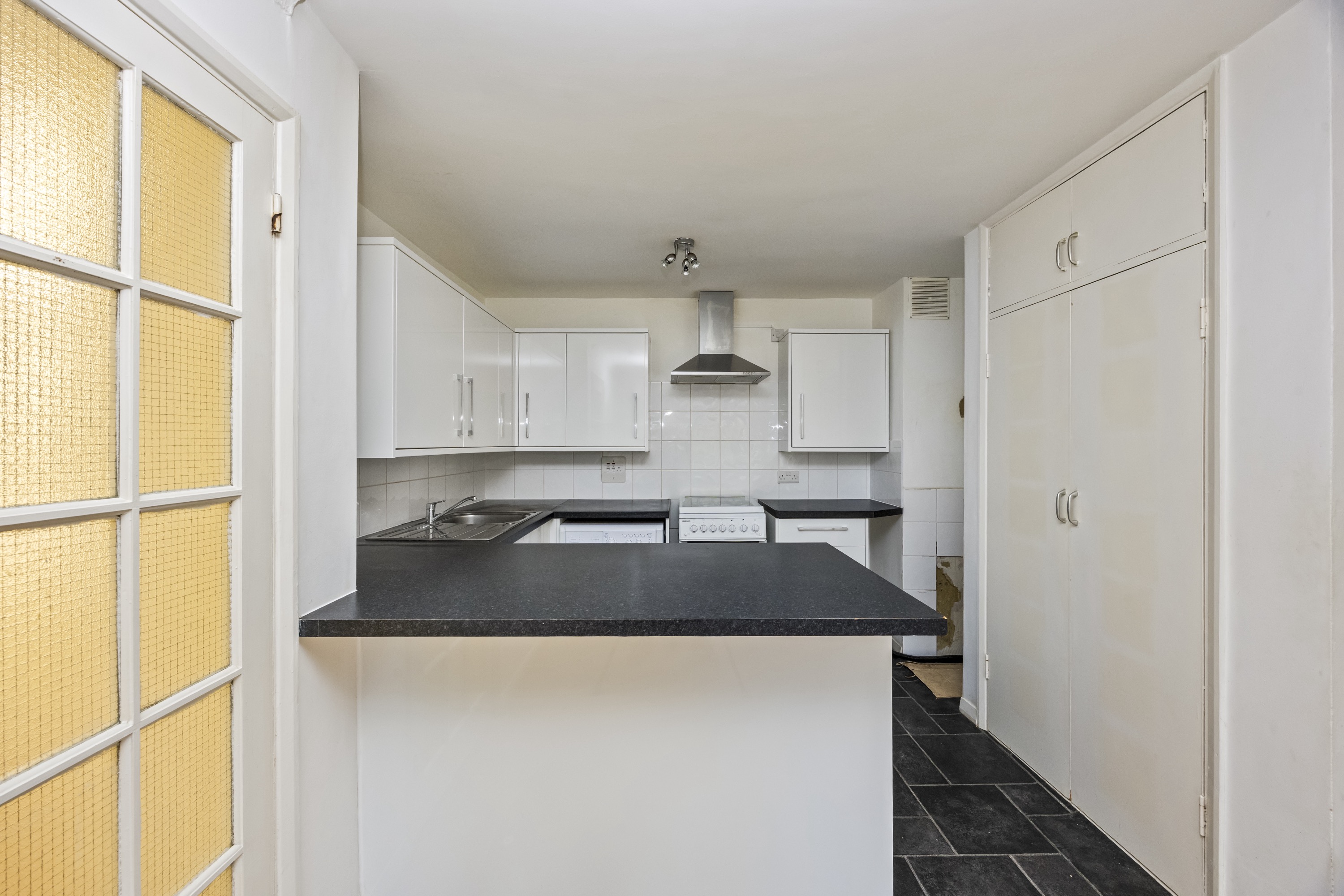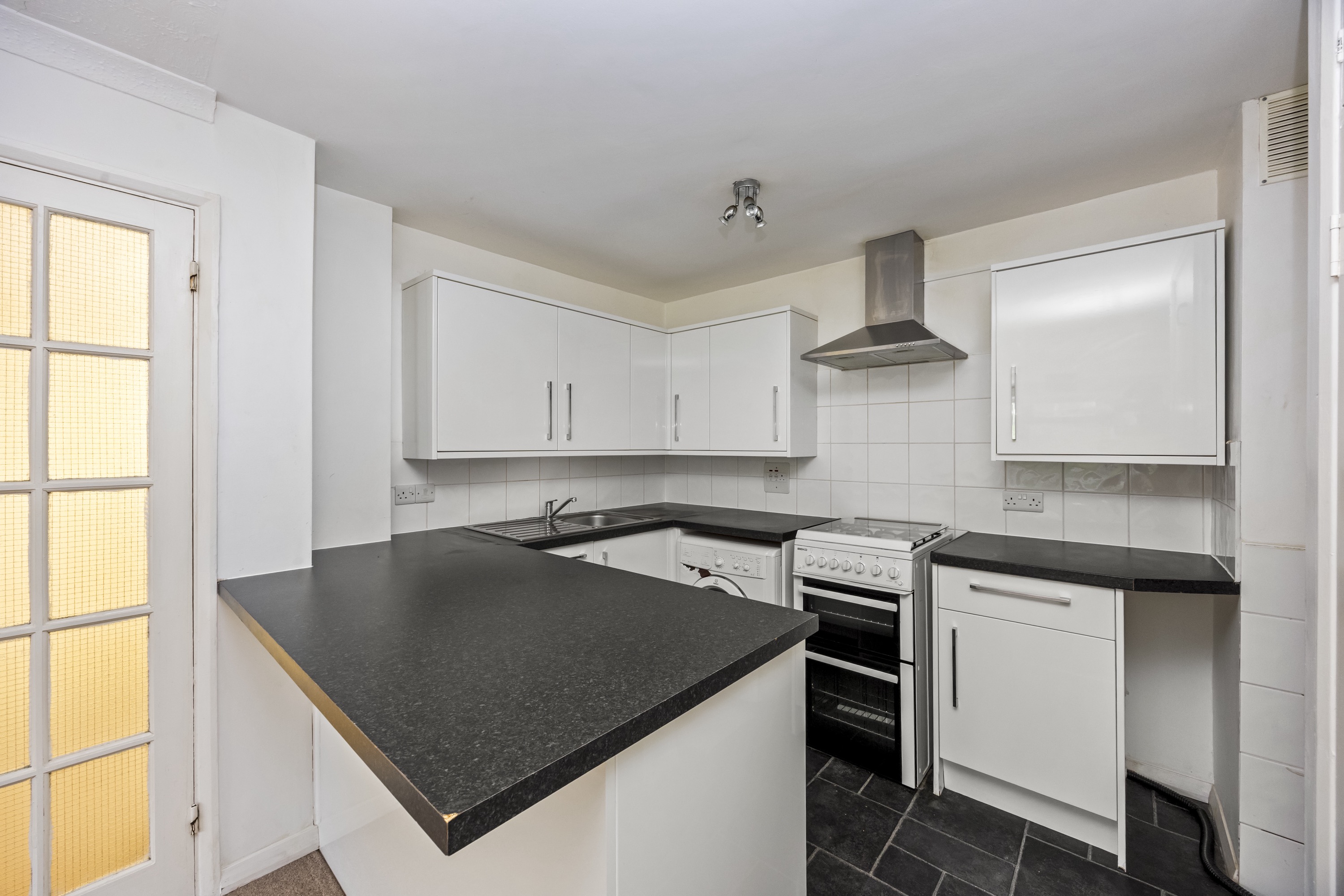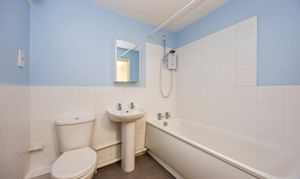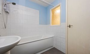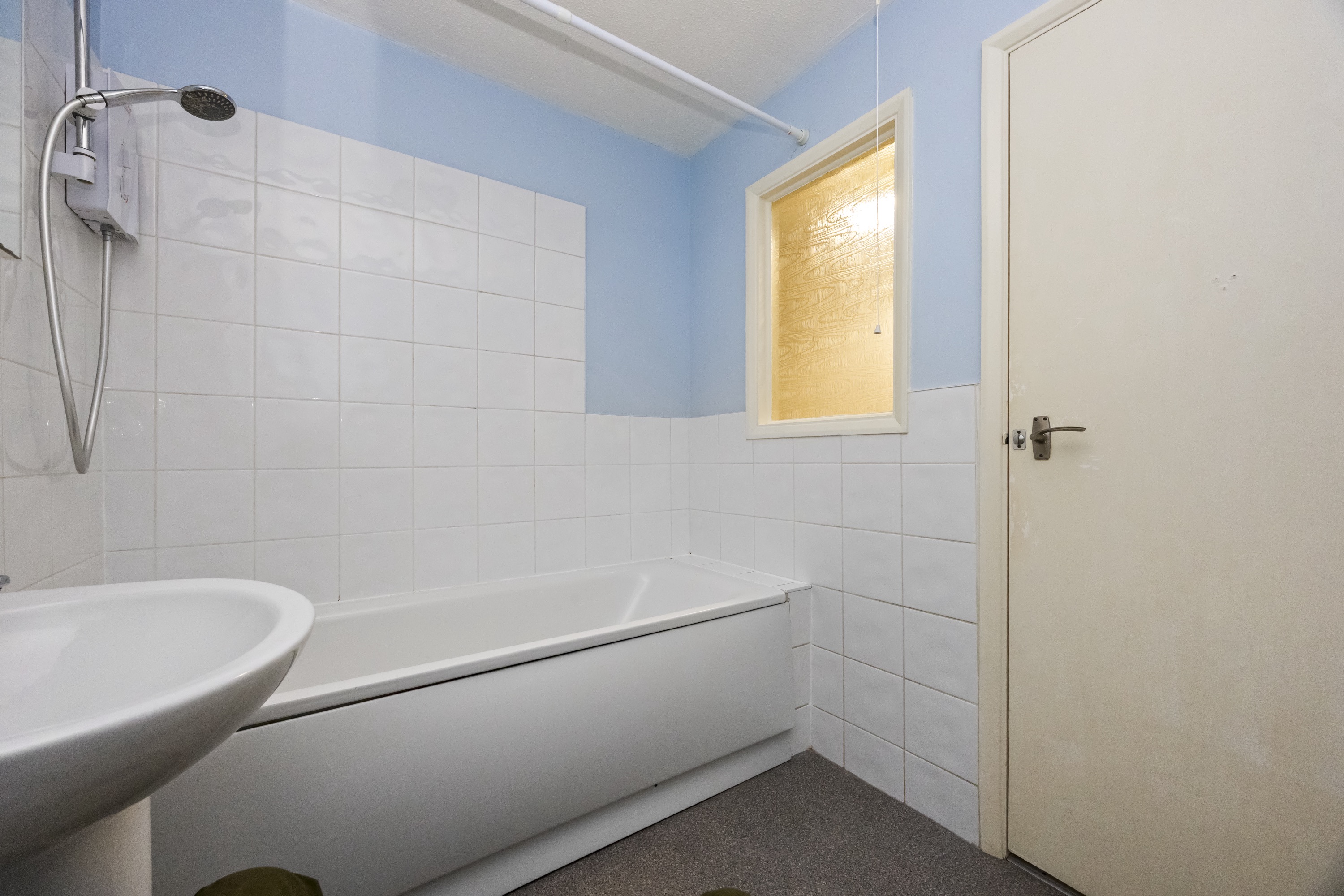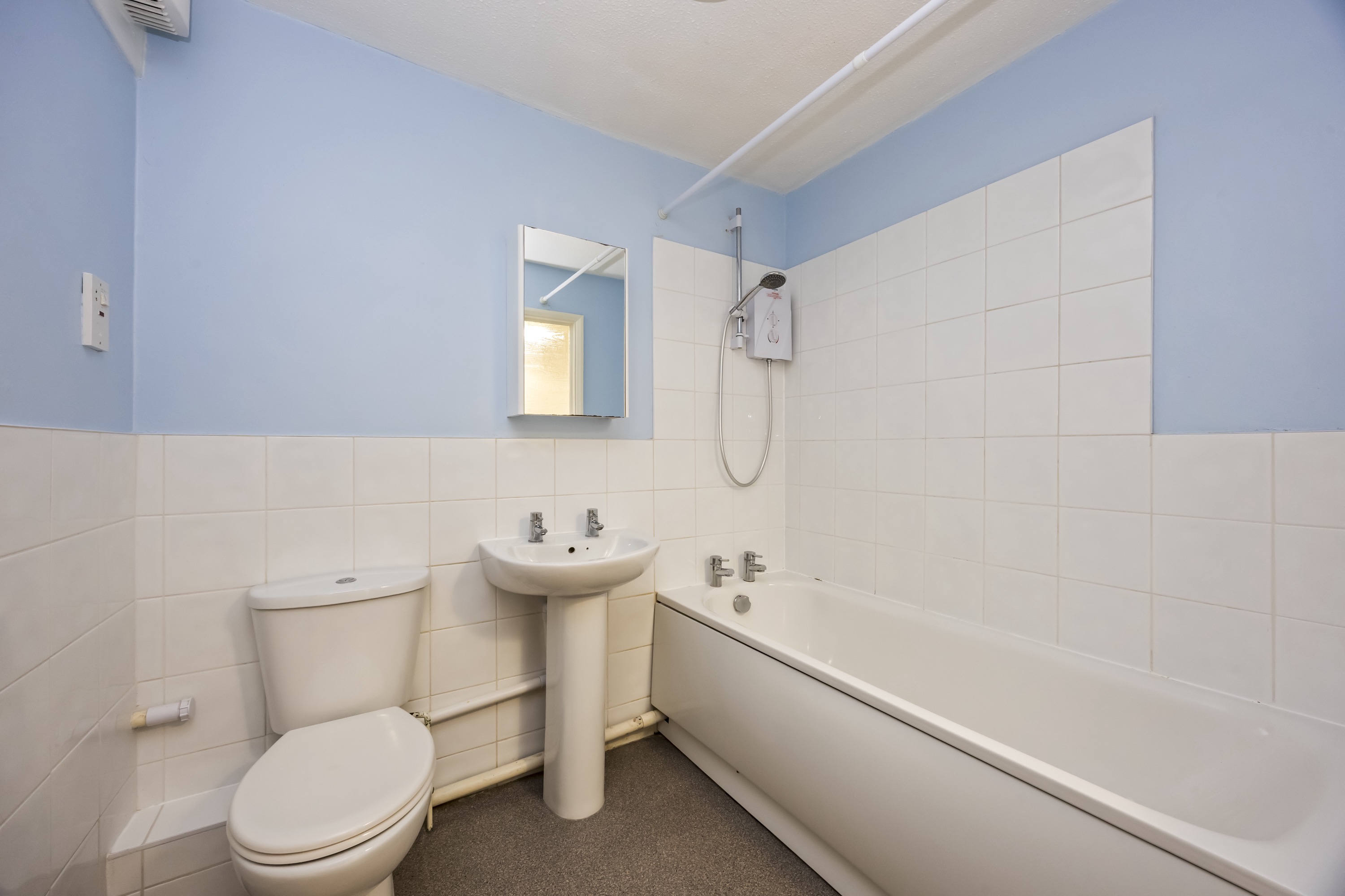 The double bedroom also overlooks the rear and benefits from integrated storage whilst, adjacent, the partially-tiled bathroom features a bath with shower overhead.