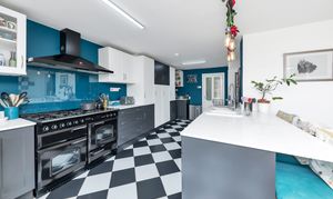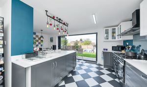 The large ‘L’-shaped kitchen/dining room is wonderfully open-plan and bright, benefiting from beautiful bi-fold doors out onto the garden terrace, making it an excellent entertaining space. It enjoys an extensive range of modern base and wall units, composite worktops, a large island/breakfast bar, a range cooker, tiled flooring, an extractor hood, an integrated dishwasher, sink with waste disposal unit, and space for an American fridge/freezer, and other small kitchen appliances. The utility room provides further storage, access to the side of the property and to a store room, and space for large laundry appliances.