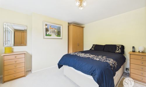 Double bedroom with carpet flooring, double glazed uPVC window, panel radiator.