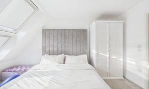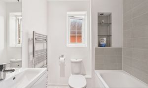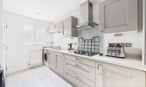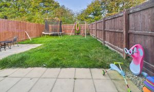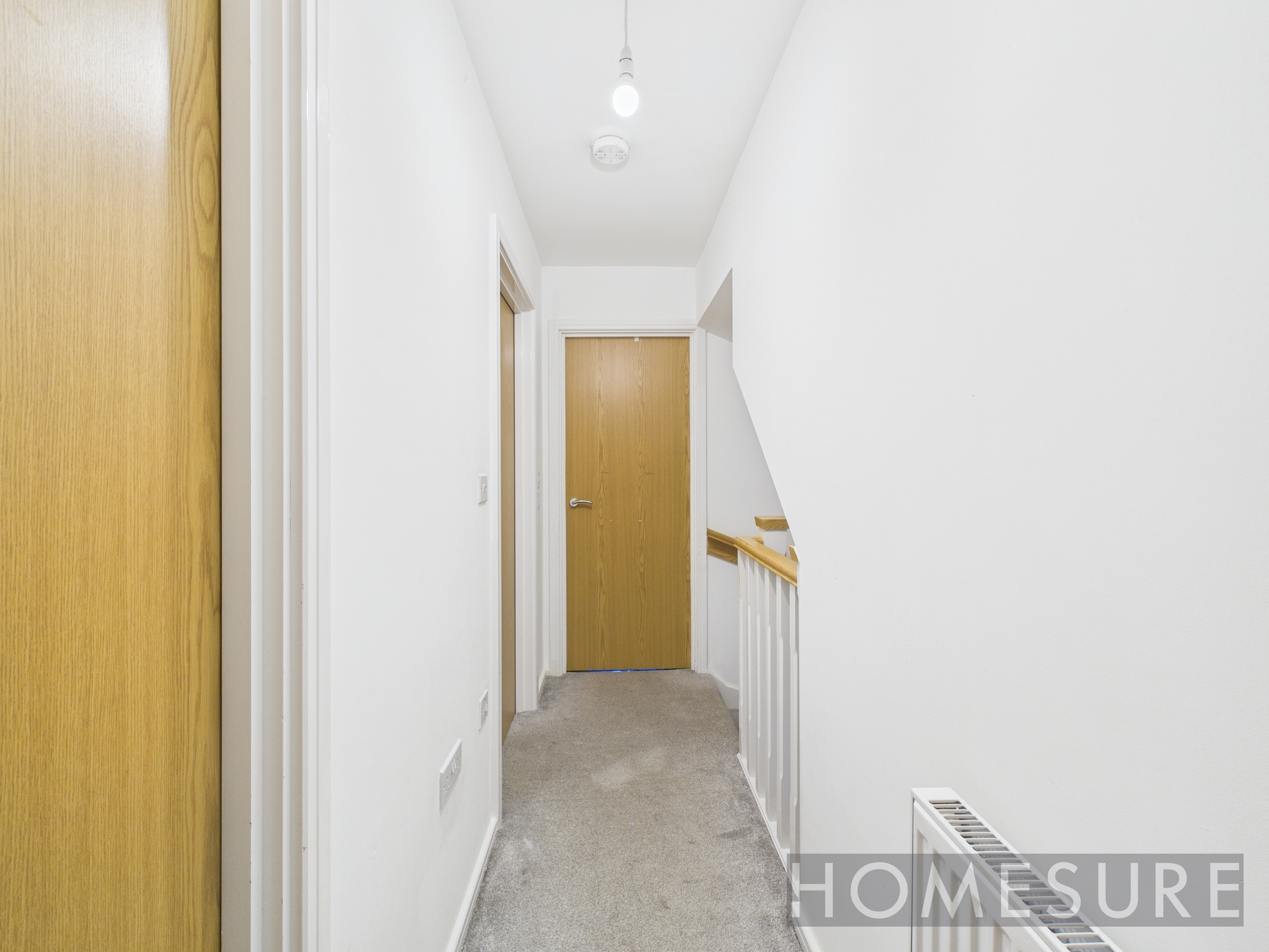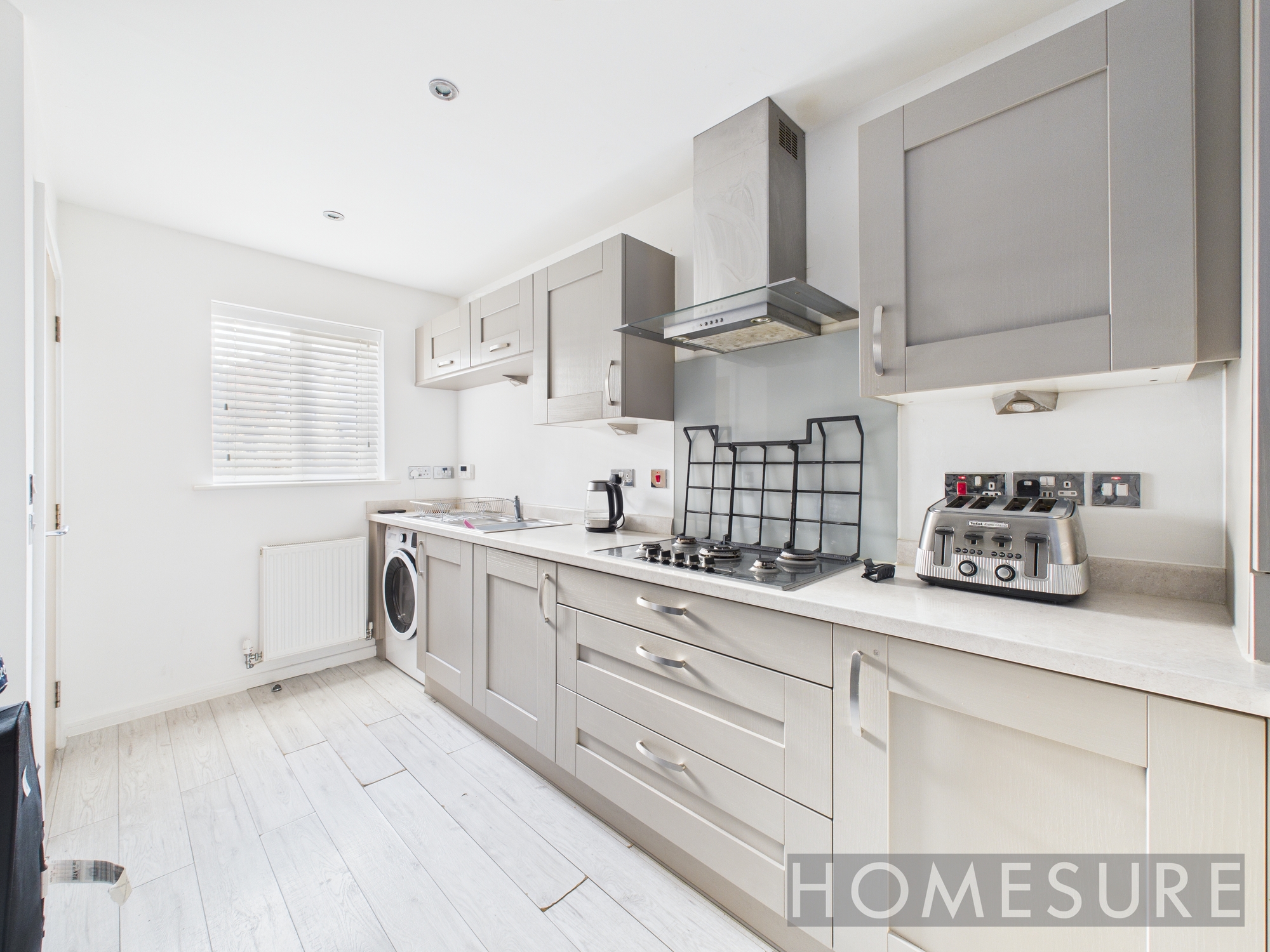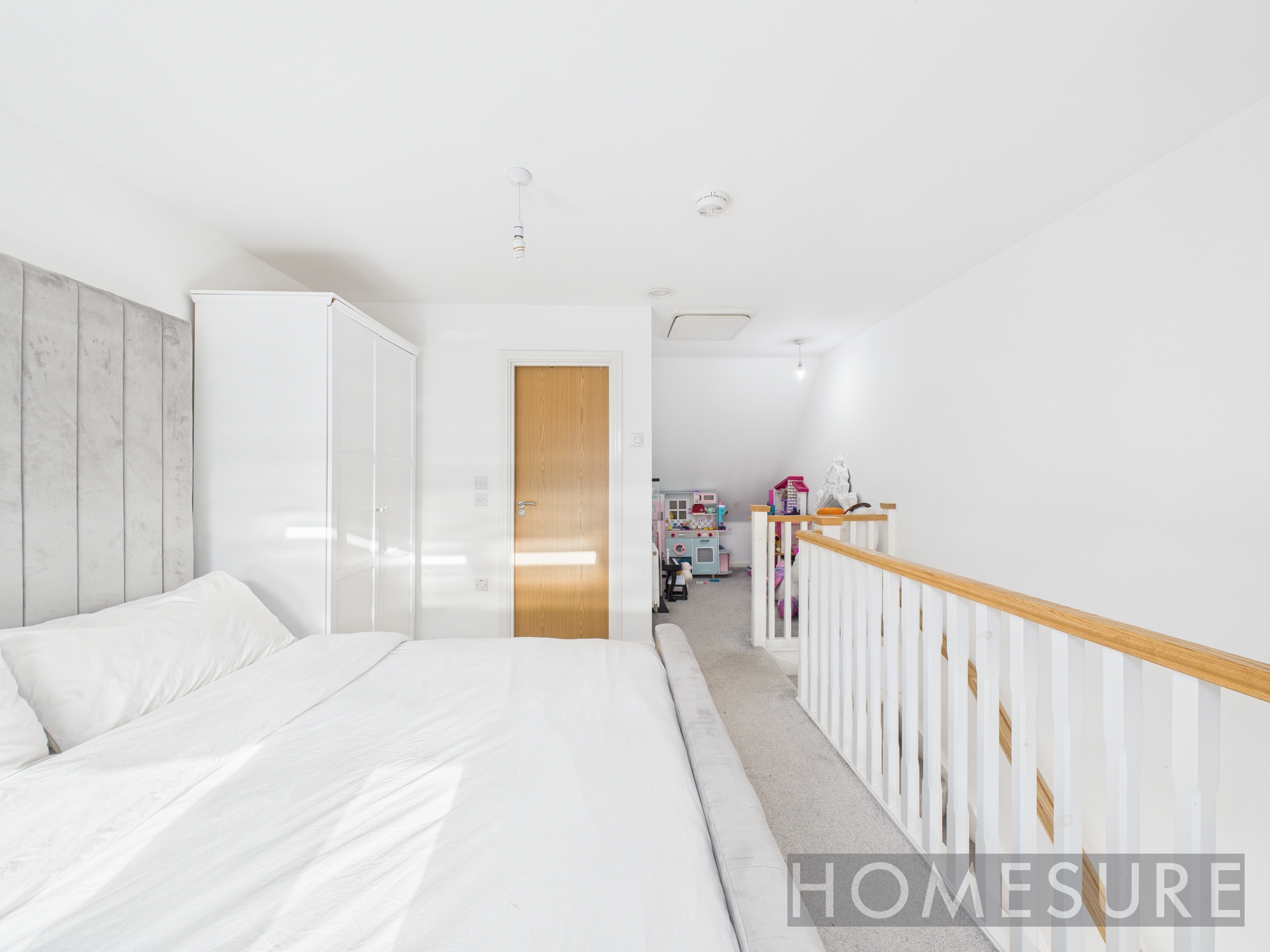 Upstairs, each bedroom is thoughtfully designed with ample storage and modern decor, including a loft-style room with Velux windows for a bright, airy retreat. The bathrooms are finished with sleek modern fixtures - including walk-in showers, towel radiators, and skylights providing both luxury and functionality. Additional touches like the plush-carpeted staircase, wooden handrails, and an abundance of natural light make this property perfect for growing families or professionals needing work-from-home space. Outside, enjoy a spacious garden with a paved patio, enclosed fencing. While off-road parking and a contemporary brick exterior add convenience and kerb appeal. This home truly ticks all the boxes for modern family living.