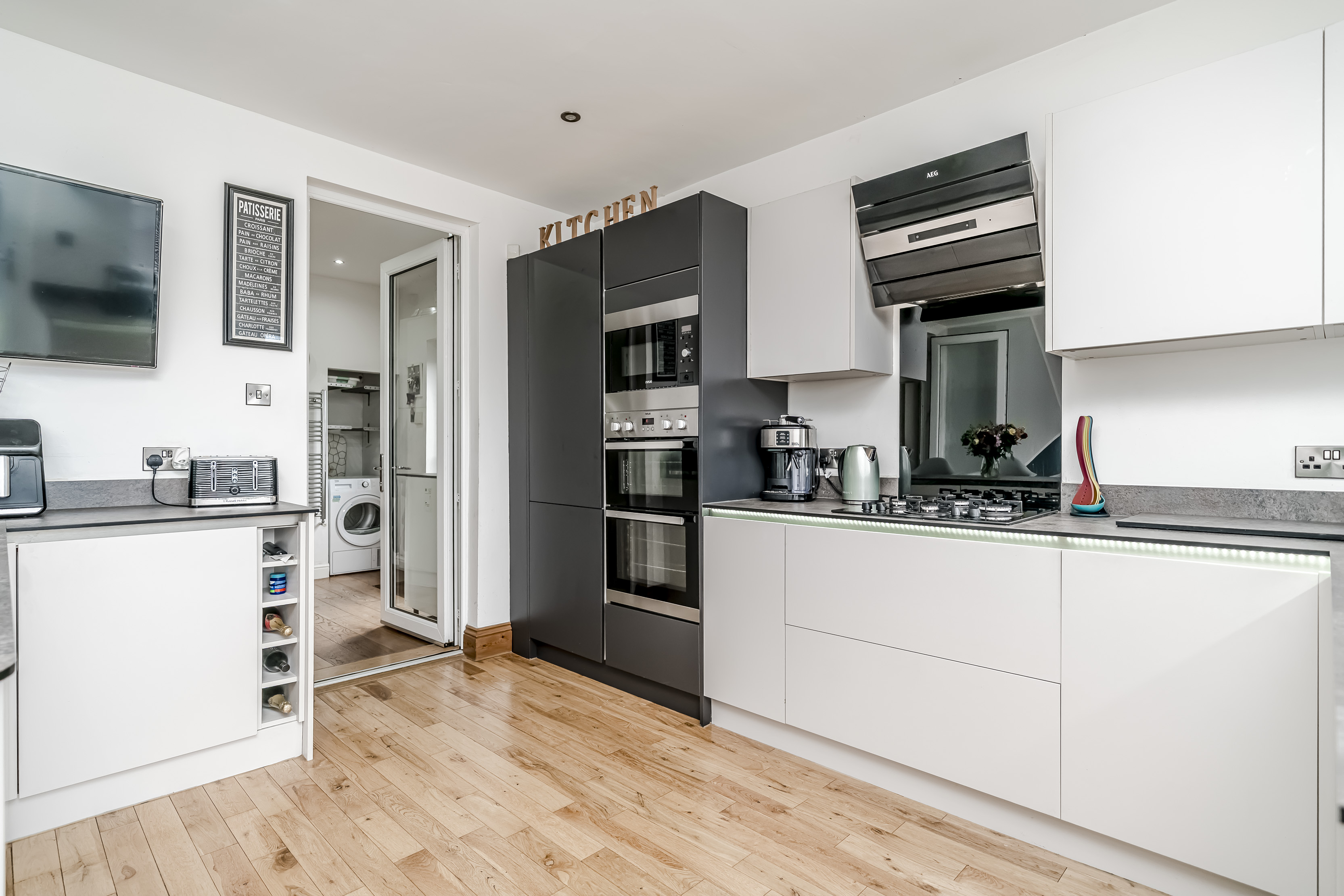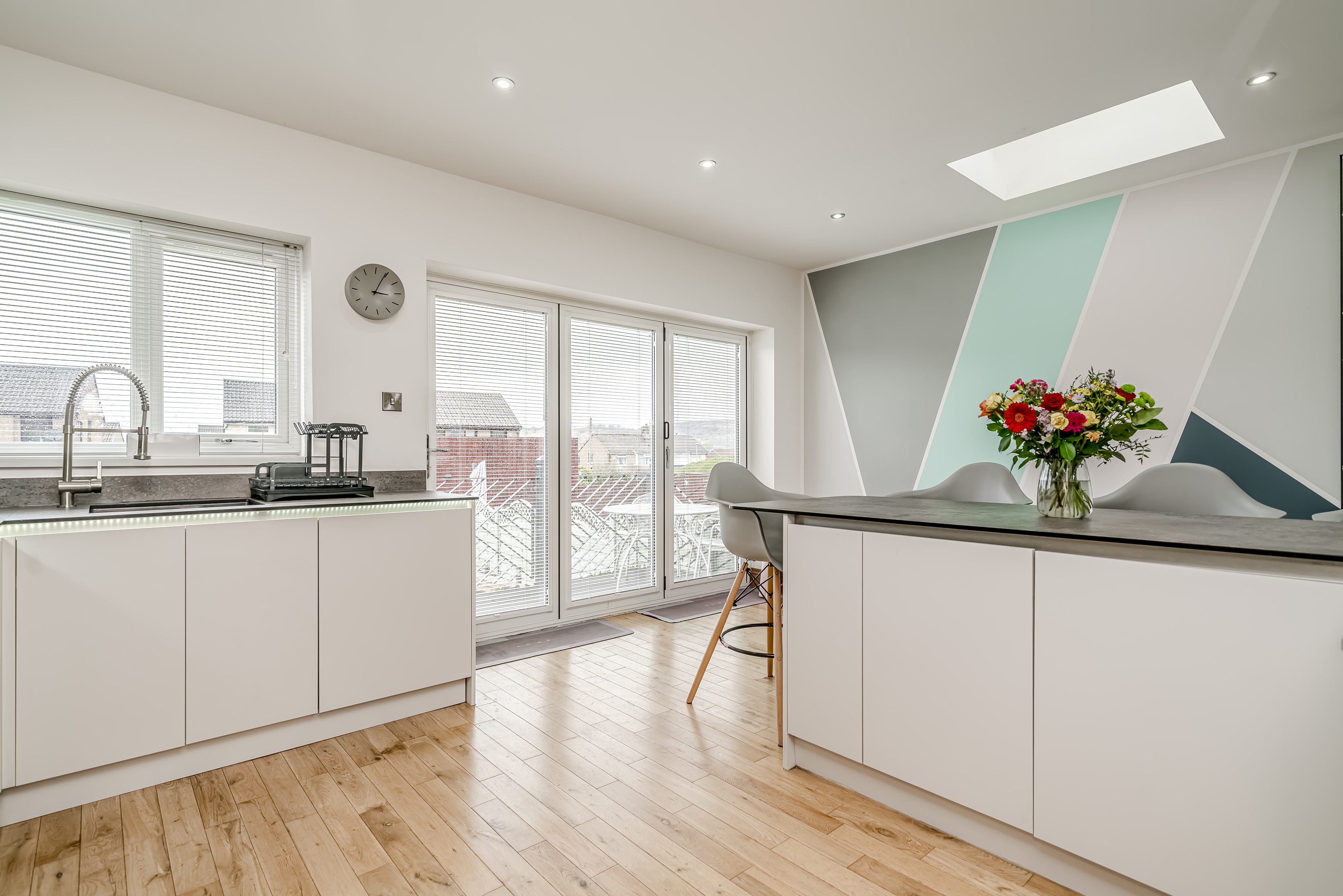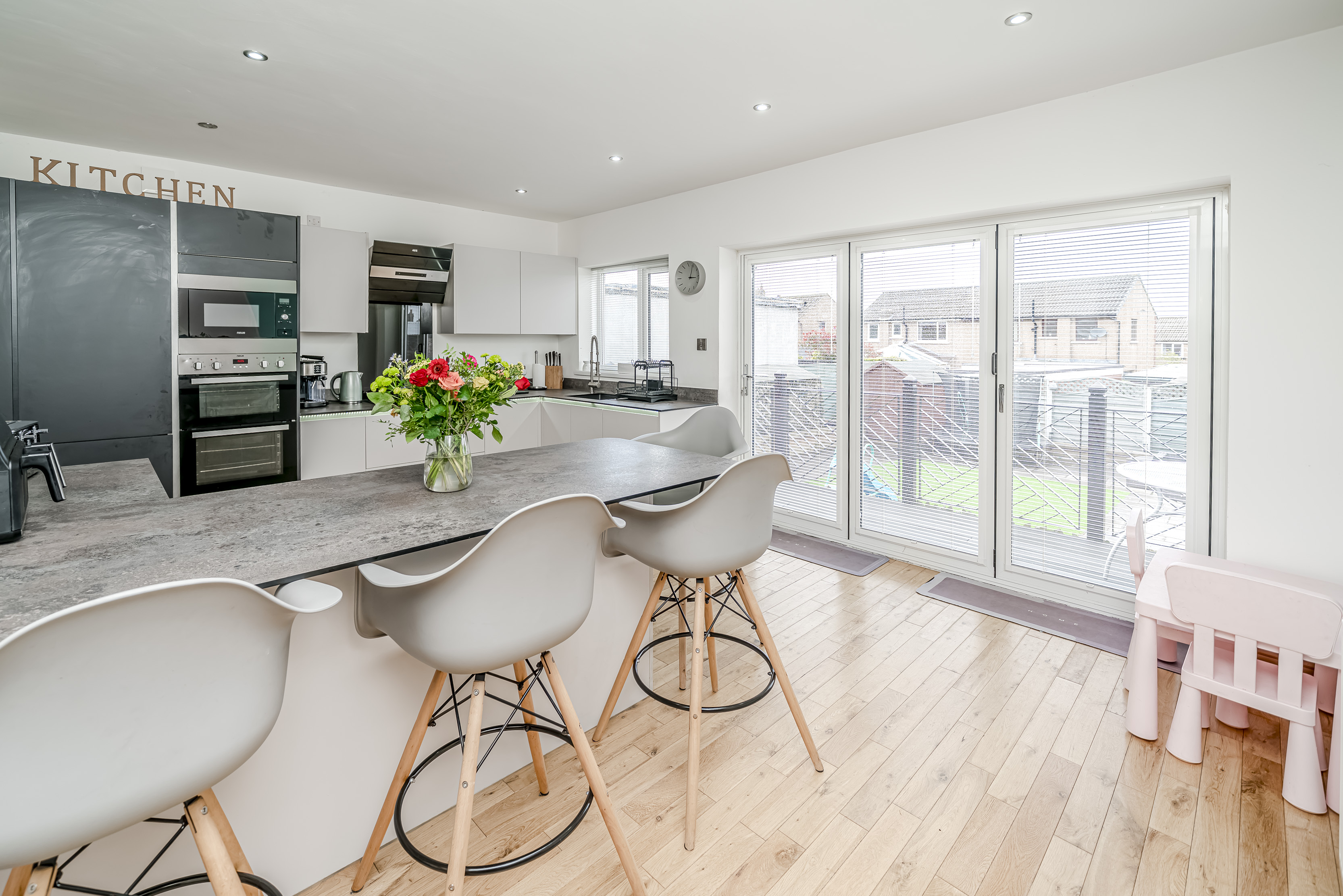 The ground floor is centred around a spacious lounge, a lovely everyday living space with a feature fireplace and large front-facing window drawing in plenty of natural light. To the rear, the home opens into a standout open-plan kitchen dining room, beautifully arranged with sleek contemporary cabinetry, integrated cooking appliances, breakfast seating and ample room for family dining and entertaining. Large glazed doors connect the interior with the raised rear deck, creating an easy flow between inside and out. A separate utility room adds further practicality and valuable additional storage.