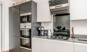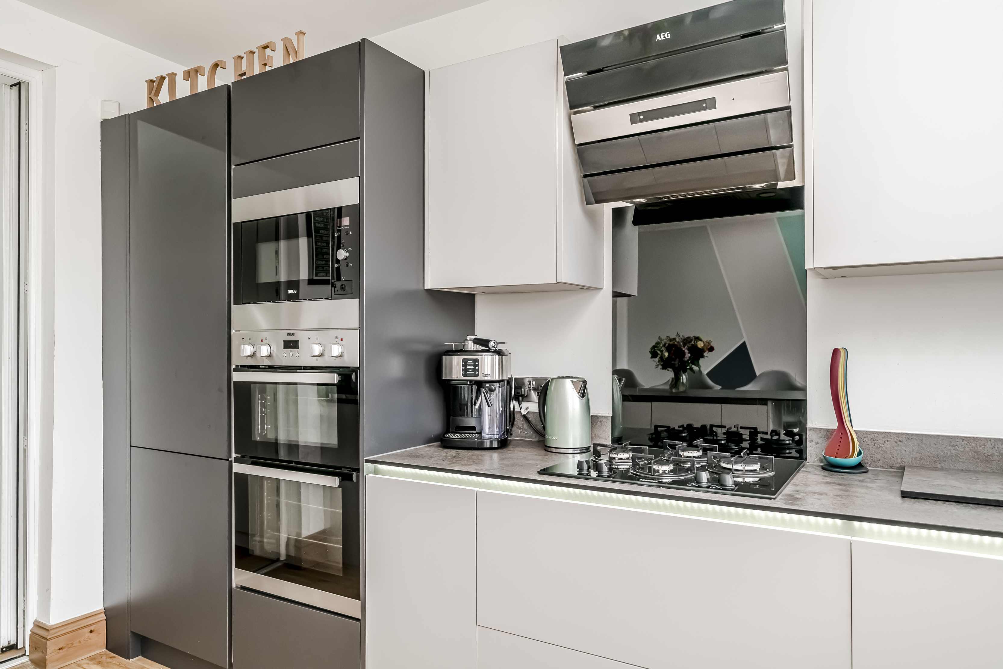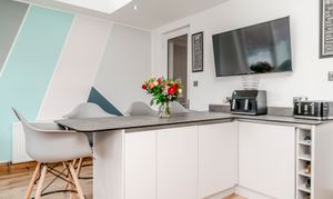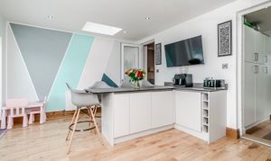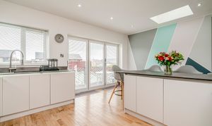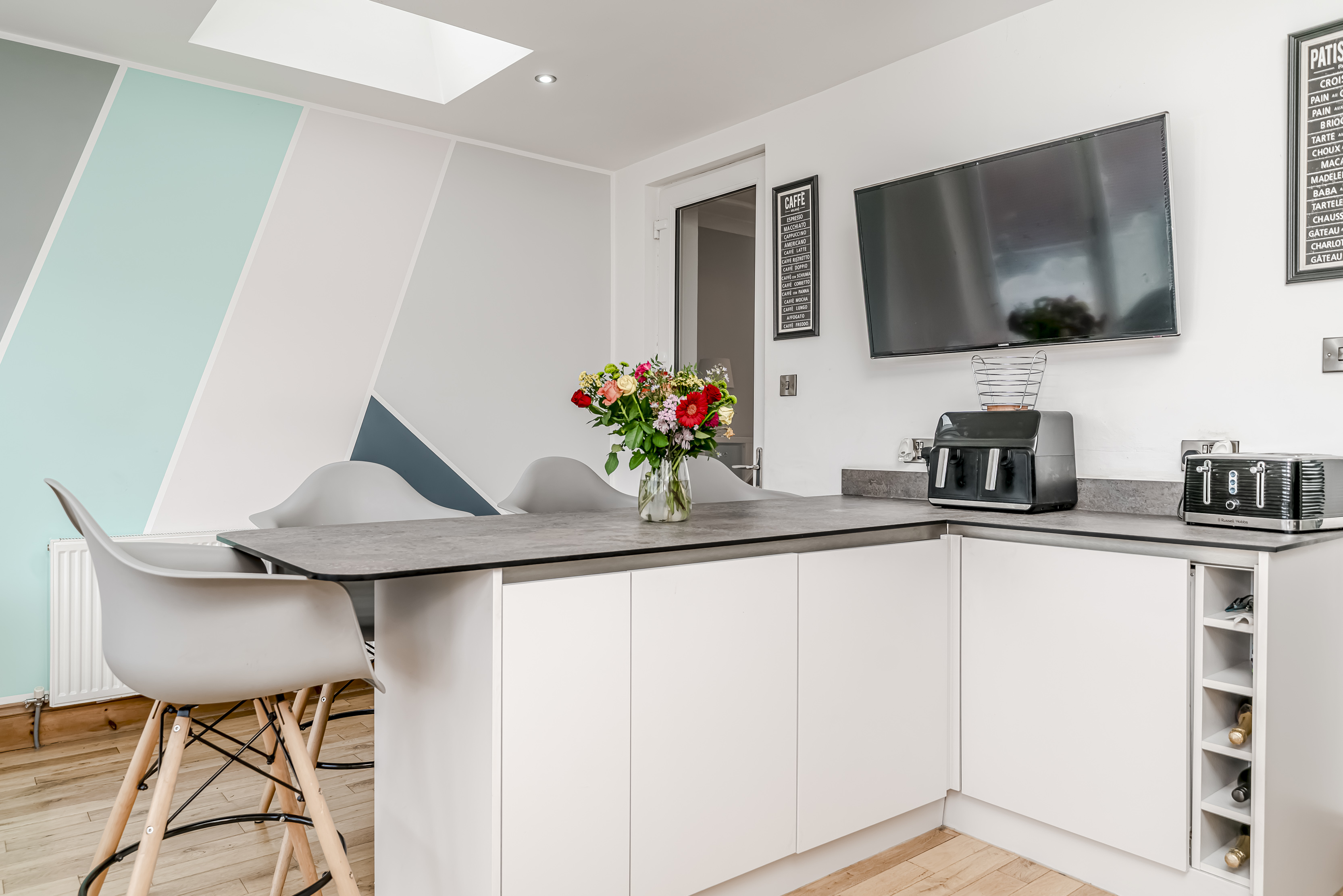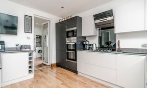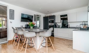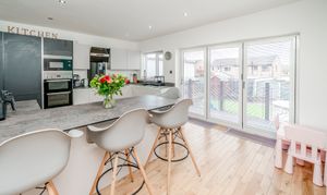 The ground floor is centred around a spacious lounge, a lovely everyday living space with a feature fireplace and large front-facing window drawing in plenty of natural light. To the rear, the home opens into a standout open-plan kitchen dining room, beautifully arranged with sleek contemporary cabinetry, integrated cooking appliances, breakfast seating and ample room for family dining and entertaining. Large glazed doors connect the interior with the raised rear deck, creating an easy flow between inside and out. A separate utility room adds further practicality and valuable additional storage.