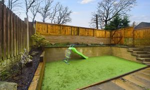To the rear of the property is a south facing artificial lawn, decorative border with border planting areas and a flagged patio.