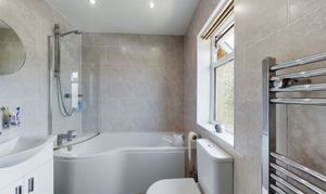 The family bathroom is partially tiled and features a 3-piece suite, which includes a panelled bath, a low level W.C., a pedestal hand basin, and a shower over the bath. Additionally, this bathroom offers the convenience of gas central heating and double glazing.