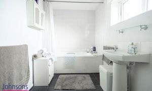 - Family bathroom with a white suite, comprising bath with shower over, basin and W.C.