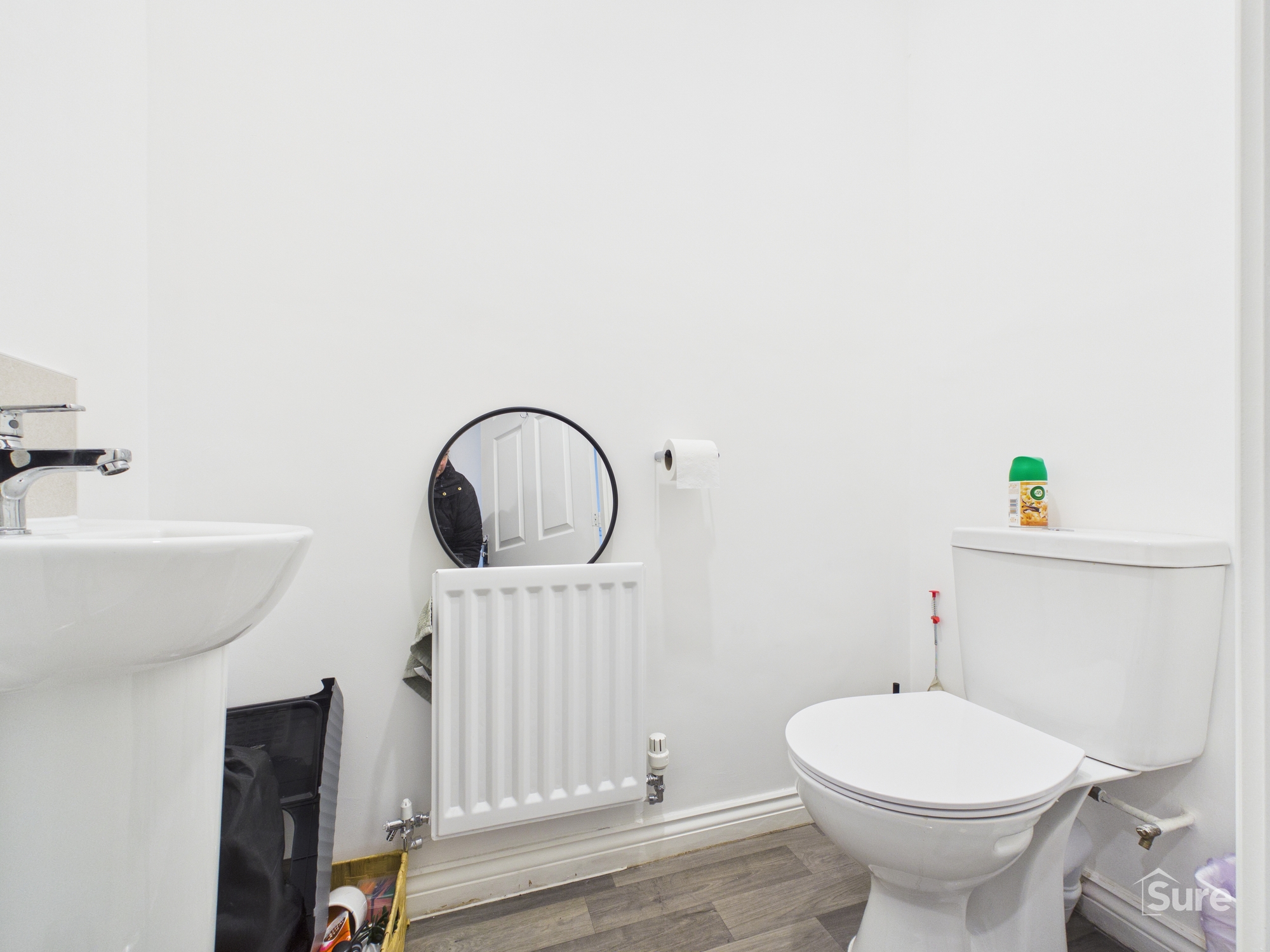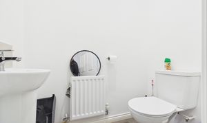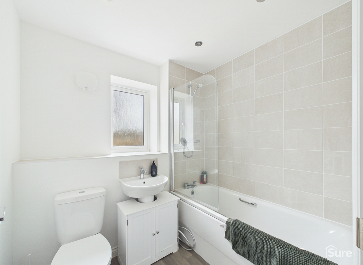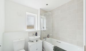 Window to rear. Having a three piece suite comprising of bath with shower over, pedestal wash hand basin with storage cupboard under. Low level WC. Heated towel rail.