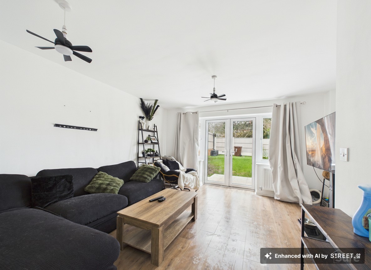 French doors leading out onto the rear patio area. Laminate flooring. Under stairs storage cupboard. Two radiators.
