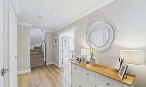 Spacious and modern, this fabulous entrance hall benefits from neutral decor, oak effect flooring, a coat cupboard and space for a large sideboard.
