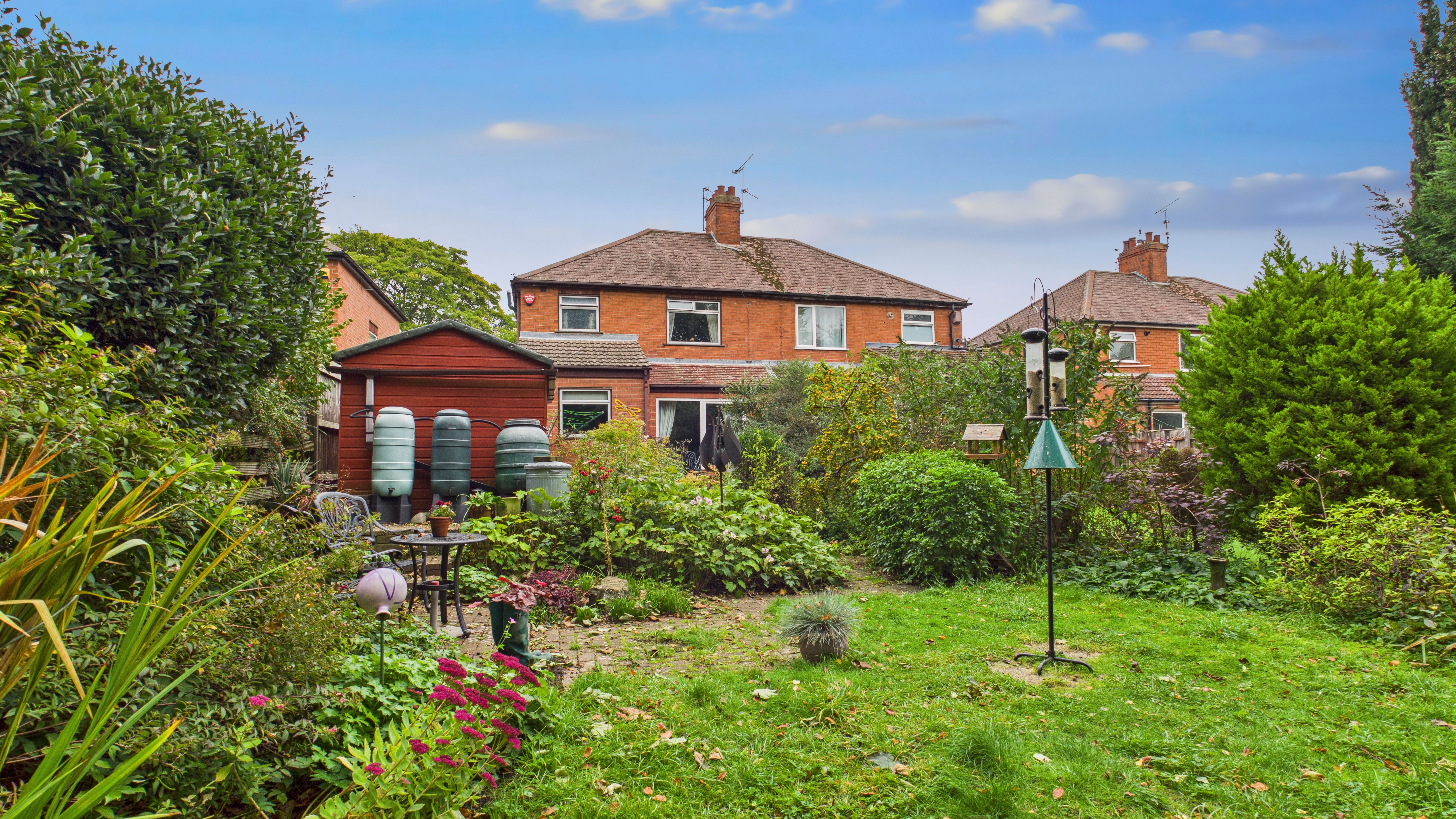 Externally, the rear garden is mostly mature plants and shrubs, with lawn, creating a private and peaceful outdoor space. The private driveway provides off-road parking and easy access to the side and garden.