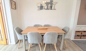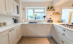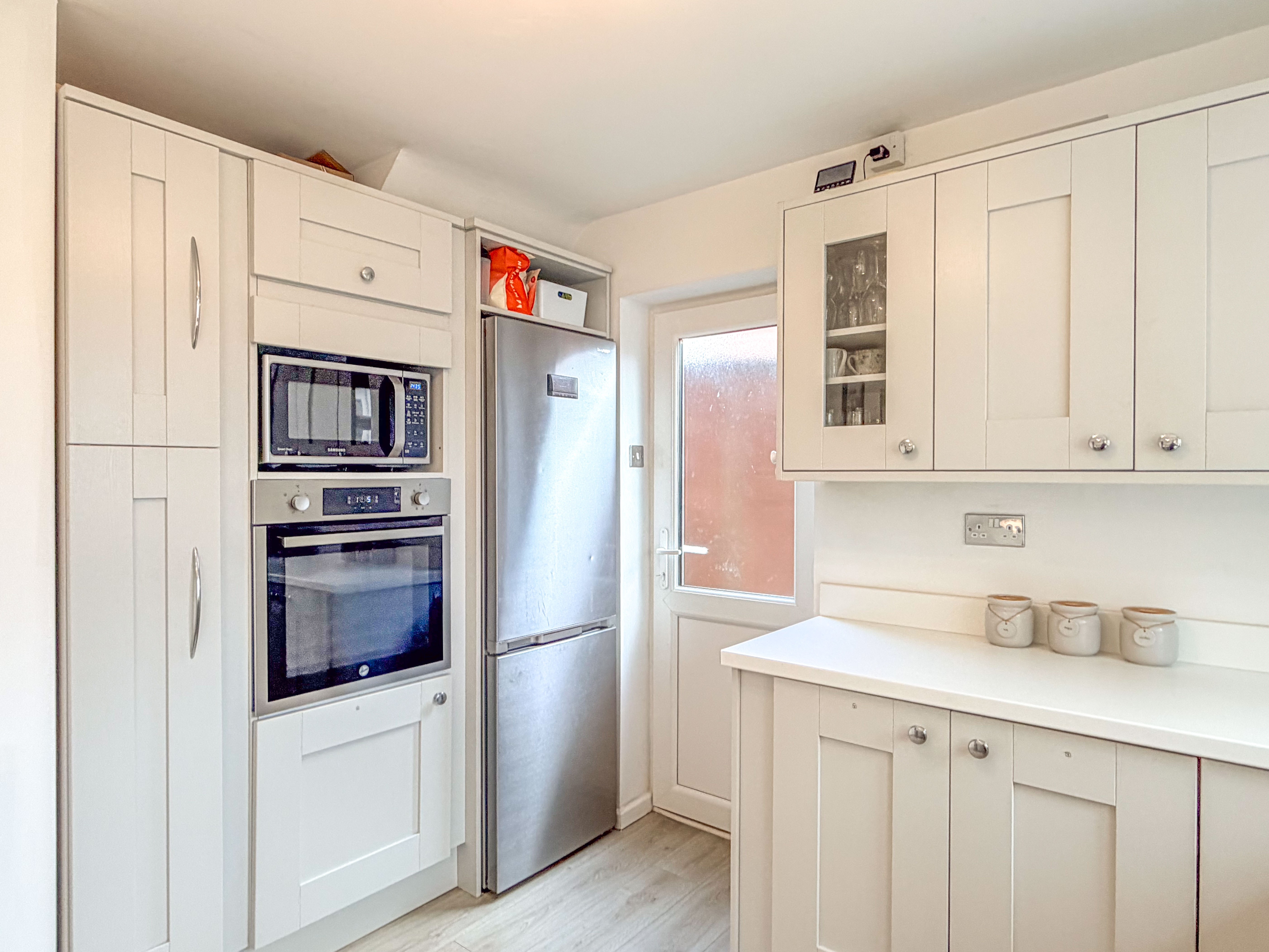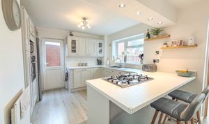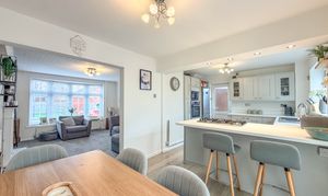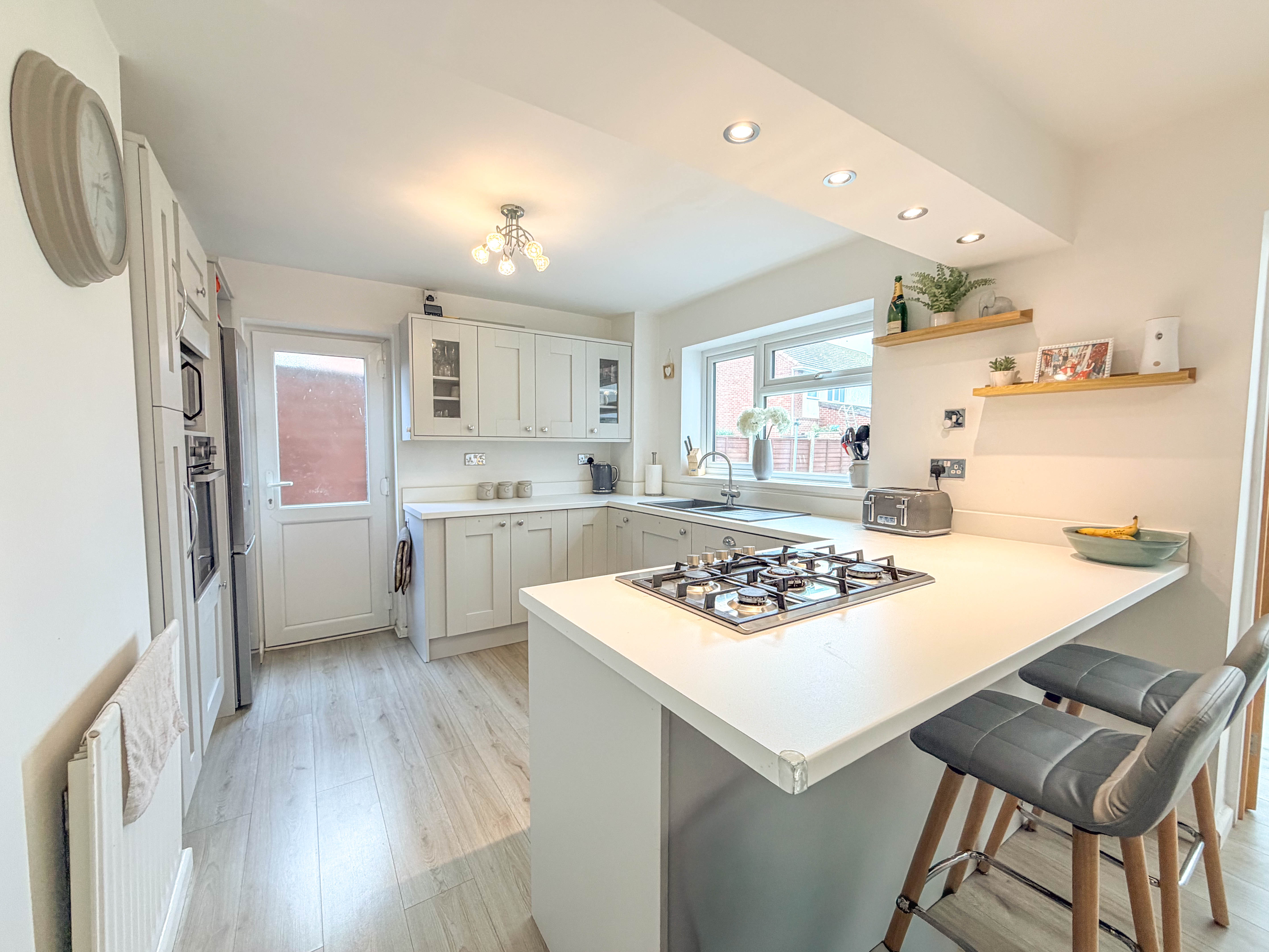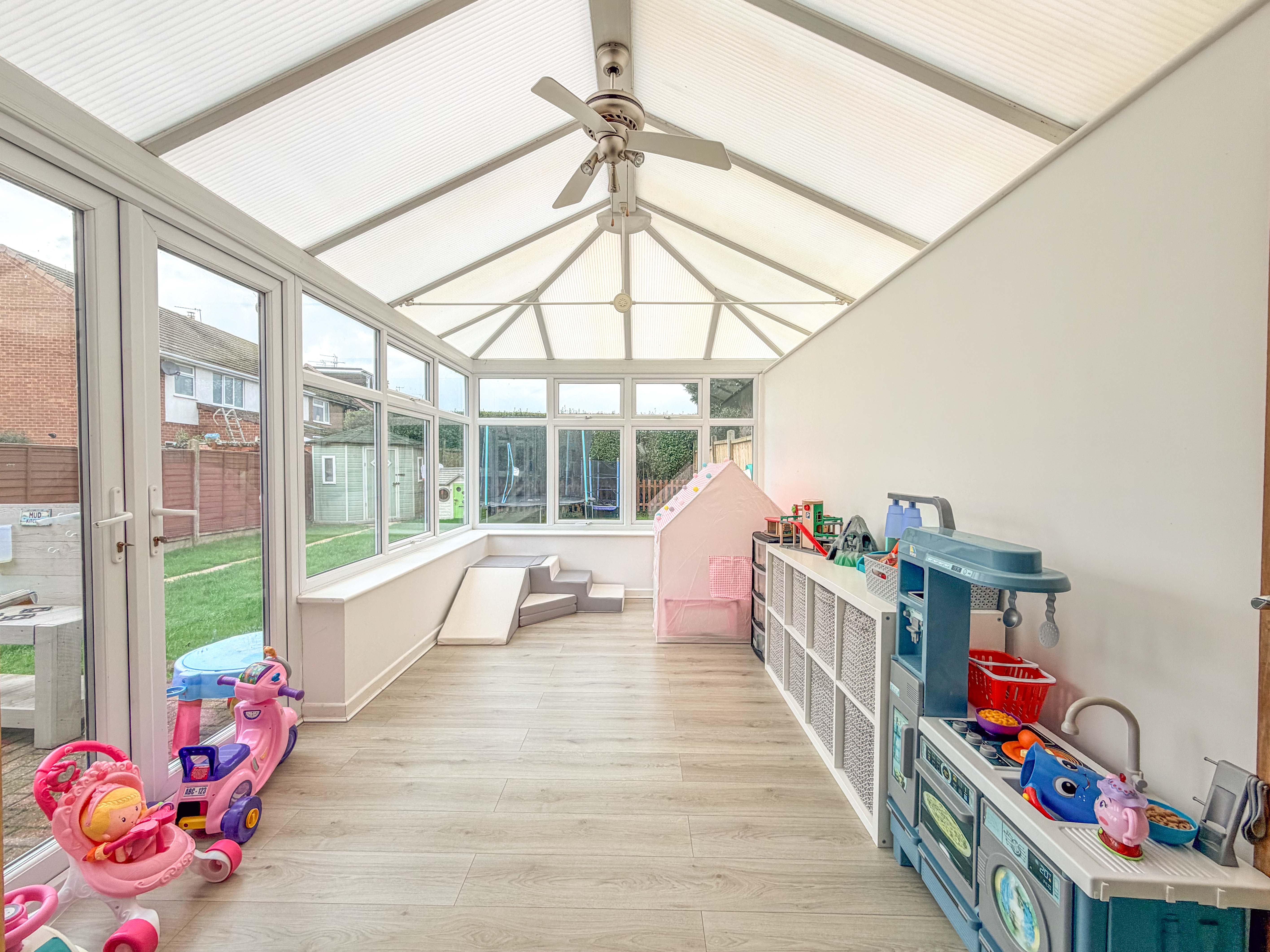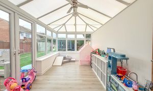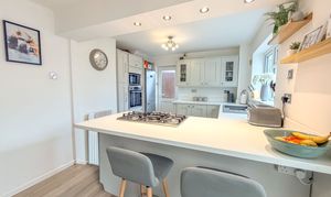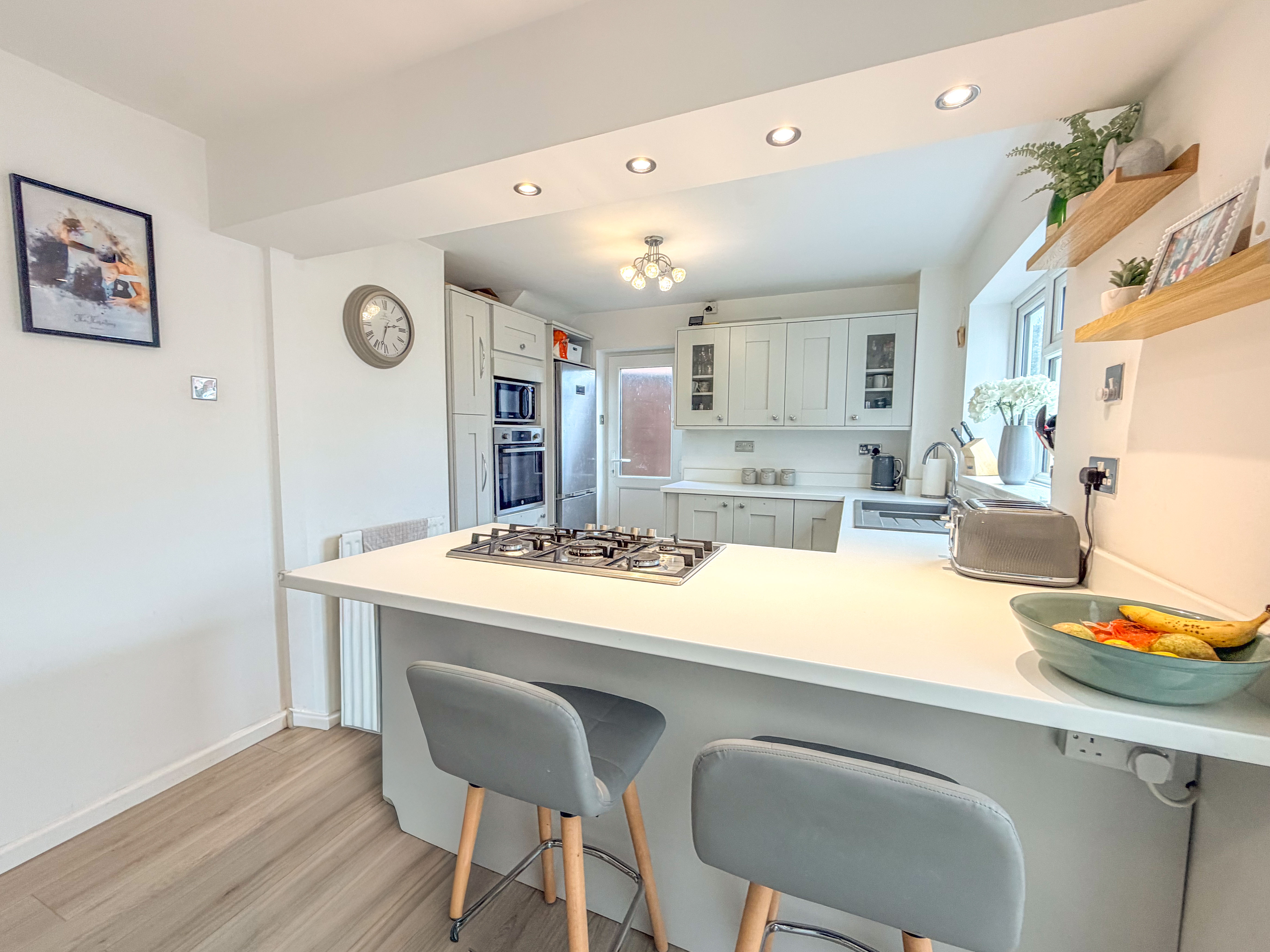 Flowing from here is the true showpiece of the home: a stunning open-plan kitchen/diner, recently refitted in a stylish shaker-style range of units, complemented by quality work surfaces and a peninsular breakfast bar. This impressive space effortlessly combines practicality with contemporary design, offering ample room for family dining as well as entertaining guests. Double doors open into the spacious conservatory, a versatile addition that enhances the ground floor living space and provides a seamless connection to the garden — perfect for modern family life.