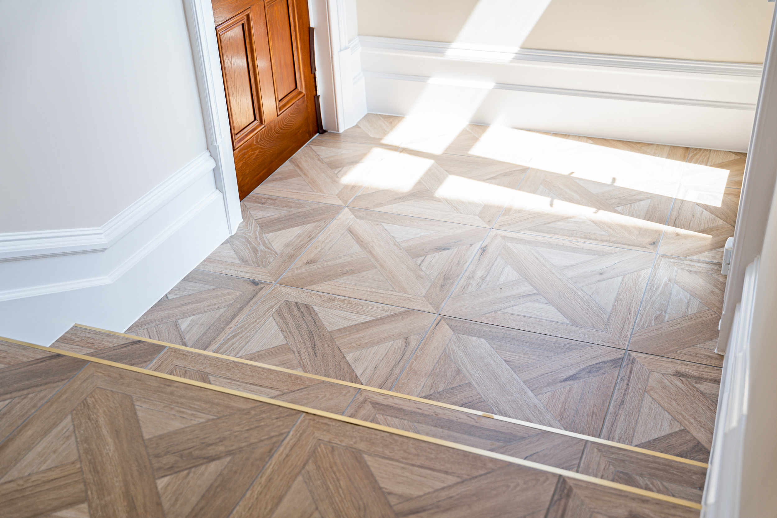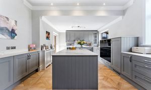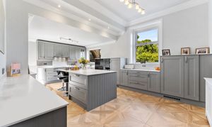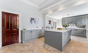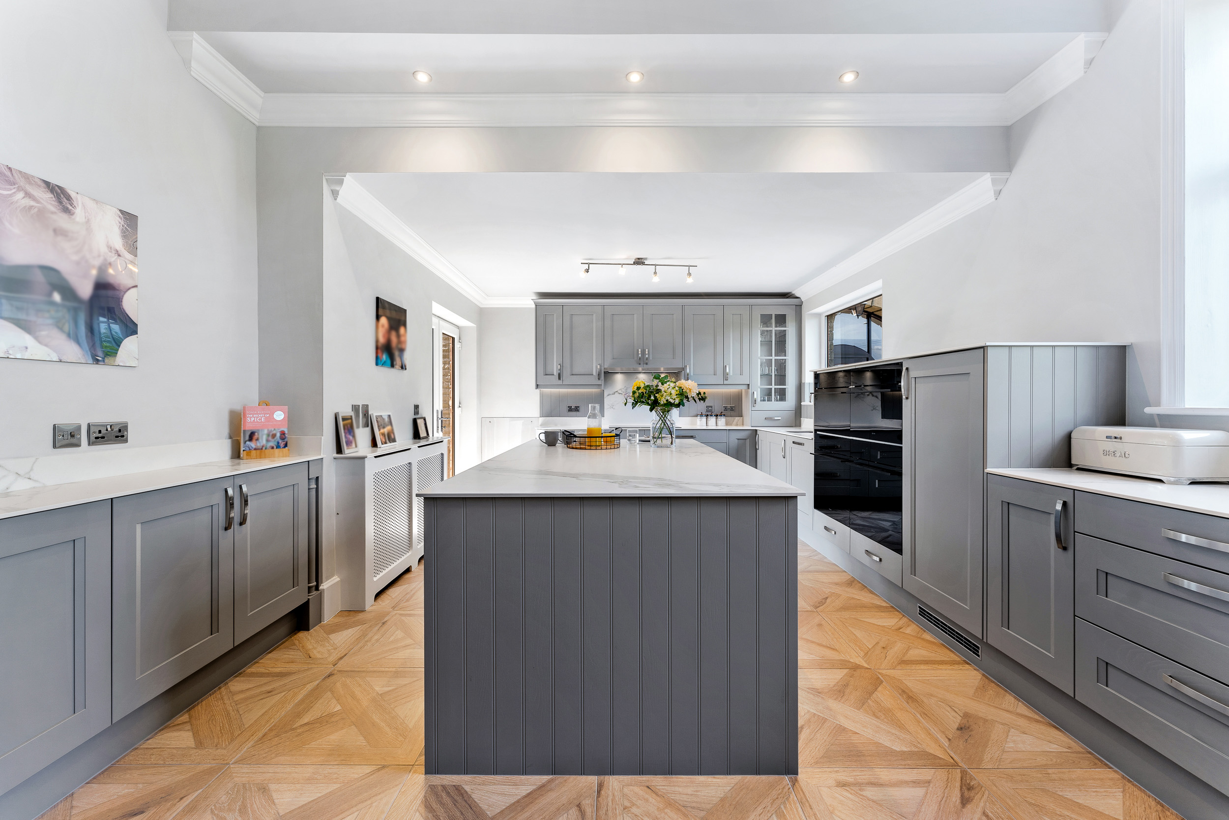 Continue now in the hub of the house – a high-end dining kitchen finished with a huge range of grey shaker-style cabinets topped with white marble tops and a matching central island and breakfast bar. The beautiful French Weave seen in the hallway seamlessly ties into the subtle yet sophisticated aesthetic and is also very practical for busy family life.