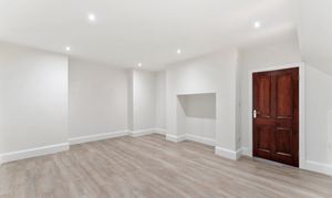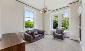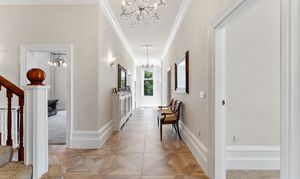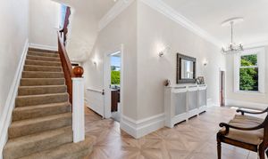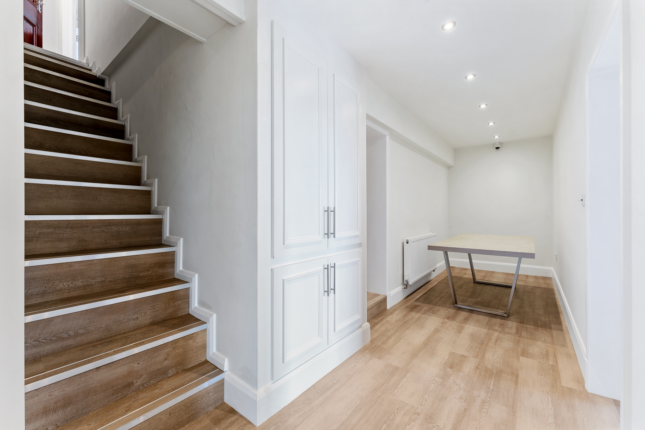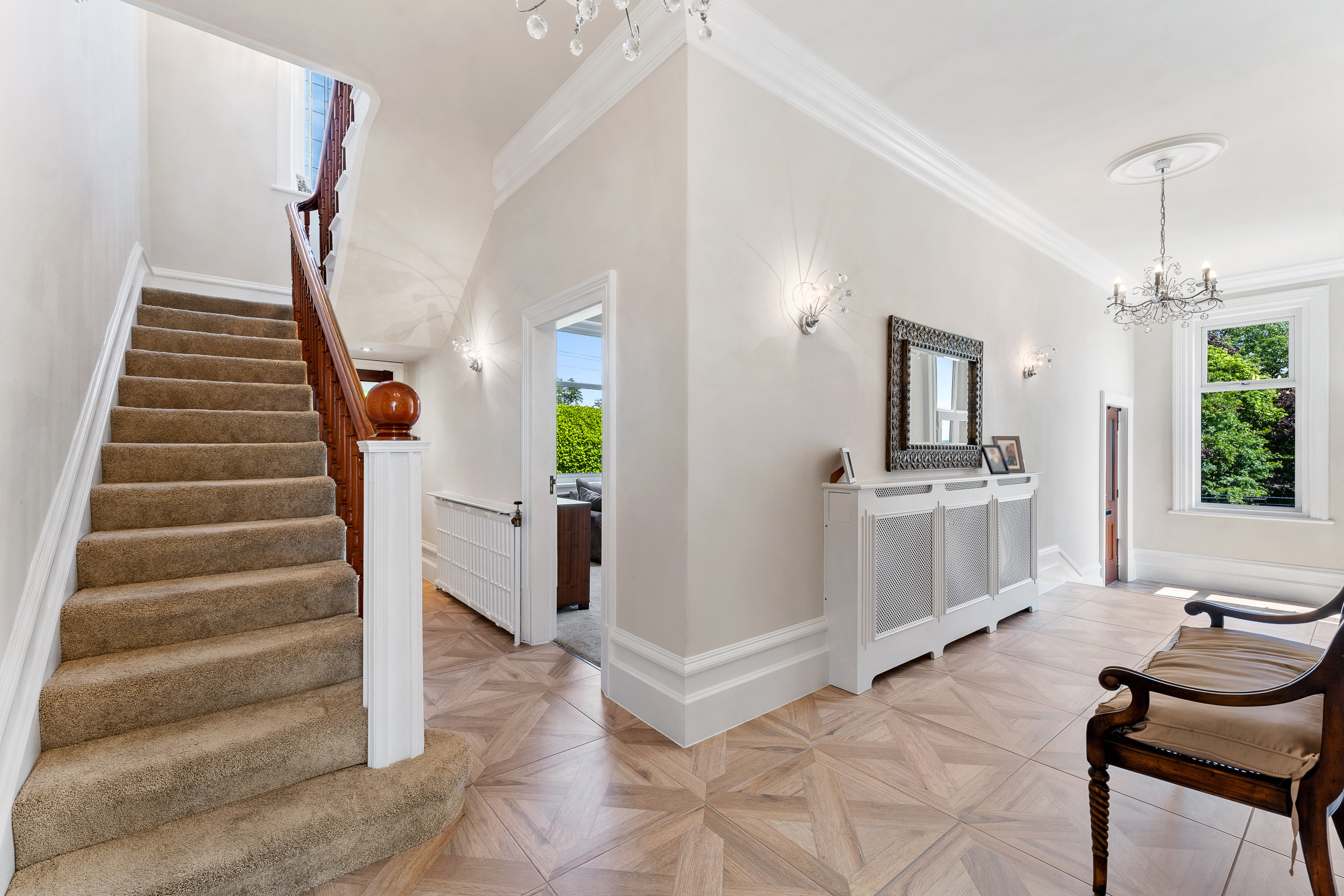 A white panelled staircase and covered radiators blend neatly with the light-toned walls, new skirtings, and high ceilings, enhanced with delicate coving and rose-crowned chandeliers – features that continue into three cream-carpeted reception rooms warmed by panelled radiators, creating understated elegance throughout the ground floor.