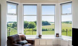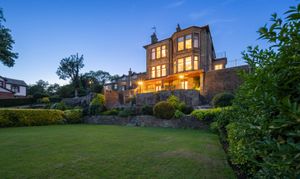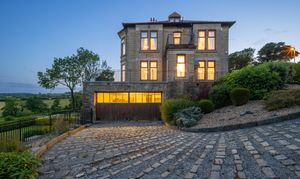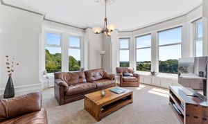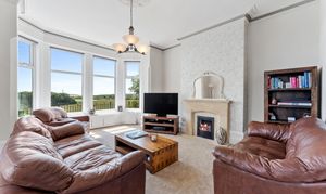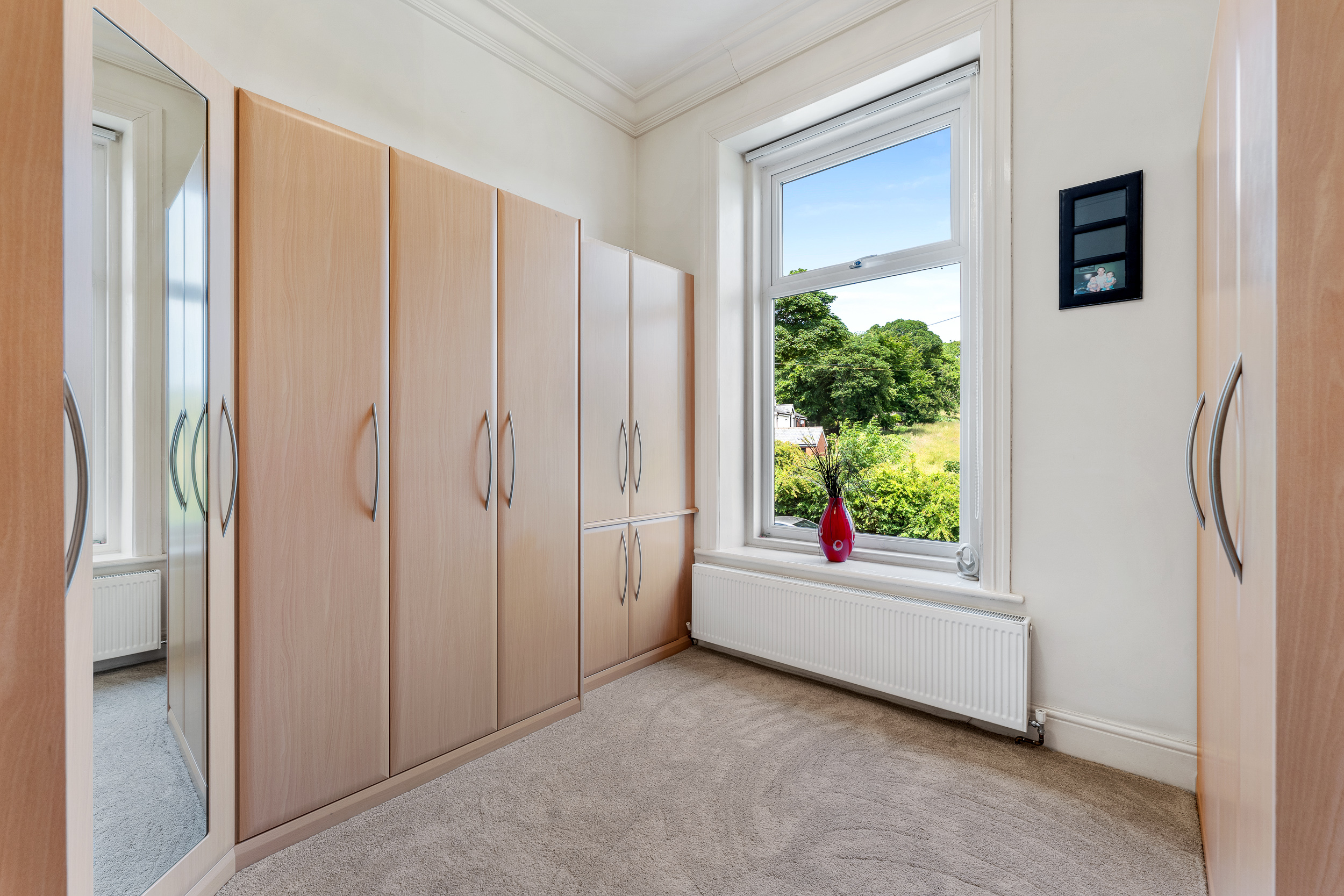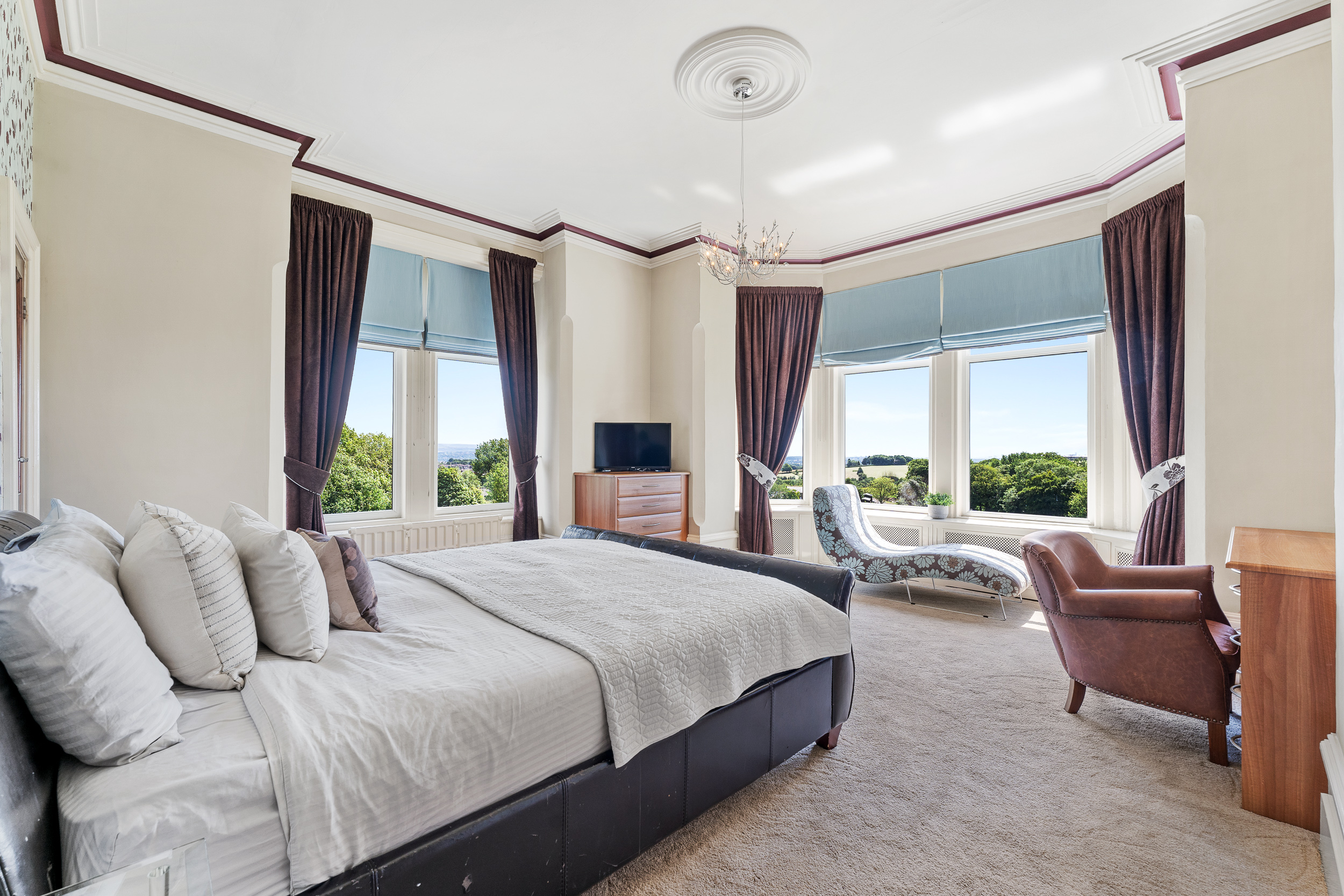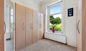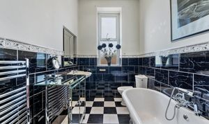 Bedrooms two and three both feature bay windows to maximise the spectacular scenery and plenty of fitted storage, while the fifth bedroom is currently serving as a fully fitted dressing room. These generous doubles share a family bathroom, where black-and-white marble-effect tiling offsets a double-ended roll-top bath, with traditional tapware and shower attachment , and coordinating sanitaryware. This opulent space is warmed by a heated towel rail, like the adjoining stone-tiled walk-in shower room.