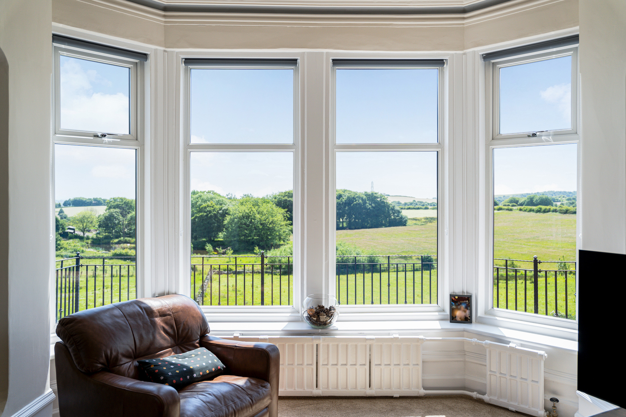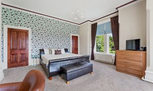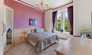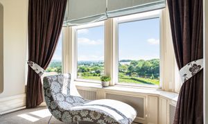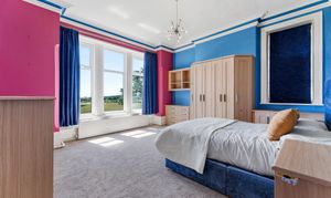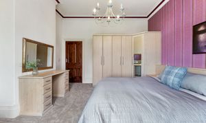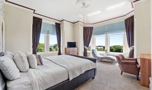 The master bedroom is a luxurious and serene retreat, designed to make the most of its elevated setting. Broad dual-aspect bay windows frame breathtaking rolling countryside views, dressed with elegant grey Roman blinds that soften the light and enhance the room’s classy feel. A high, coved ceiling, crowned by a decorative rose and chandelier, adds a sense of grandeur, while a covered radiator ensures comfort without interrupting the design scheme.